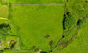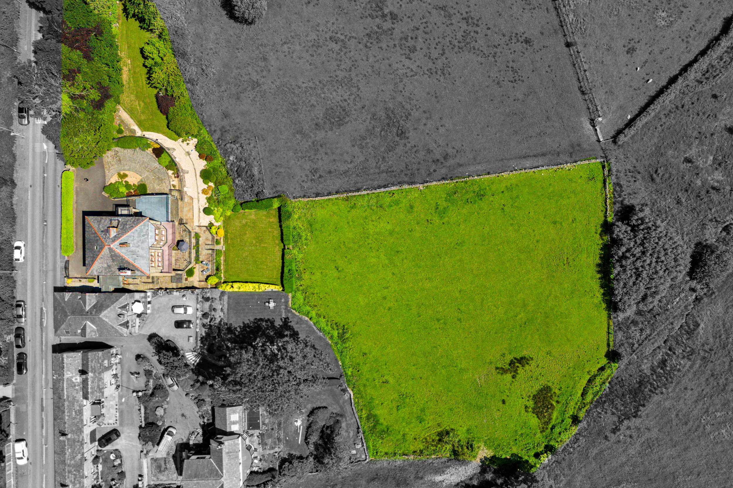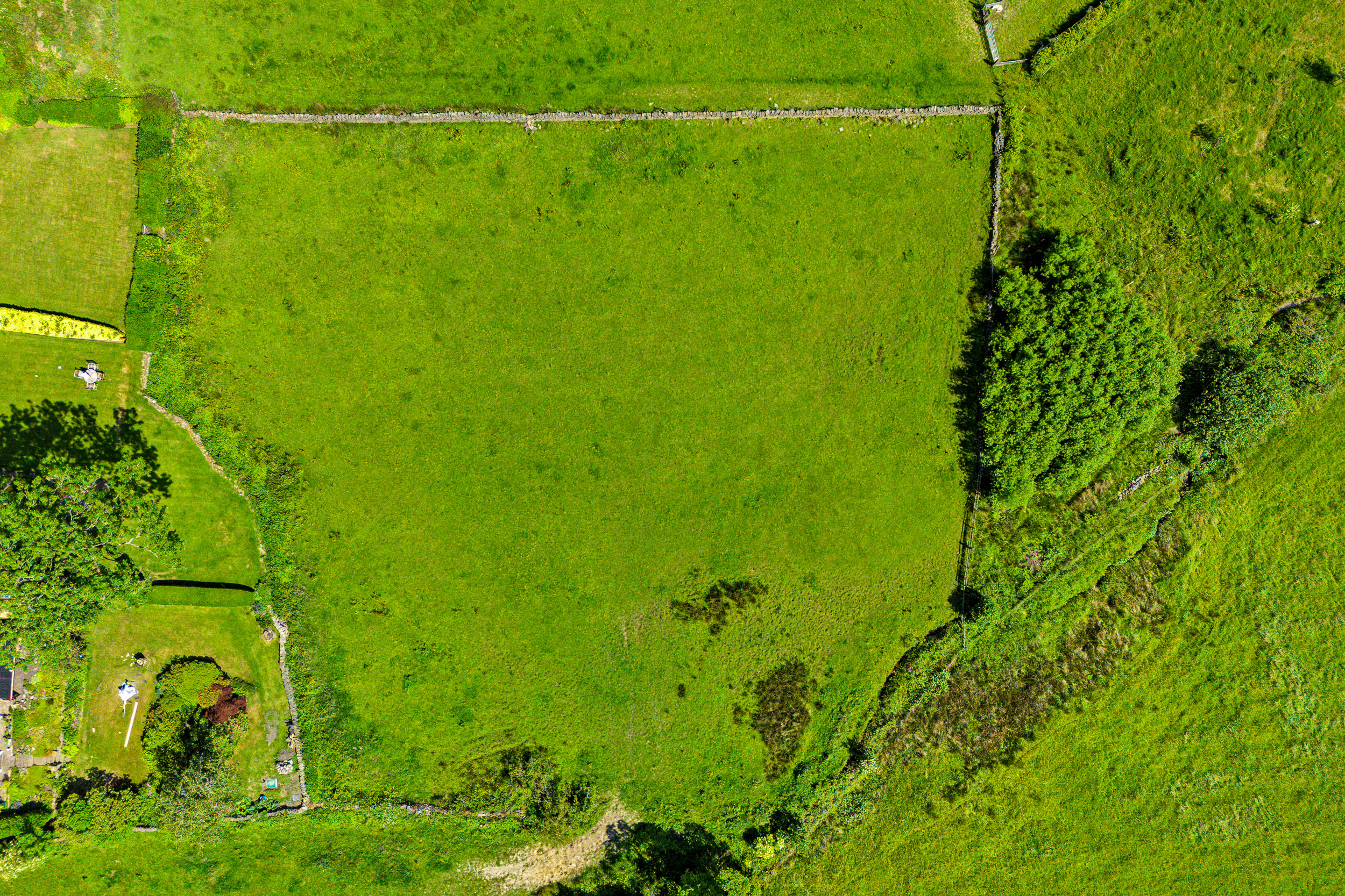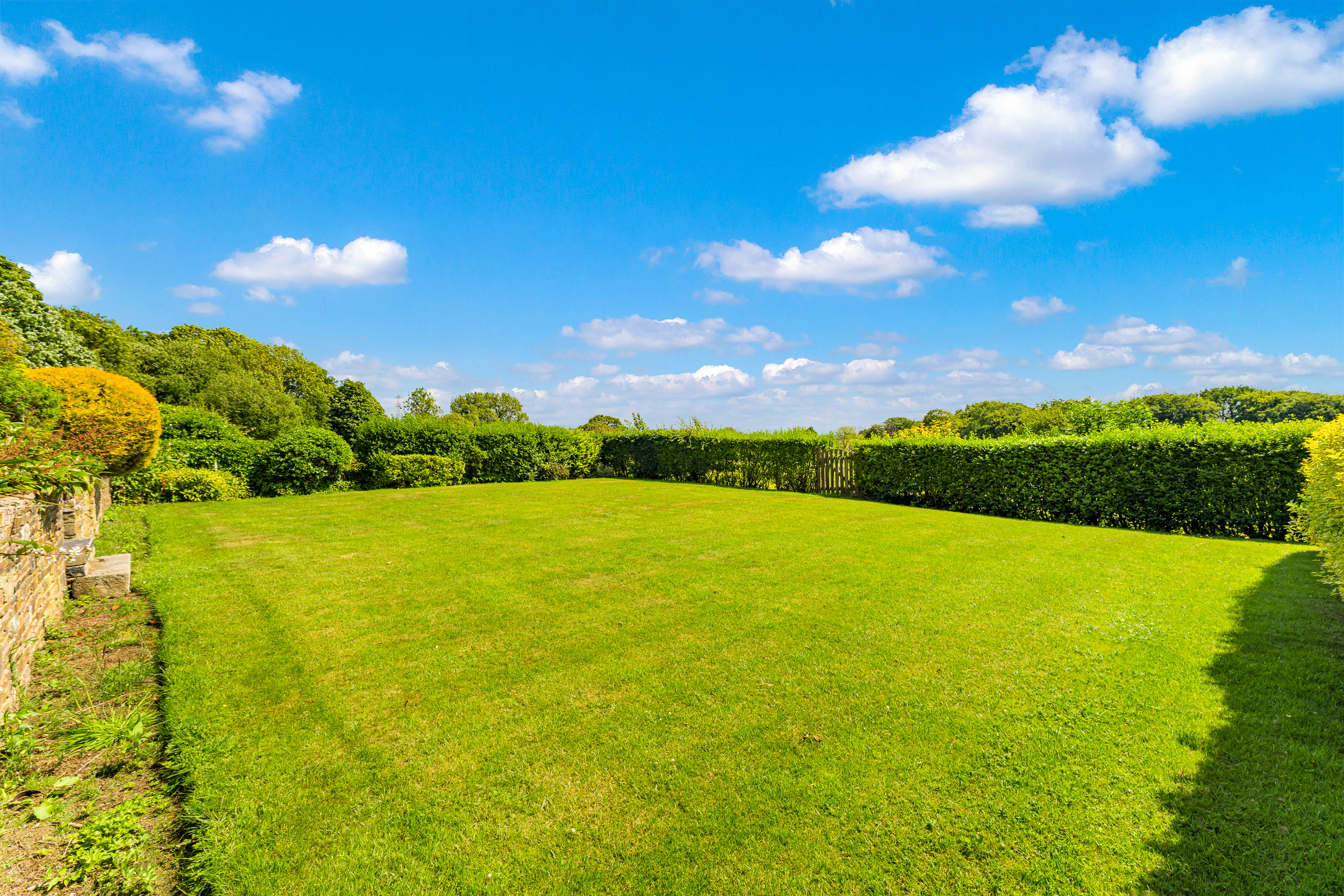 Below, a sizeable lawn invites children to play freely, while a large side lawn offers additional space for relaxation or recreation. Beyond the main garden, gated access leads to a vast, open field – perfect for everything from summer gatherings to wildflower planting or simply enjoying the peace of the surrounding countryside. The entire plot is beautifully enclosed by well-kept hedging, established shrubs, and mature trees, creating a sense of seclusion and serenity while still allowing for panoramic views.