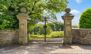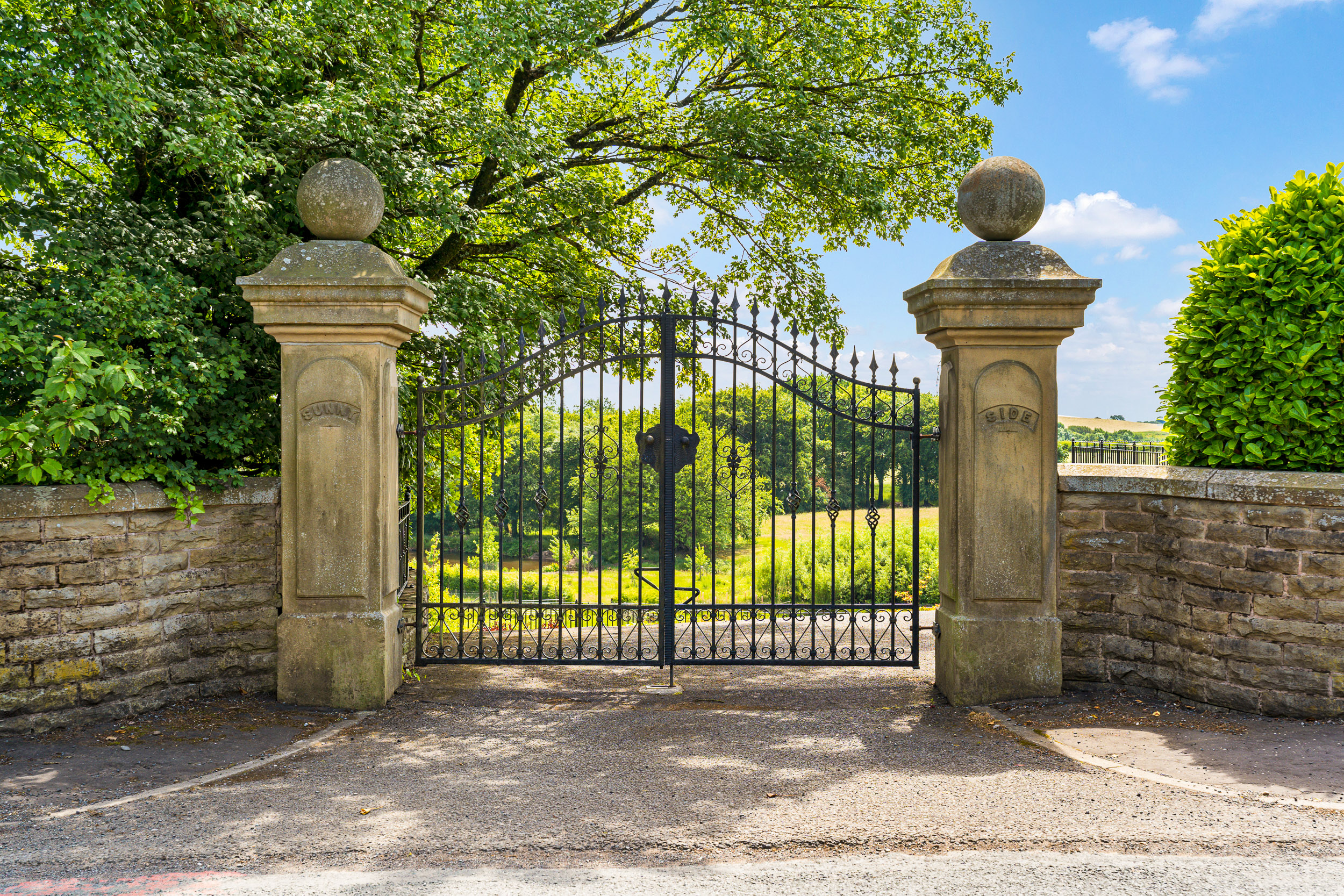 - Gated entrance with sweeping driveway, extensive parking, and double garage