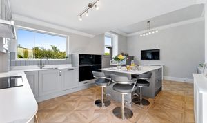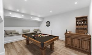Natural light floods the room through a set of French doors, which open onto a balcony overlooking the garden, creating a bright and pleasant environment for everyday tasks. Explore further to discover a useful store room, a large games space, office or gym, and a TV or cinema room with double doors onto the garden balcony and easy access to the garage.