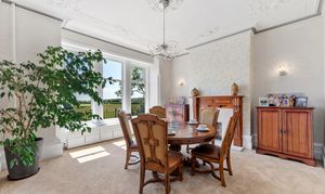 Two further reception rooms offer fabulous country views from beautiful bay windows at the back of the house. The dual-aspect main lounge centres around an electric fireplace with a classic stone surround, while the formal dining room boasts an ornately decorated ceiling to set the scene for family festivities and dinner parties.
