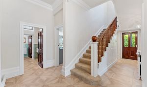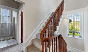 Lit by a tall decorative window, a half-landing staircase with a gorgeous wooden bannister connects the impressive main hallway to the first floor. The soft cream carpet flows from the landing into all four double bedrooms, each beautifully decorated with warm, neutral tones.