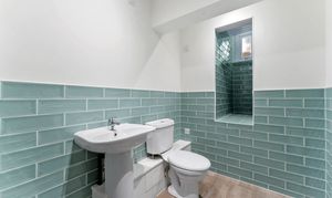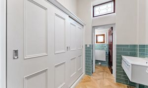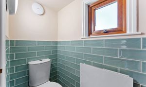 Follow the gorgeous French Weave flooring into the boot room to find ample storage for coats and shoes in a built-in cupboard with sliding doors. The metro-tiled splashback surrounds a stylish mounted basin unit before flowing into a convenient lavatory.