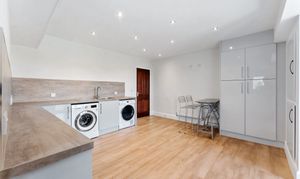 The laundry room is impressively spacious – large enough to function as a second kitchen if you plan to convert the lower floor into a self-contained annexe. Generous built-in storage and extensive work surfaces make it exceptionally practical, with space for two laundry appliances beneath the sink.