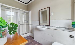 The en suite is sleek and contemporary, with spotlights, smart two-tone tiling, and a fitted vanity unit that incorporates both the basin and concealed cistern toilet. A generous rainfall shower enclosure, featuring twin heads and fittings, allows for dual showering to speed up the morning routine. From here, a door opens to an east-facing balcony – an idyllic spot to enjoy a quiet coffee while watching the sunrise or an evening tipple.