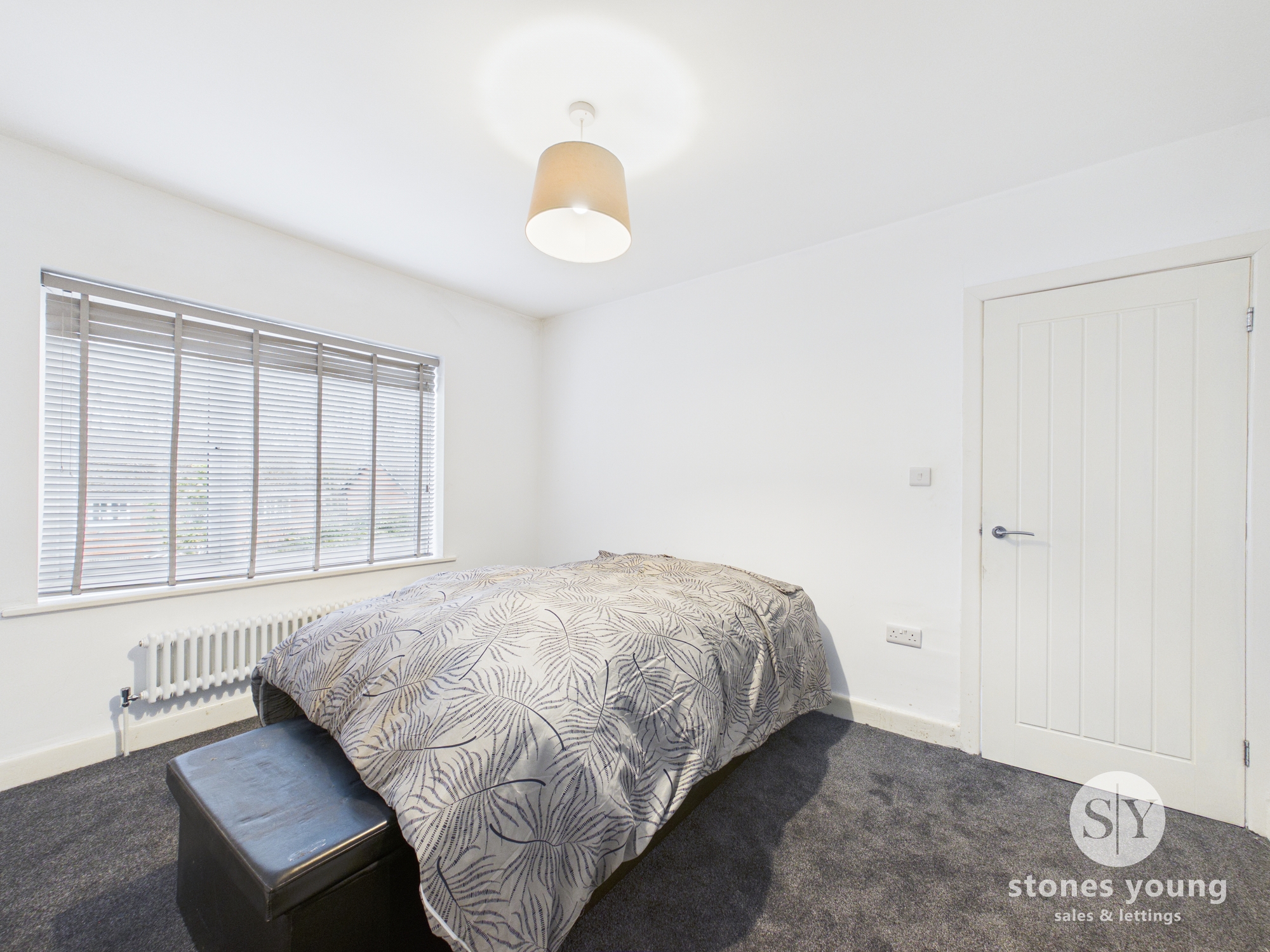 Single bedroom with carpet flooring, double glazed uPVC window, column radiator.