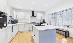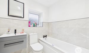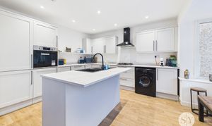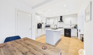 The huge selling point for this property is the kitchen diner which is equipped with sleek grey shaker style kitchen units, a central island with an integrated sink, and a full suite of integrated appliances such as fridge freezer, dishwasher, oven and hob. Wood effect flooring and plenty of natural light create a warm, inviting atmosphere, while the adjacent dining area is perfect for family meals or lively gatherings. The modern bathroom suite is a luxurious haven, featuring a stylish wall-mounted vanity unit, elegant large tiles, a spacious walk-in shower with rainfall showerhead, and high-end fixtures.