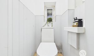 Vinyl flooring, two piece in white comprising of wc and basin, frosted double glazed uPVC window.