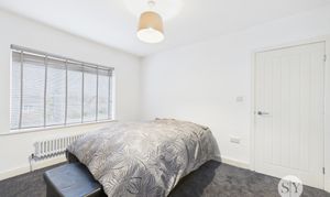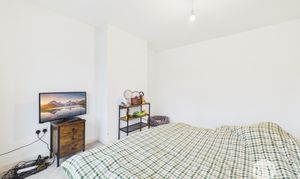 Double bedroom with carpet flooring, double glazed uPVC window, column radiator.