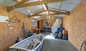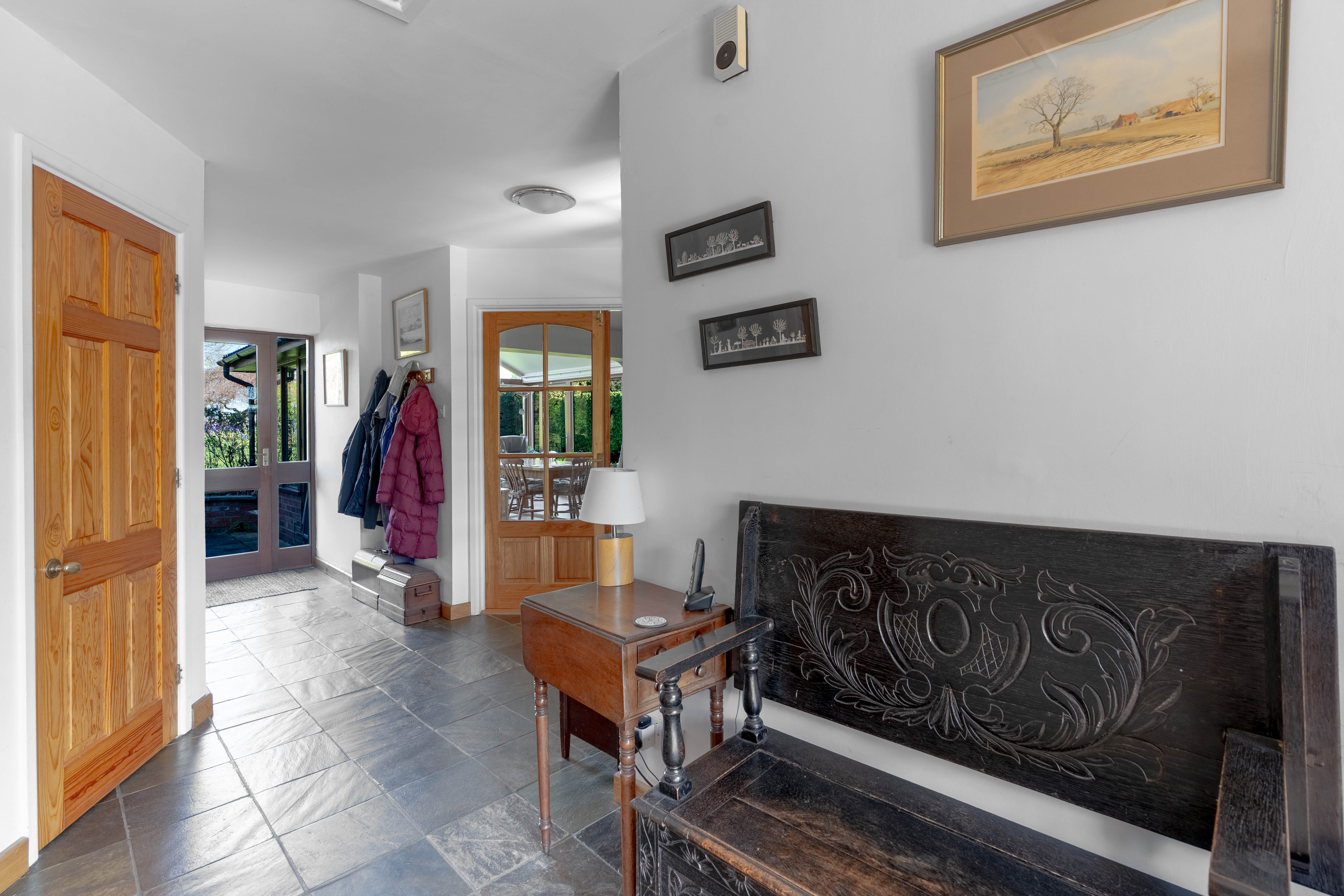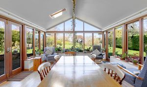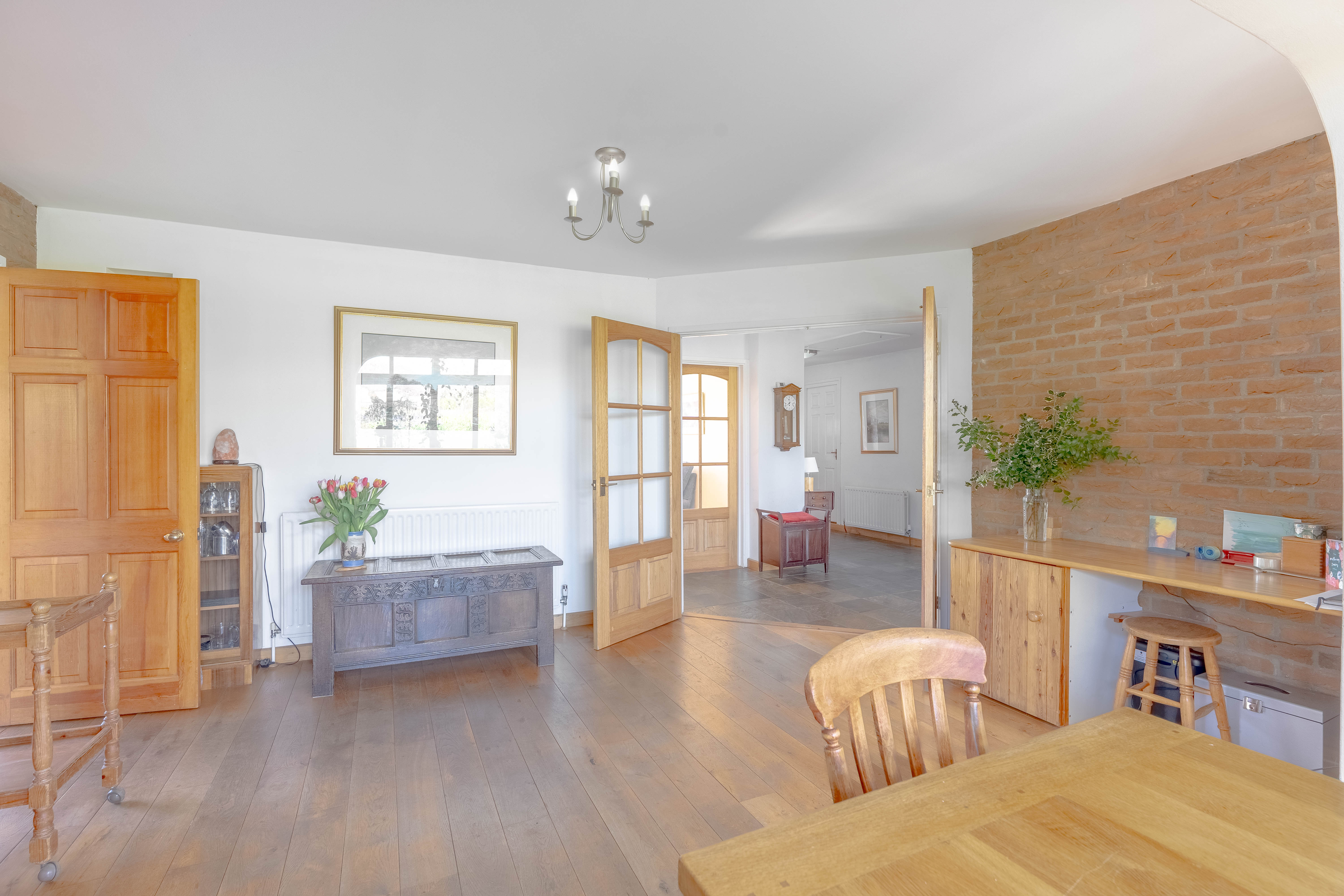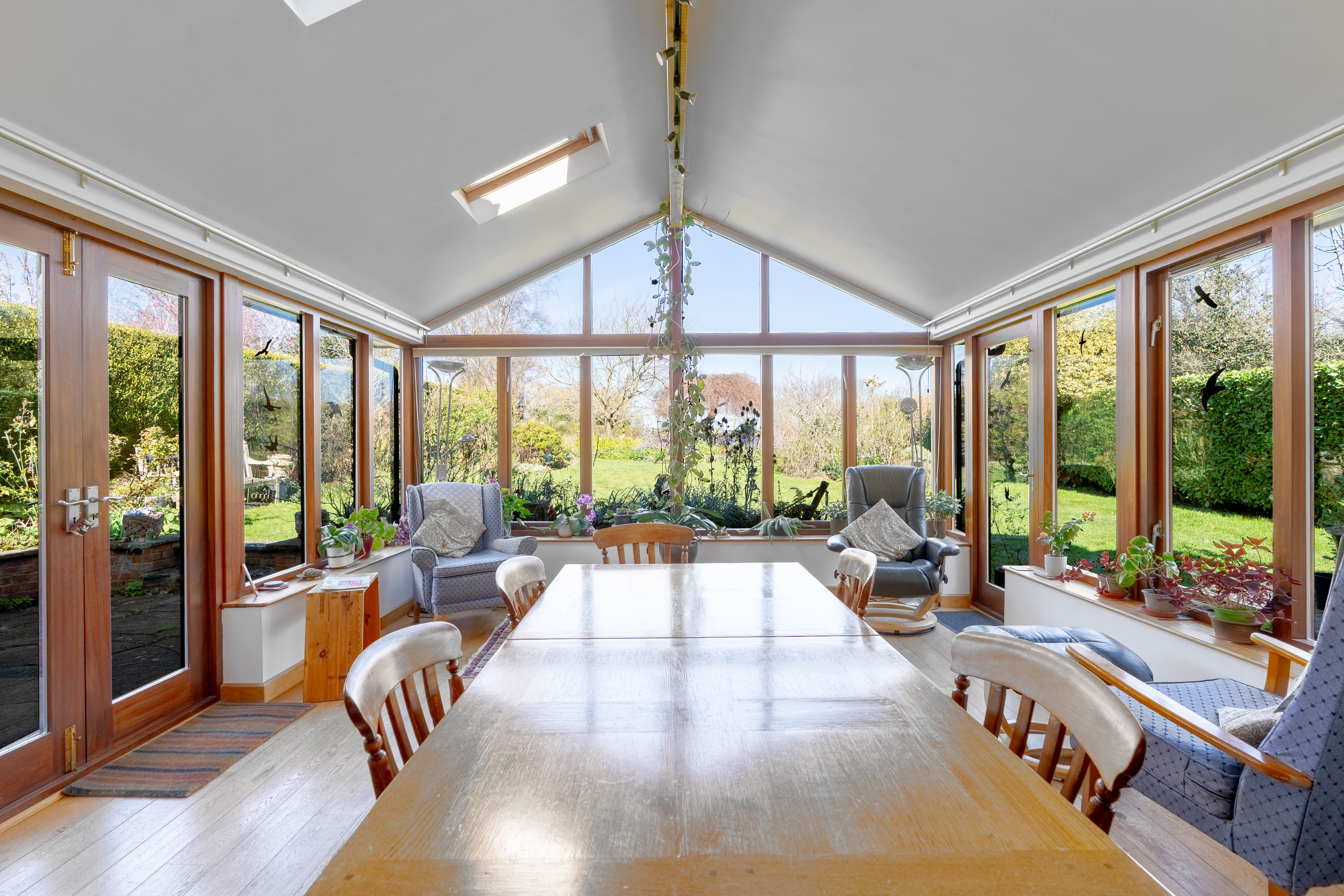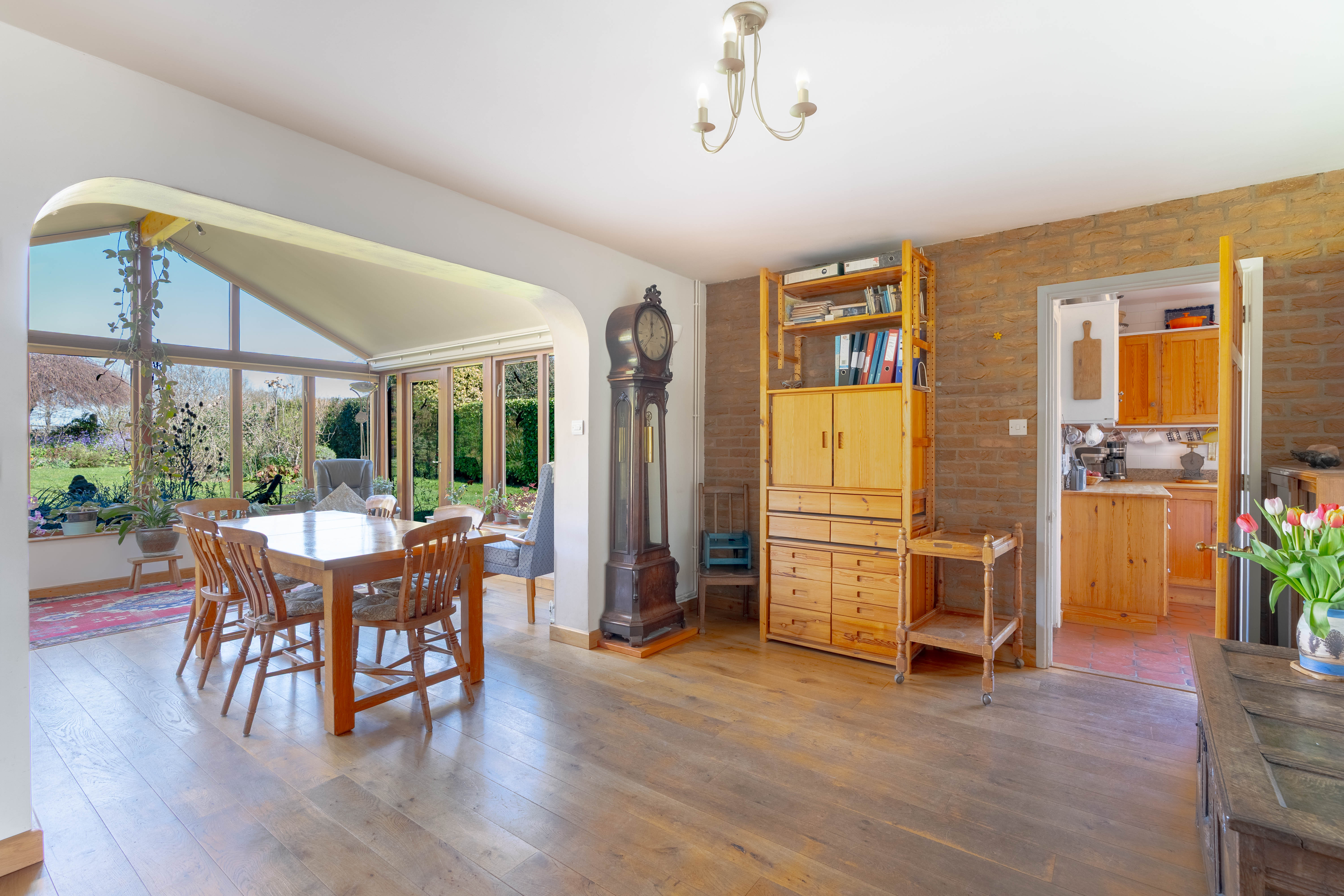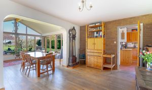 Continuing through, the kitchen offers ample space and is complemented by a useful utility/boot room with direct access to the garden. From the kitchen, you enter the sizeable dining room, which in turn opens into an impressive garden room. Flooded with natural light from Velux windows and large glazing, this space provides stunning views over the extensive grounds and is ideal for entertaining or relaxing.