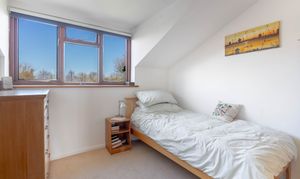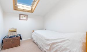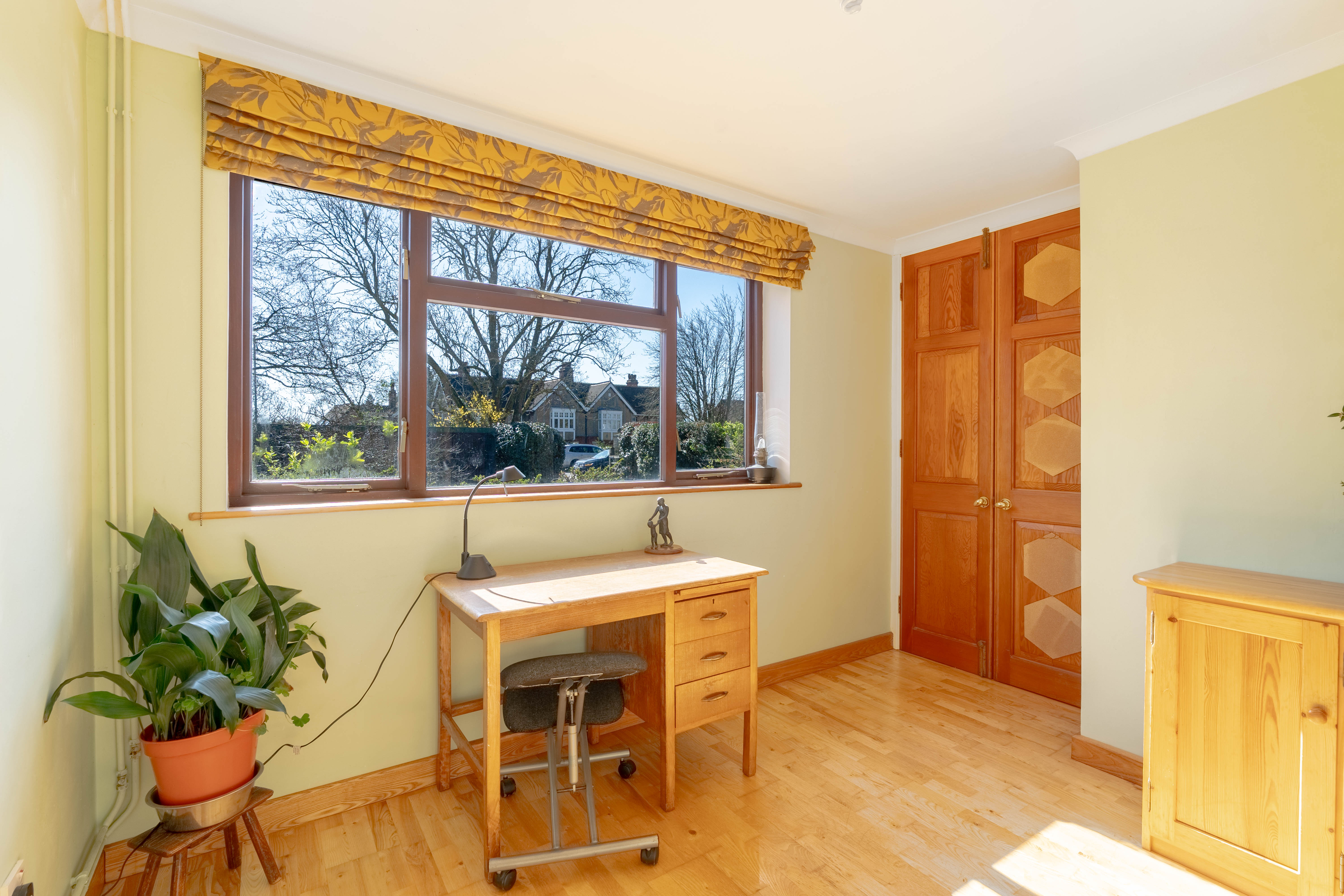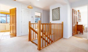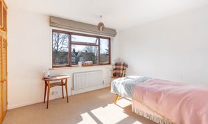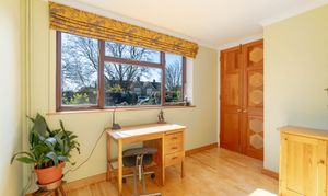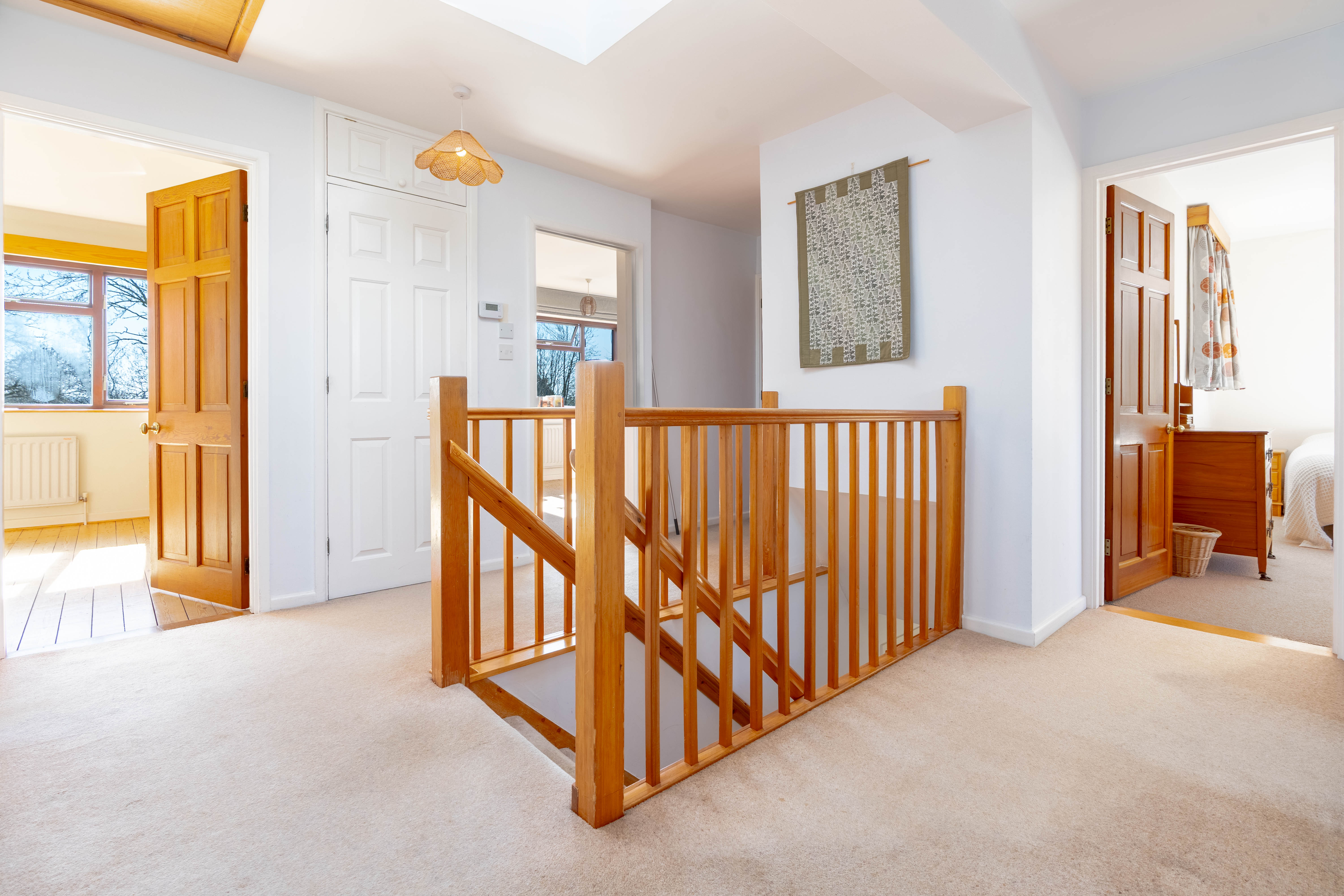 Upstairs, the landing benefits from a large Velux window, allowing natural light to pour in. The first floor comprises five bedrooms, including a spacious principal bedroom with built-in storage and wonderful views over the garden. There are two further double bedrooms, both generously sized, as well as two single bedrooms, making this an ideal home for growing families. A family bathroom, separate WC, and additional shower room serve the first floor. All bedrooms, except the fifth, benefit from built-in storage.