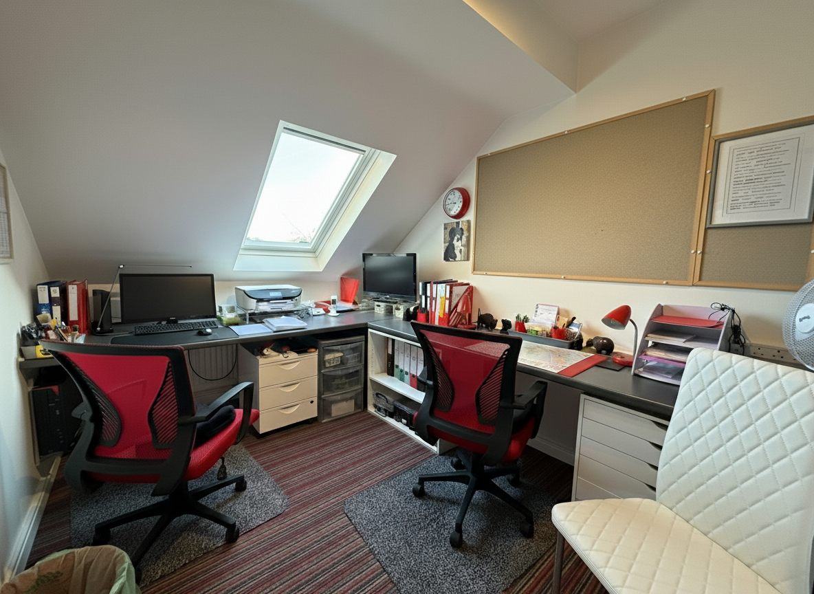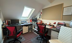 Upstairs, the home continues to impress with four well-proportioned bedrooms. The main bedroom is a peaceful retreat, complete with its own en-suite, perfect for escaping the morning rush. Bedroom two is a comfortable double with built-in wardrobes, while bedroom three is a generous single. Bedroom four, currently used as a home office with a Velux window, could easily become another double bedroom if needed. A modern family shower room completes the first floor.