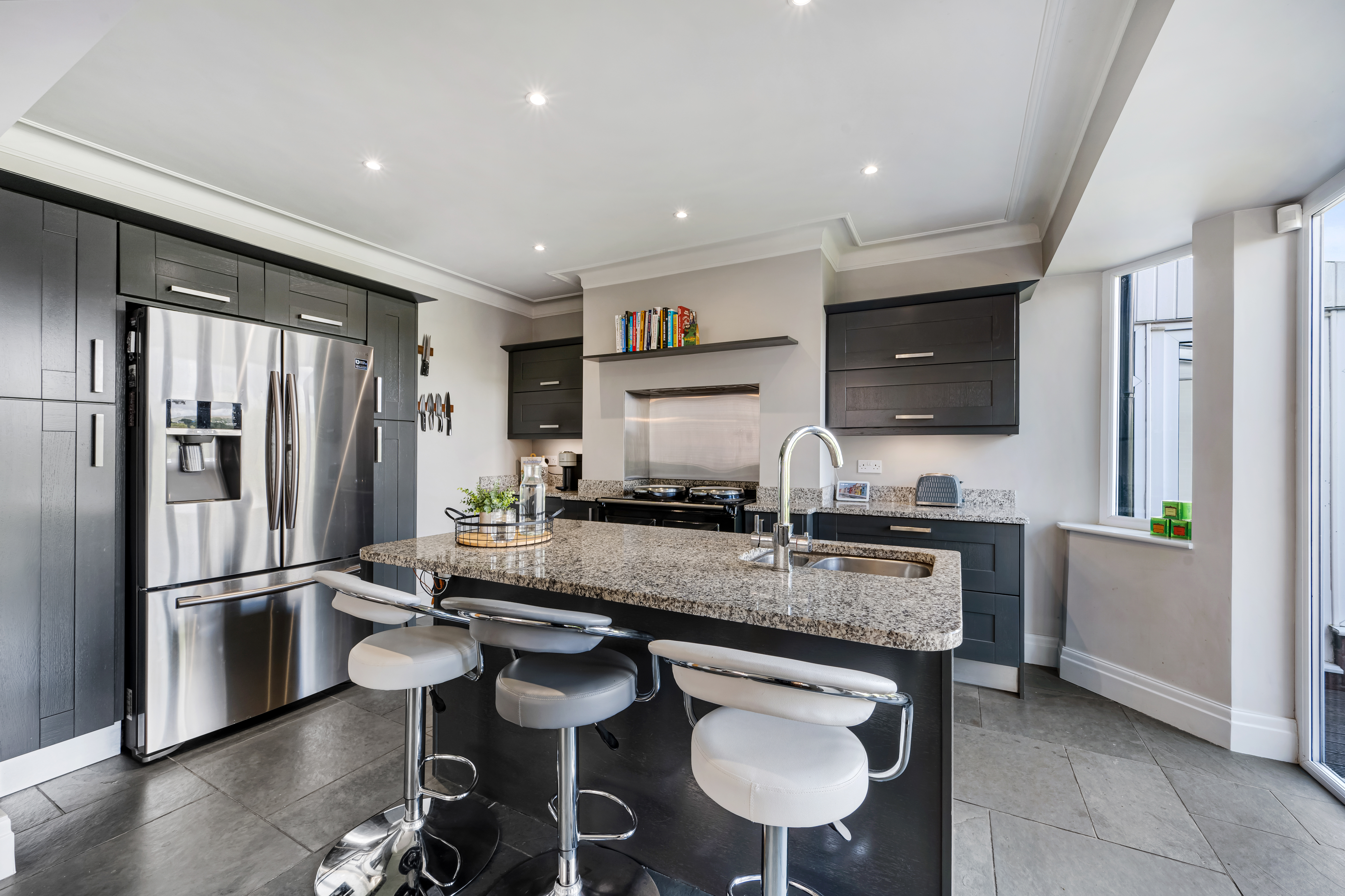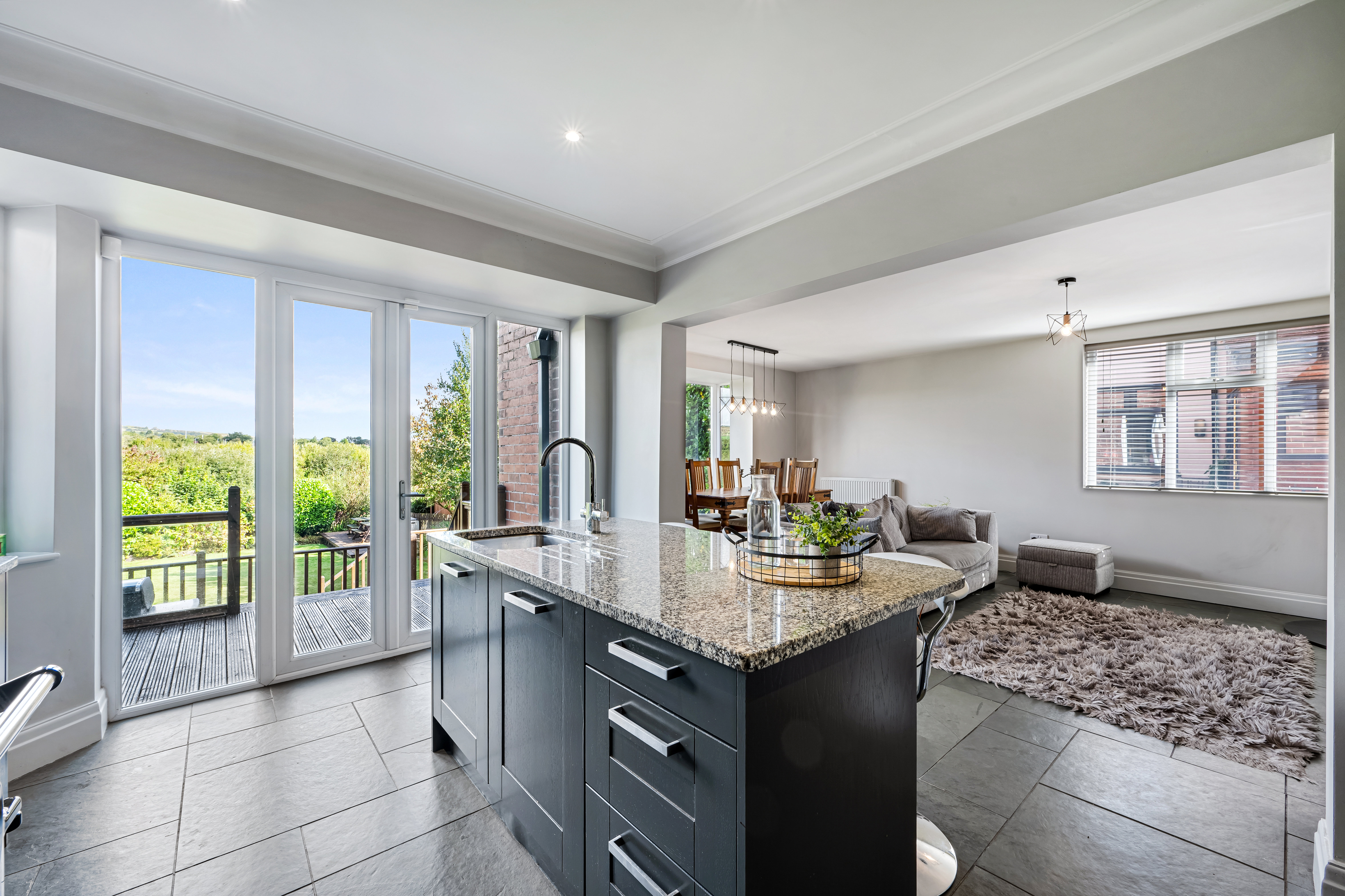 At the rear, the heart of the home unfolds in a spacious open-plan kitchen, dining, and living area. Fitted with an electric three-oven Aga, sleek cabinetry, and a hot tap for instant boiling water, the kitchen is designed with both family life and entertaining in mind. Broad windows and French doors frame spectacular views across the garden, Doffcocker Lodge, and out towards Winter Hill, flooding the space with natural light.