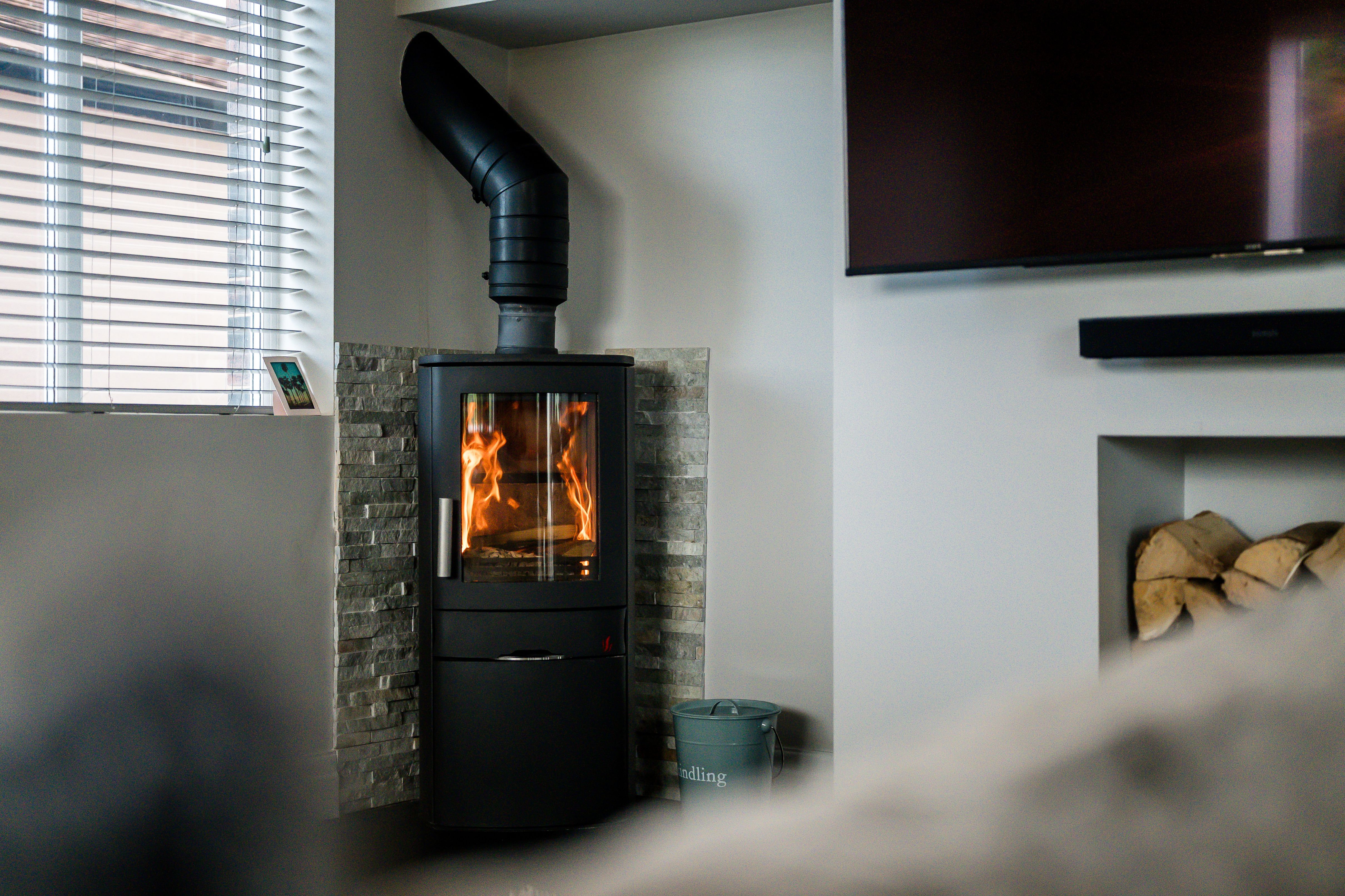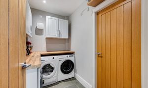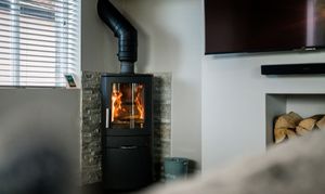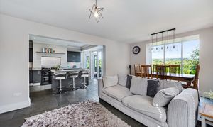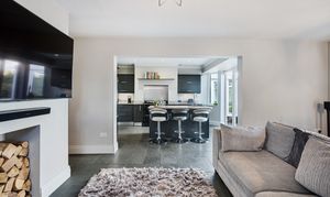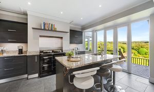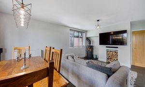 To one side, the dining area encourages family and friends to gather together, while the adjoining living space offers a cosy retreat, warmed by a characterful log-burning stove - the perfect spot to relax while enjoying the outlook. The open-plan flow keeps the whole space connected, blending cooking, dining, and lounging seamlessly.