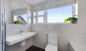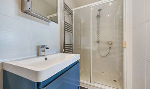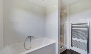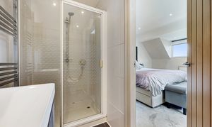 The first floor brings together four well-proportioned bedrooms, each offering flexibility for growing families or visiting guests. The principal suite is enhanced by a modern en suite, while the remaining rooms are served by a bright and stylish family bathroom. Finished with Villeroy & Boch fittings, it features floor-to-ceiling terrazzo-effect tiles, a bath, a separate shower, and a modern floating vanity with a wide integrated basin - combining quality with contemporary design.