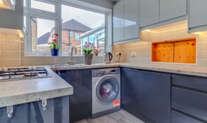 The internal accommodation comprises in brief; a welcoming entrance hall with a staircase rising to the first floor and a door leading off to a wonderful through lounge/diner with a contemporary gas fire and a large picture window to the front. The dining area has ample space for a good sized dining table and there are French doors opening out to the conservatory which is of brick and UPVC construction and provides further reception space. The kitchen is superbly fitted with a range of contemporary, handleless, gloss wall and base units with stone effect worksurfaces, inset sink and drainer and a selection of appliances.