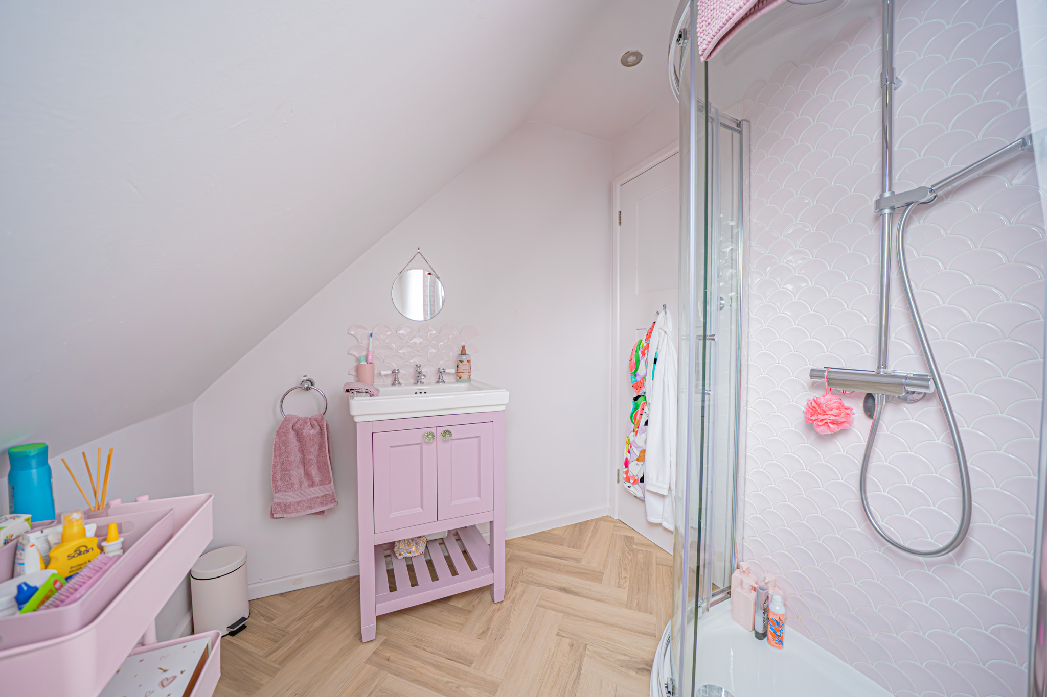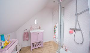 Moving upstairs, the first floor accommodates three double bedrooms, with the principal bedroom boasting a large en-suite and fitted storage. A family bathroom serves the remaining bedrooms. Ascend to the second floor to discover a superb double bedroom with a spacious en-suite and the added benefit of a large storage room.