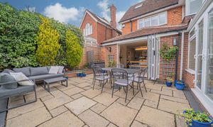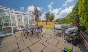 Outside, the property delights with a beautifully maintained rear garden featuring a large patio seating area, ideal for outdoor relaxation or entertaining. A driveway provides parking for multiple vehicles, adding to the property's convenience and accessibility.