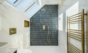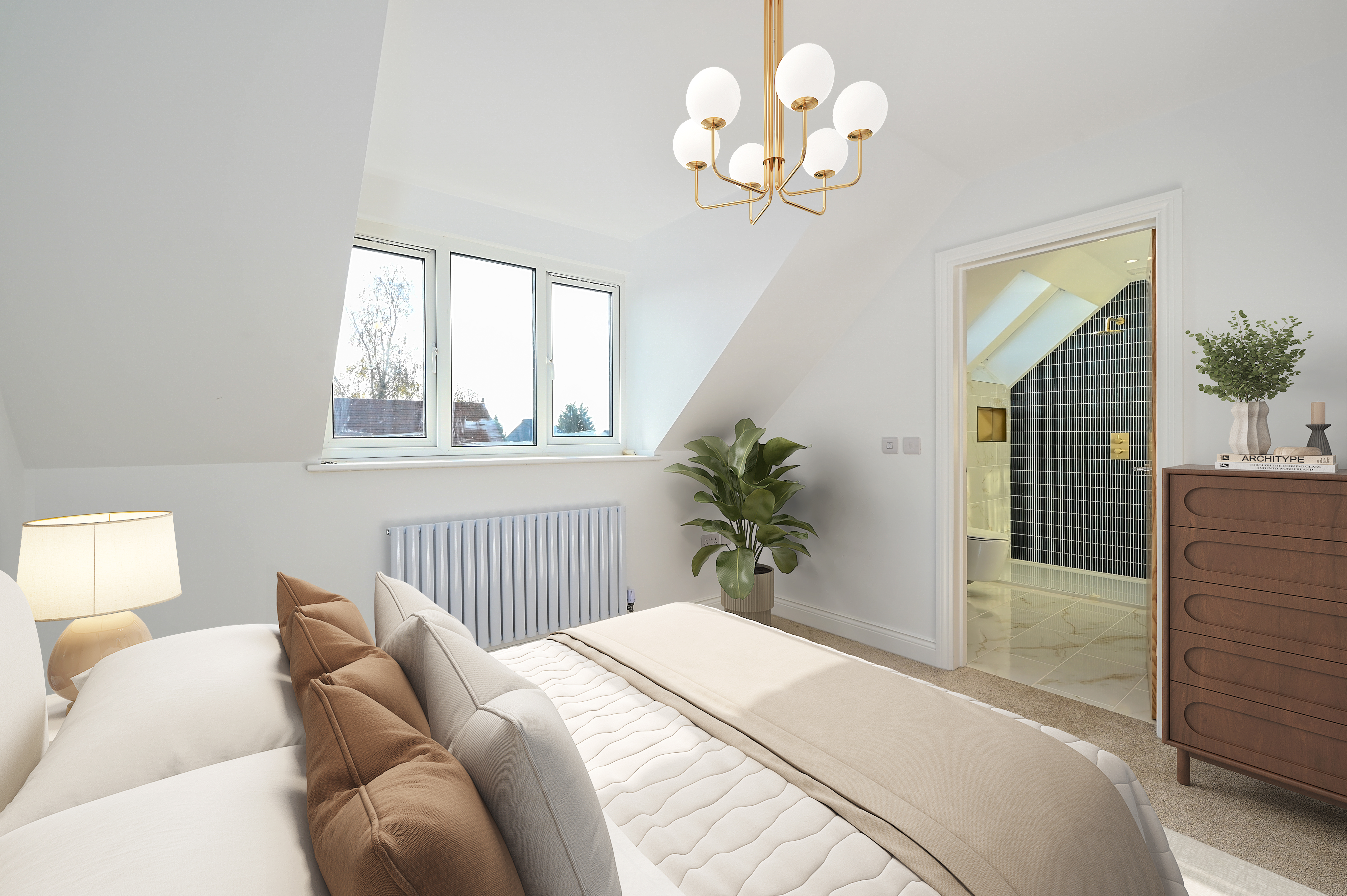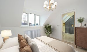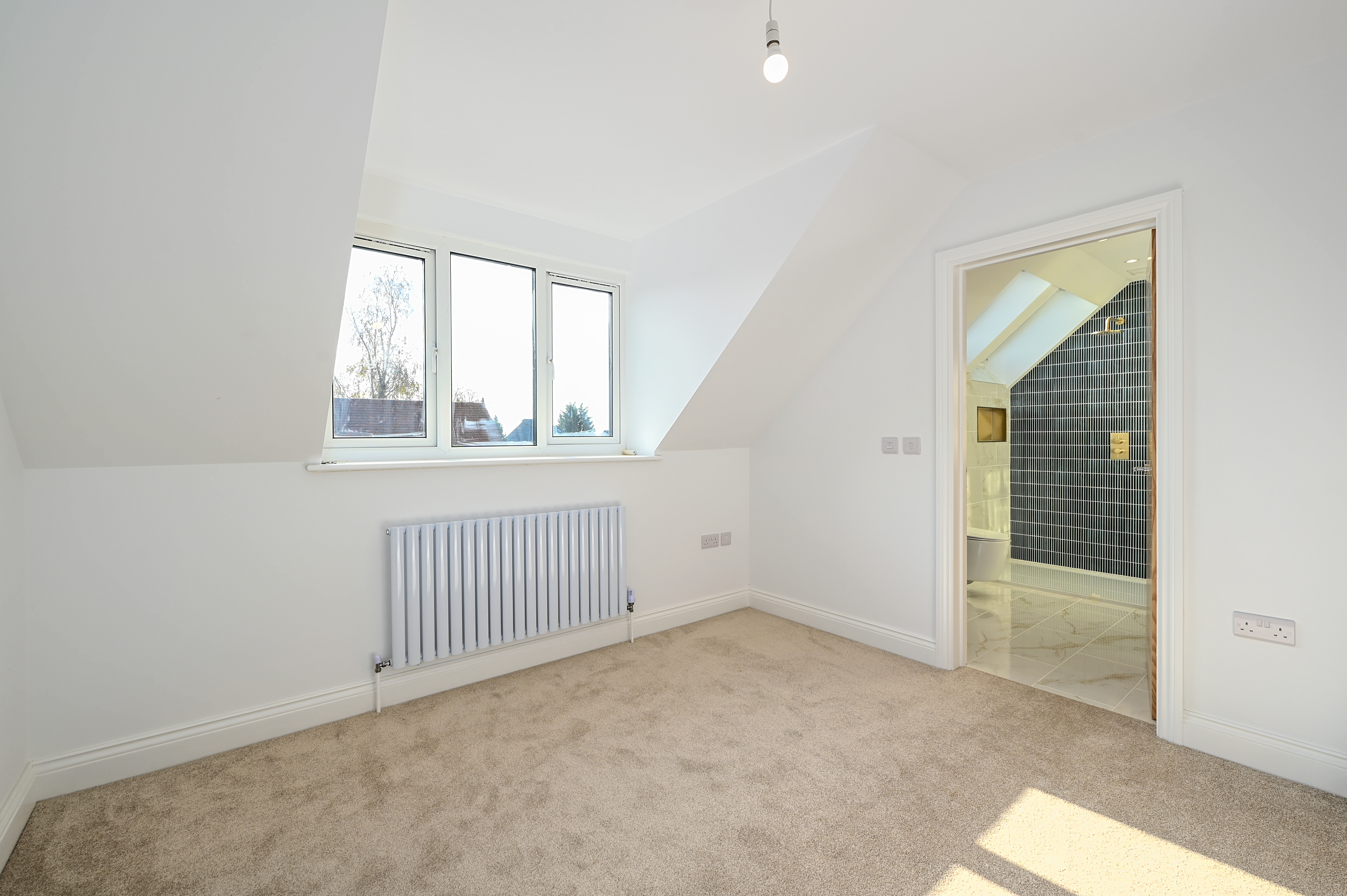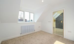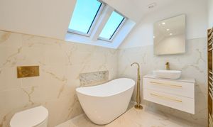 Two triple glazed Velux windows to the rear. roll-top freestanding bath with freestanding mixer tap to shower. Vanity hand basin with storage underneath. Back to wall WC, heated towel rail, part tiled walls, tiled floor, large mirror with Bluetooth connection plug.
