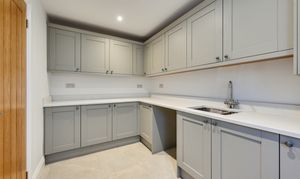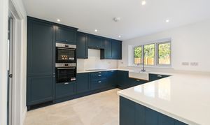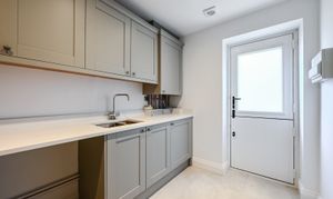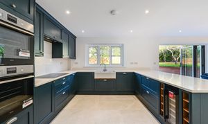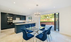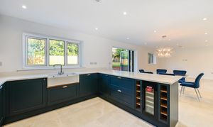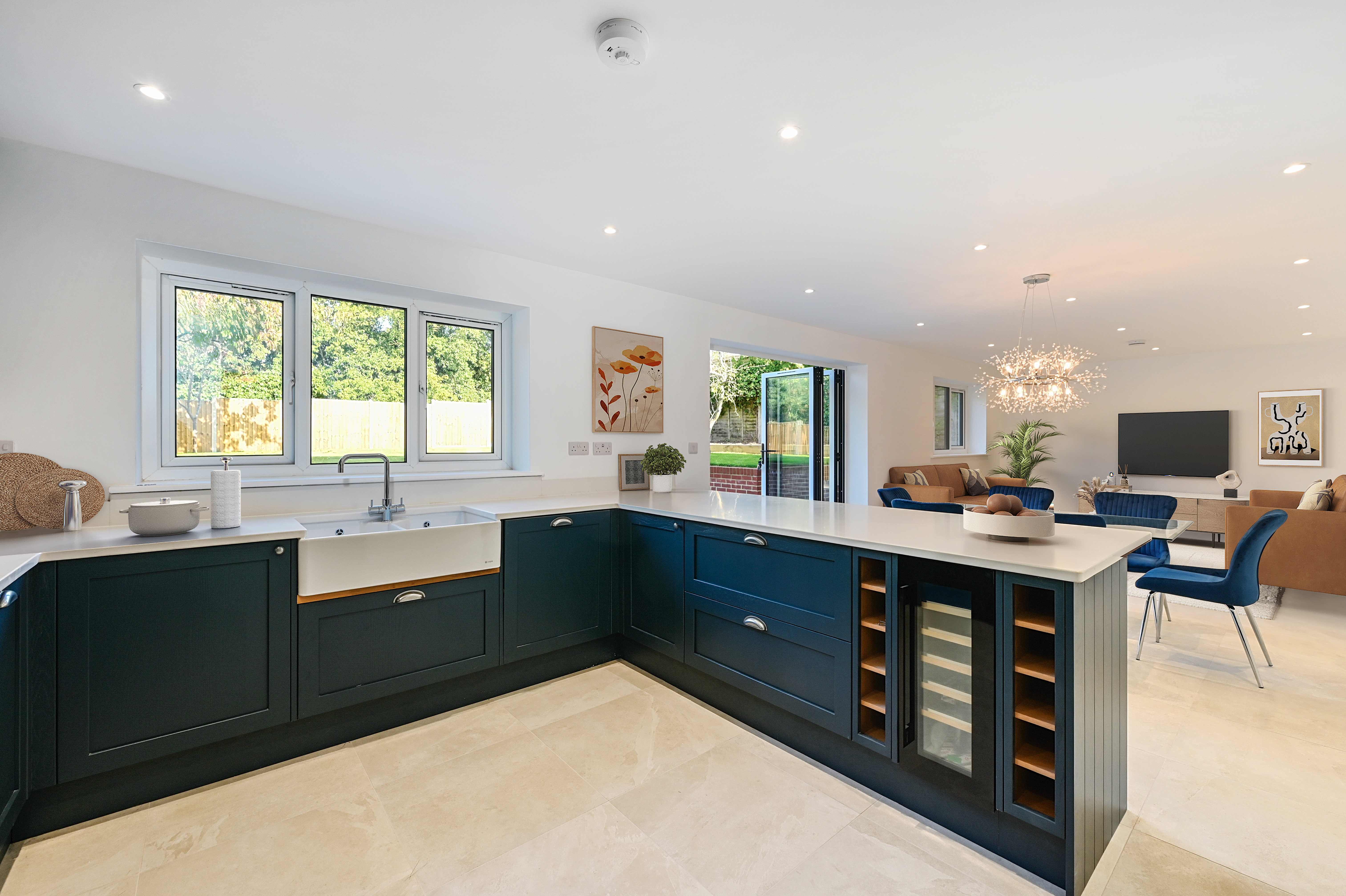 Large spacious open plan area with Kitchen comprising of matching wall and base units in shaker style royal blue. Large AEG induction hob and extractor fan. Integrated AEG double ovens. Integrated fridge and integrated freezer. Pull-out recycling bin, AEG dishwasher, wine cooler, tiled floors and quartz worktops with sunken sink. UPVC double glazed bi-fold doors out to the garden. UPVC double glazed windows to kitchen and dining end. Central Island sub dividing the two rooms. Underfloor heating throughout this area. Door To :-