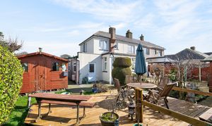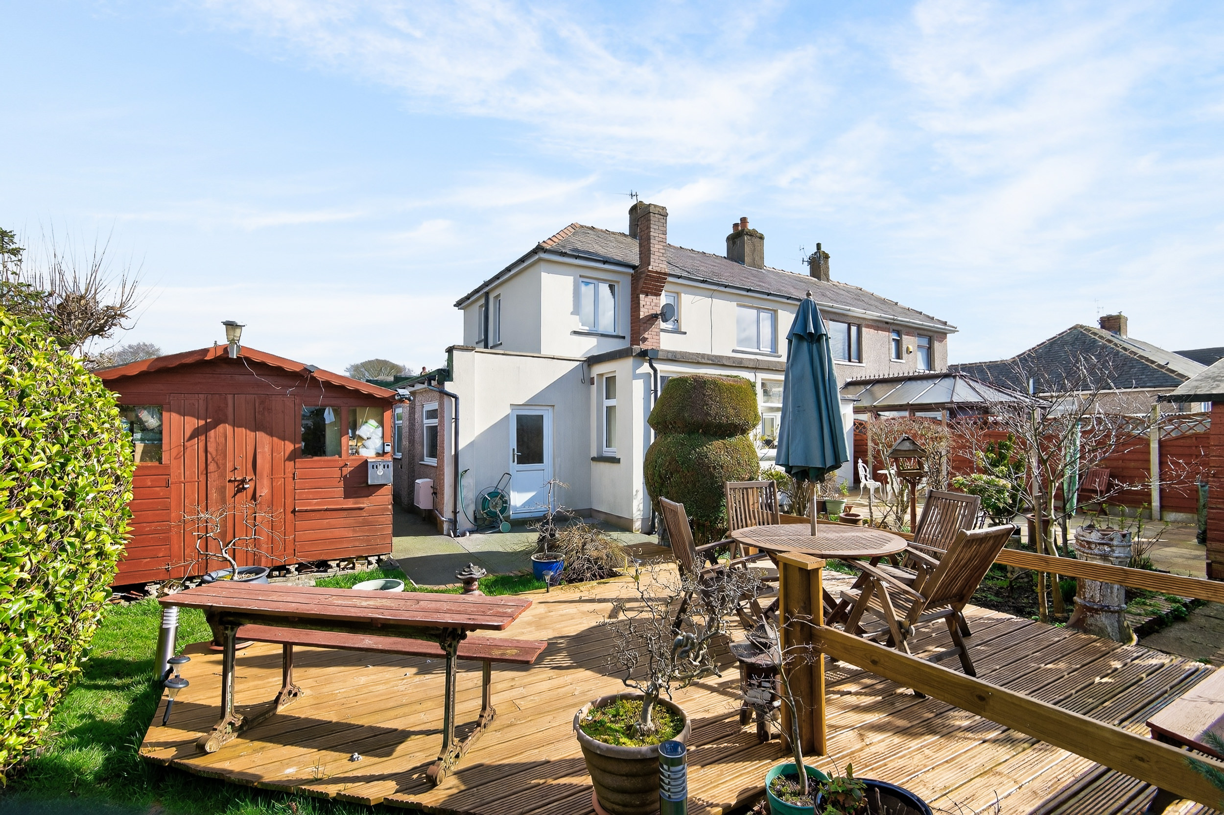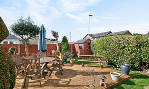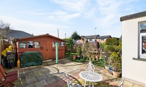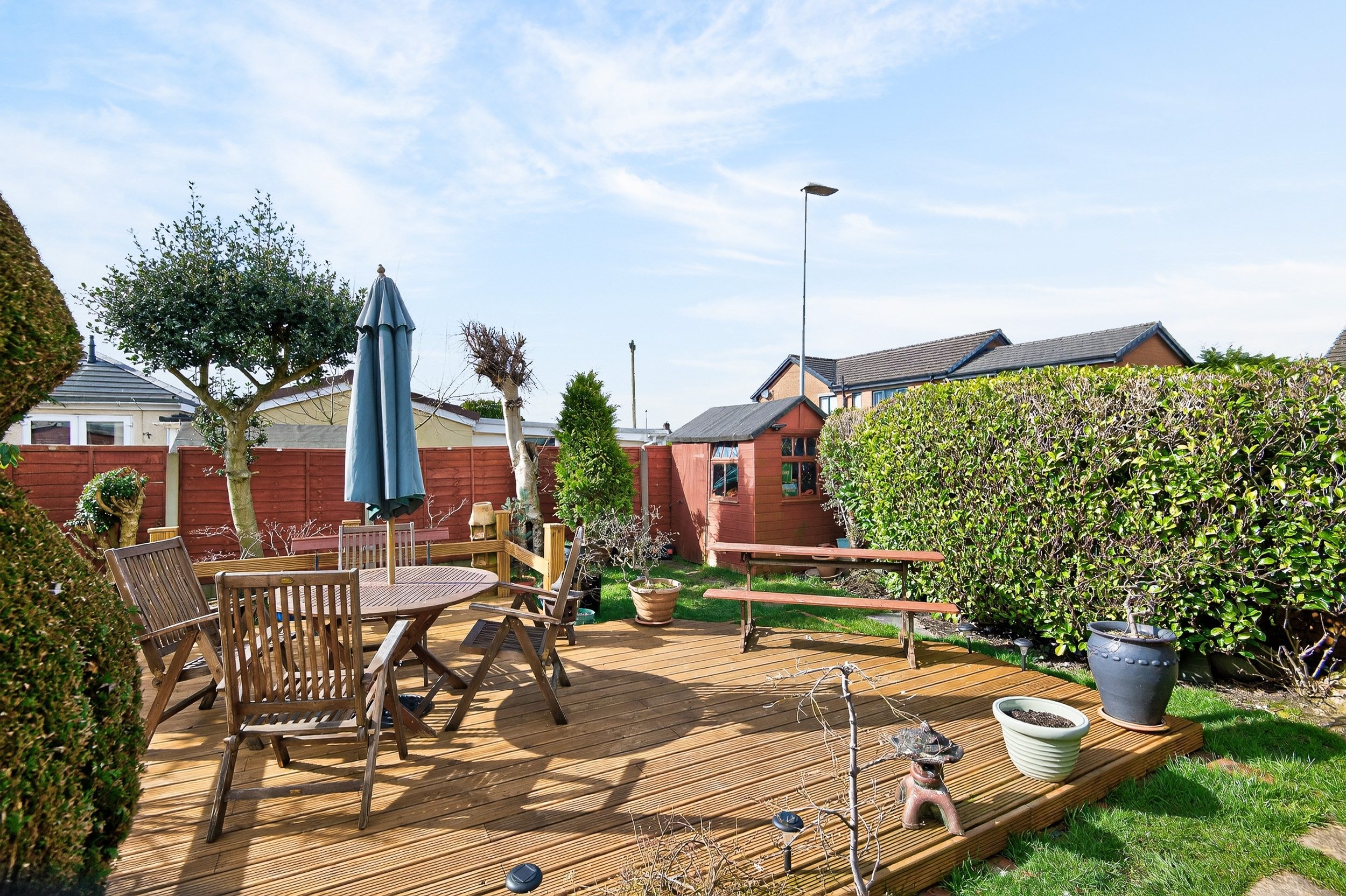 Externally, the property enjoys a generous and well-maintained rear garden designed to make the most of outdoor living. A raised timber deck provides an ideal entertaining space with room for outdoor dining and seating, overlooking the garden and offering a pleasant outlook across the surrounding area. The remainder of the garden is arranged with paved patio areas, lawn sections and established planting, creating a private and inviting setting for relaxing or hosting guests. To the side of the property also sits a detached garage along with a substantial timber shed, both providing excellent storage options for tools, gardening equipment or hobby space. The layout of the garden offers a practical blend of usable outdoor space and storage while still leaving plenty of room to enjoy the sunshine throughout the day.