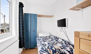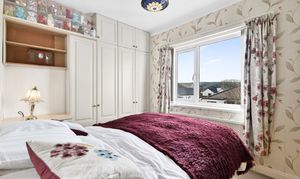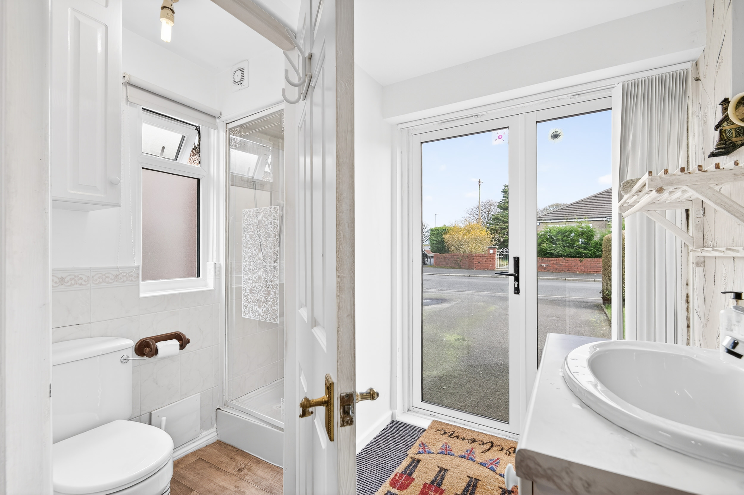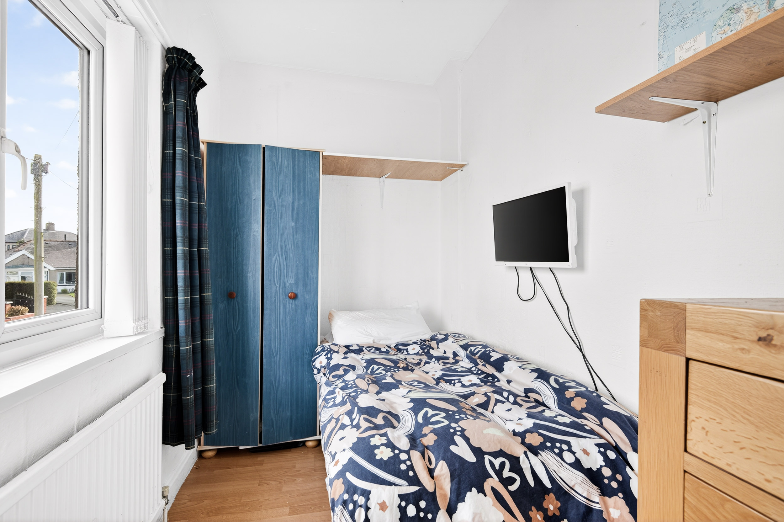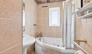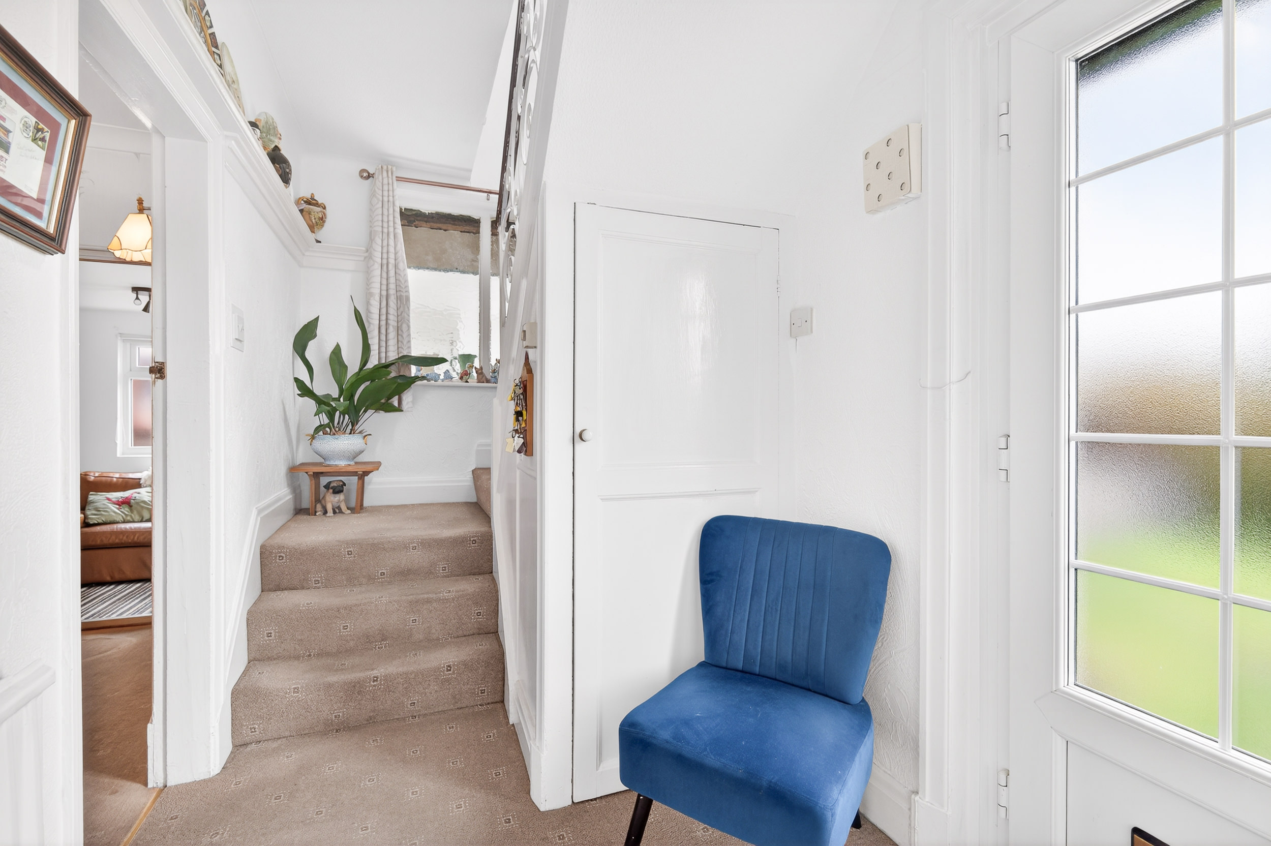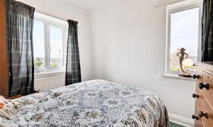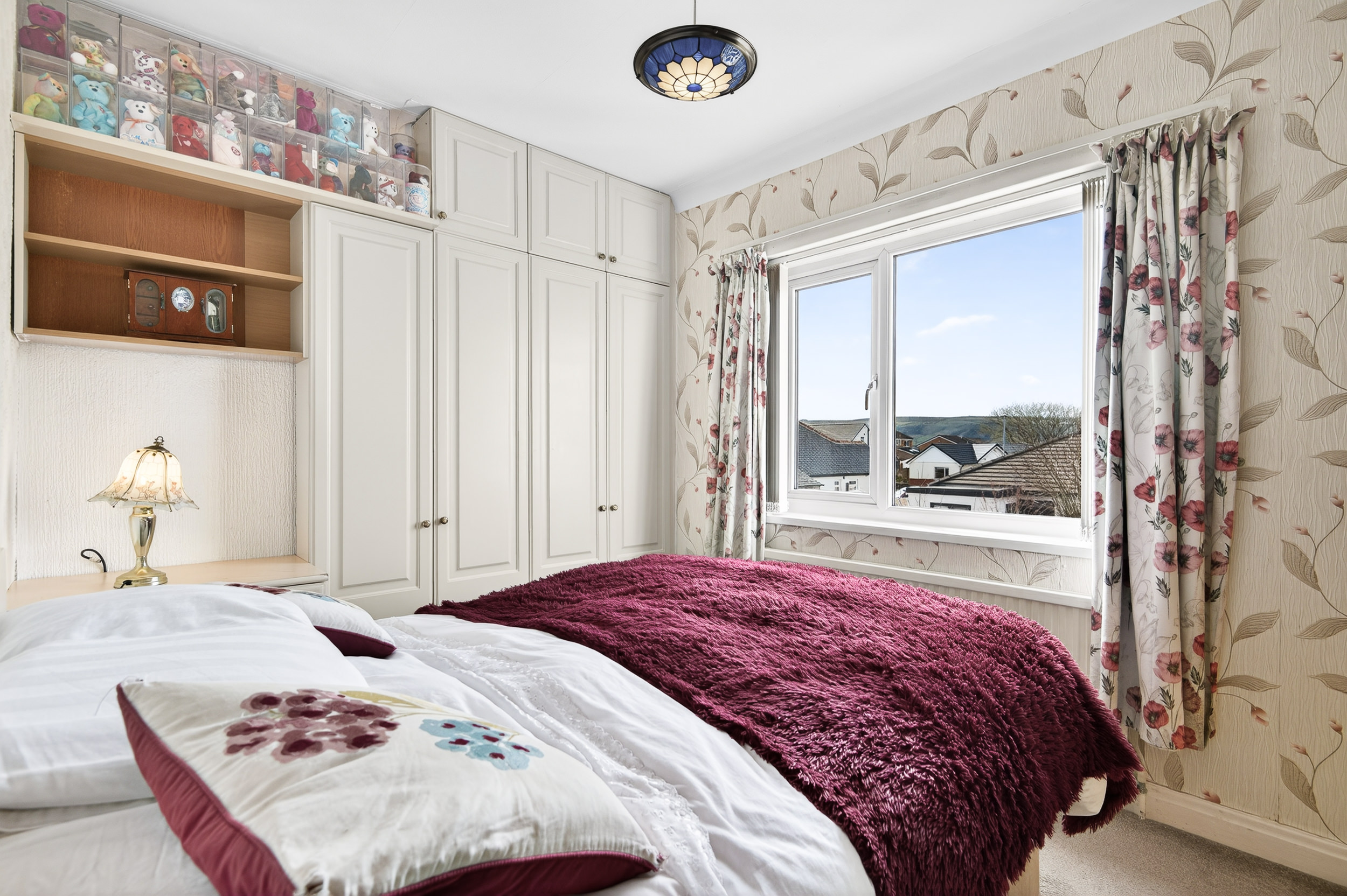 The first floor accommodation is accessed via a central landing with natural light from a side window and access to all rooms. The main bedroom is a generous double featuring fitted wardrobes and a large window providing elevated outlooks and plenty of natural light. A second bedroom offers a comfortable sleeping space with room for freestanding furniture, while the third bedroom provides a versatile single room ideal for a child’s bedroom, study or dressing room. The bathroom is fitted with a corner bath incorporating a shower over, alongside a wash basin and tiling. Adjacent to the bathroom is a separate WC area, providing additional practicality for busy households.