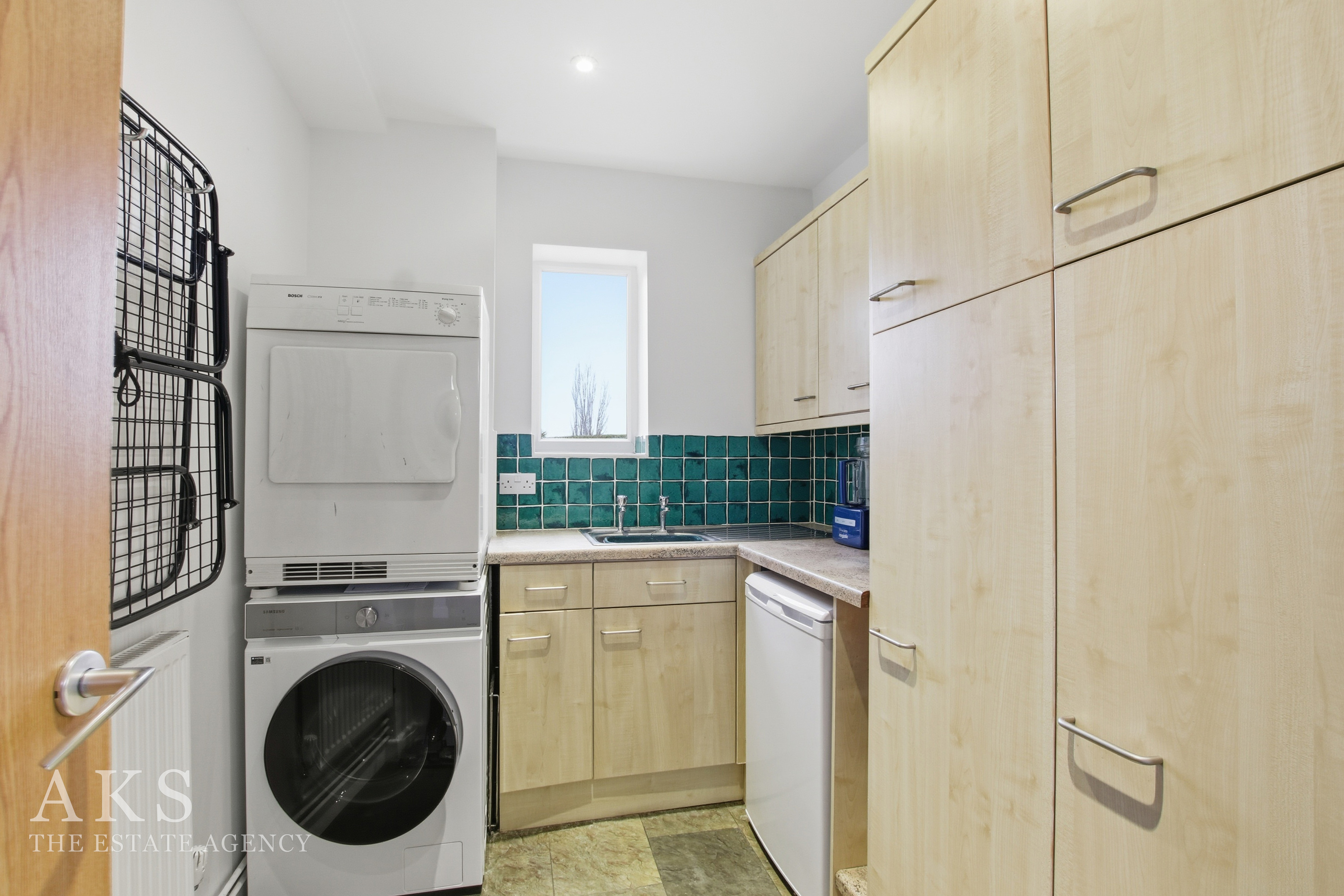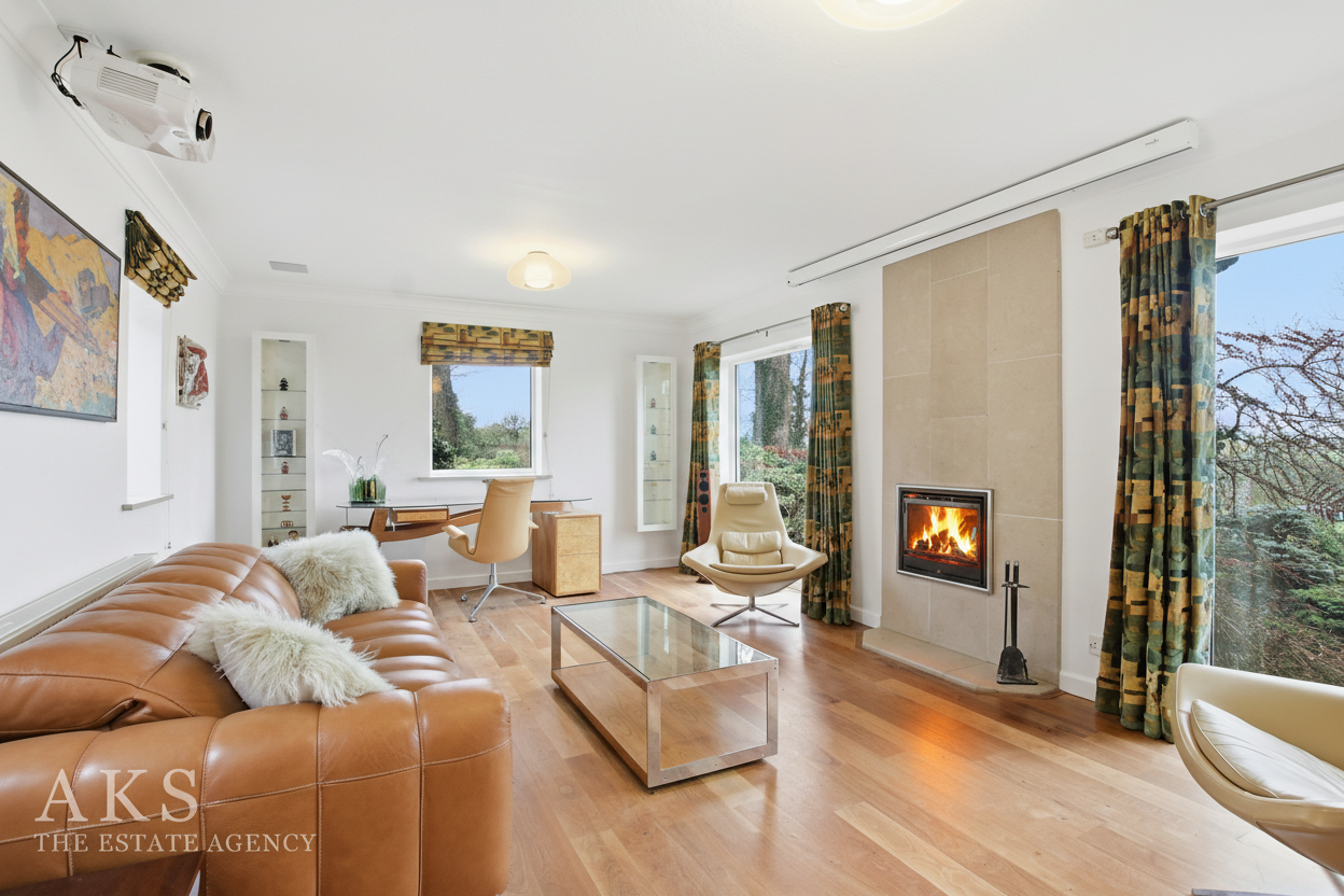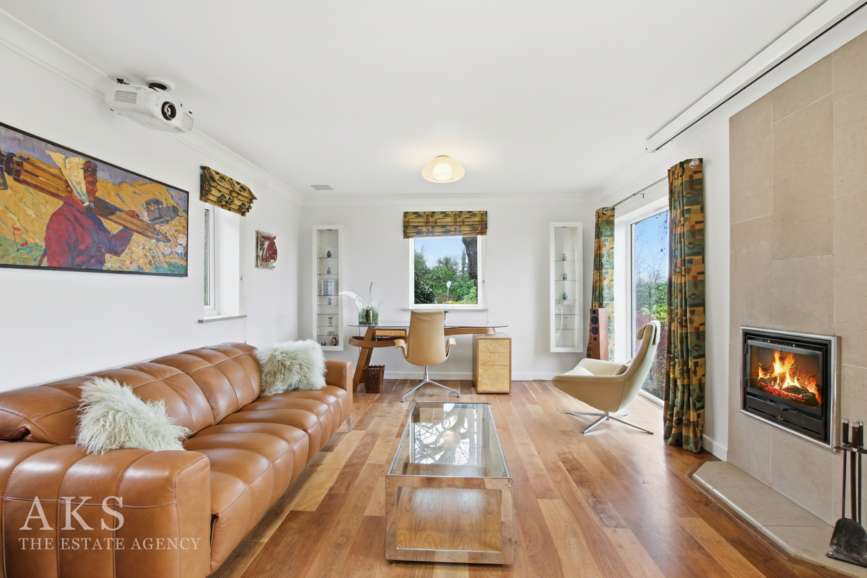 The living room is another standout room for me, with floor‑to‑ceiling windows overlooking the garden, a striking feature fireplace, and even a projector for a true cinematic experience. A further reception room sits quietly at the back of the home, offering a secluded, intimate space, ideal for unwinding or finding a moment of calm. A useful utility space finishes off this area perfectly.