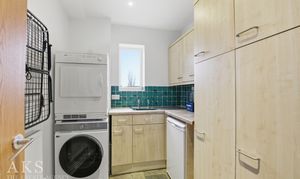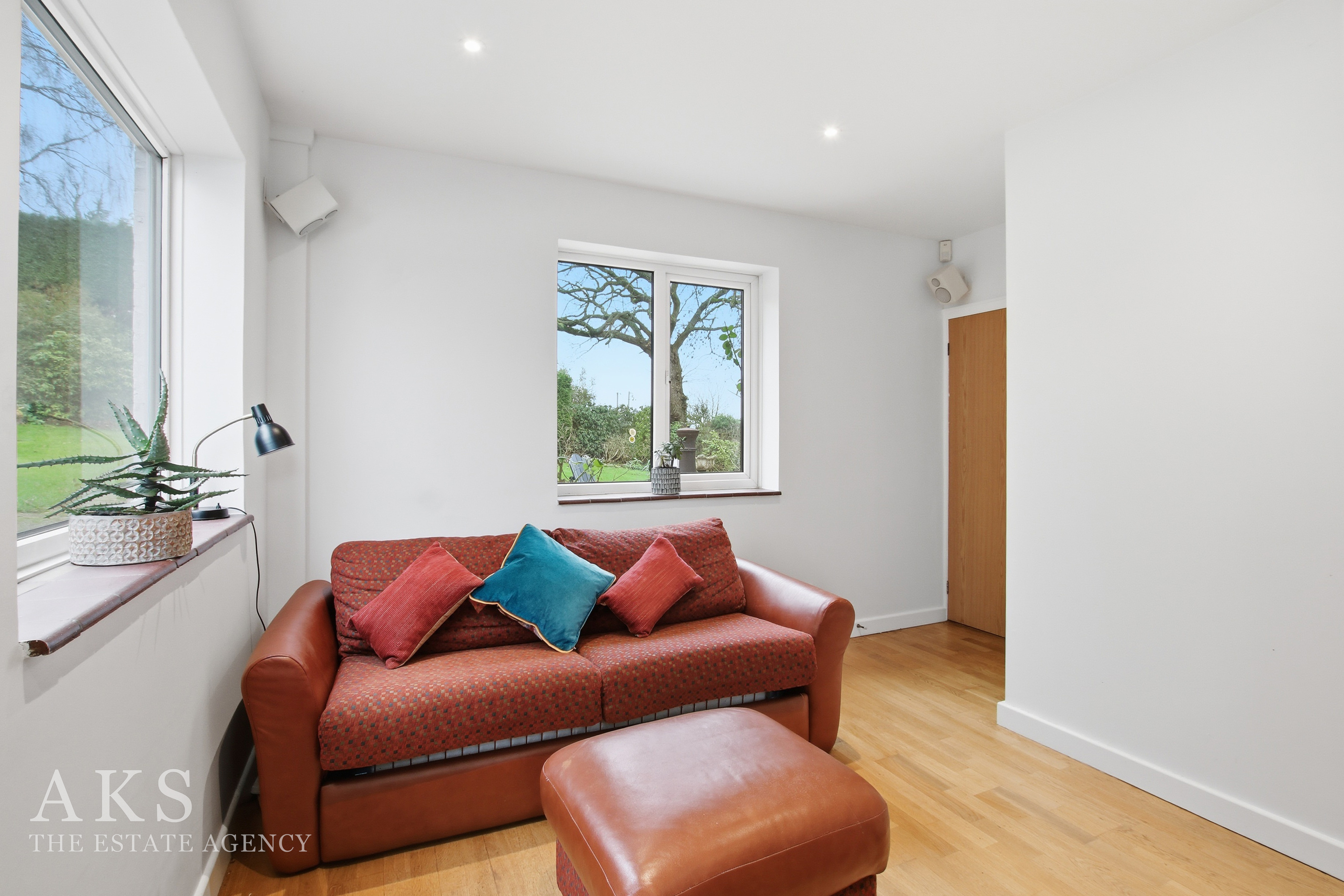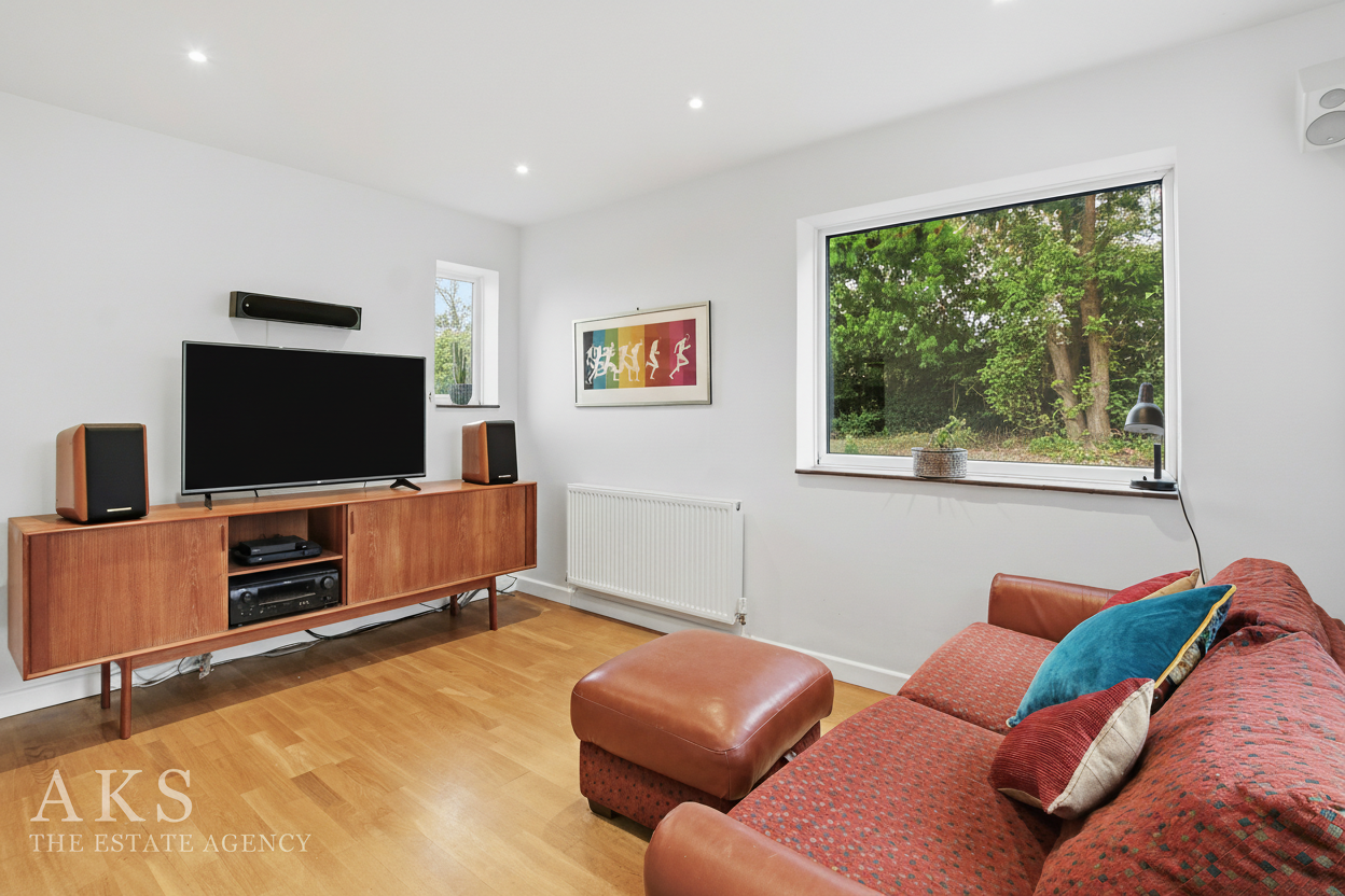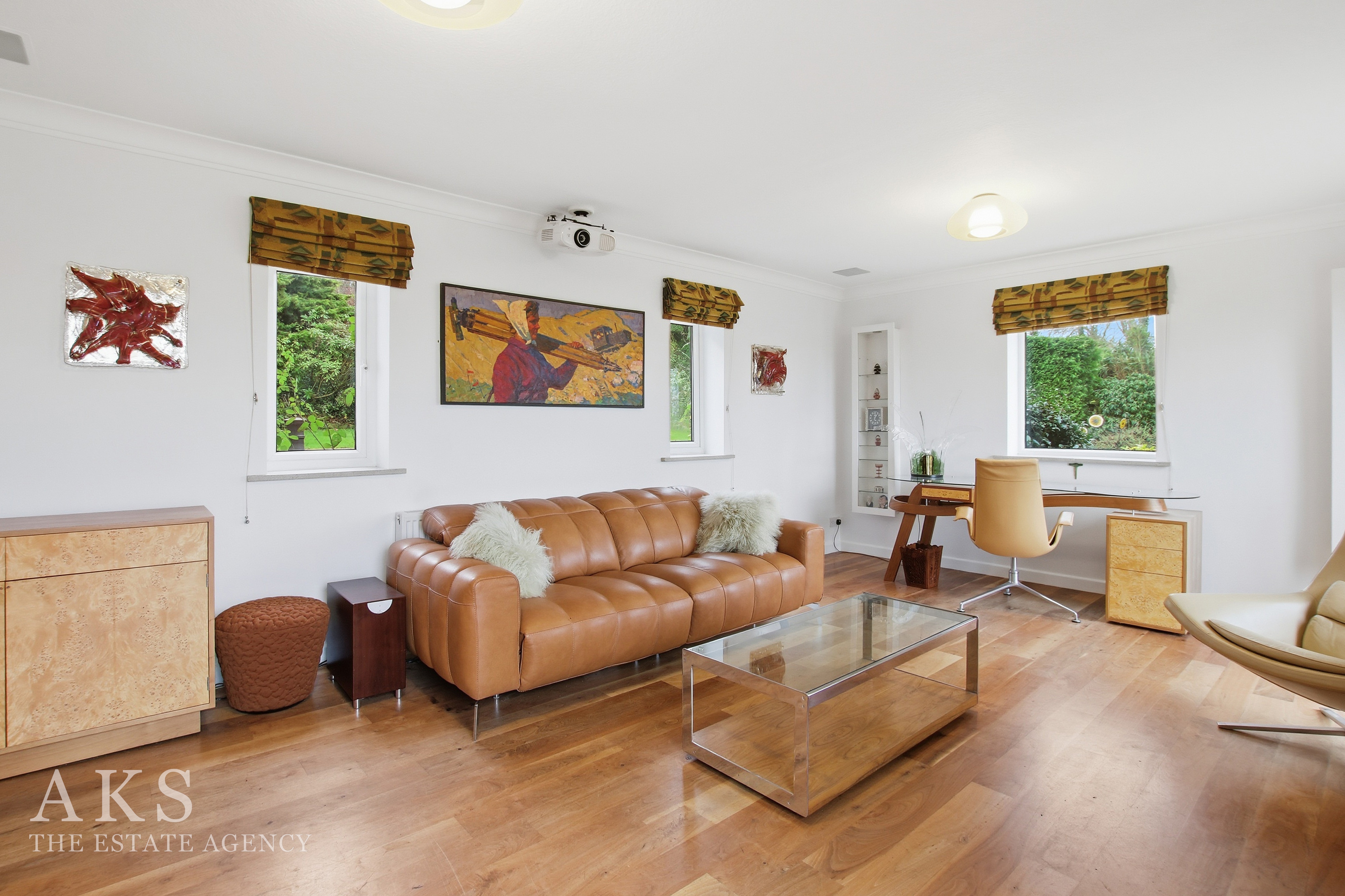 The living room is another standout room for me, with floor‑to‑ceiling windows overlooking the garden, a striking feature fireplace, and even a projector for a true cinematic experience. A further reception room sits quietly at the back of the home, offering a secluded, intimate space, ideal for unwinding or finding a moment of calm. A useful utility space finishes off this area perfectly.