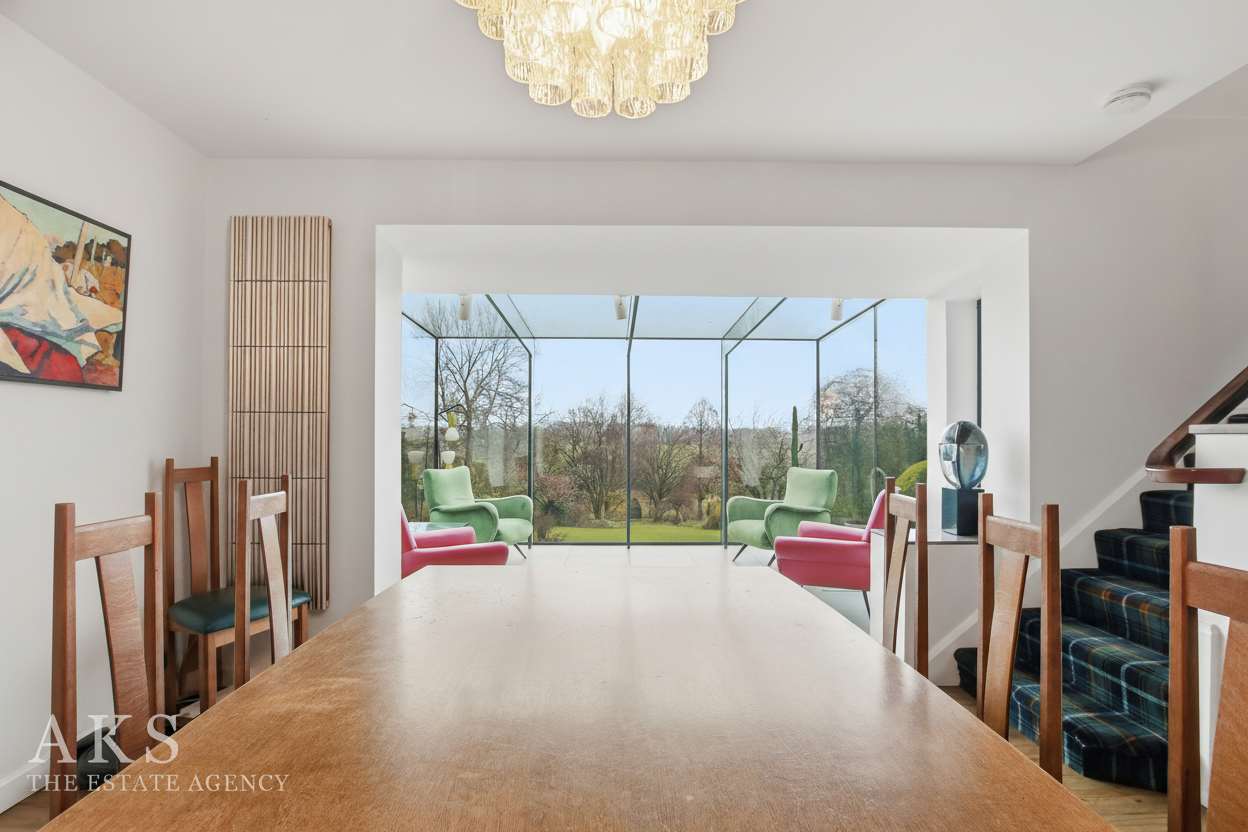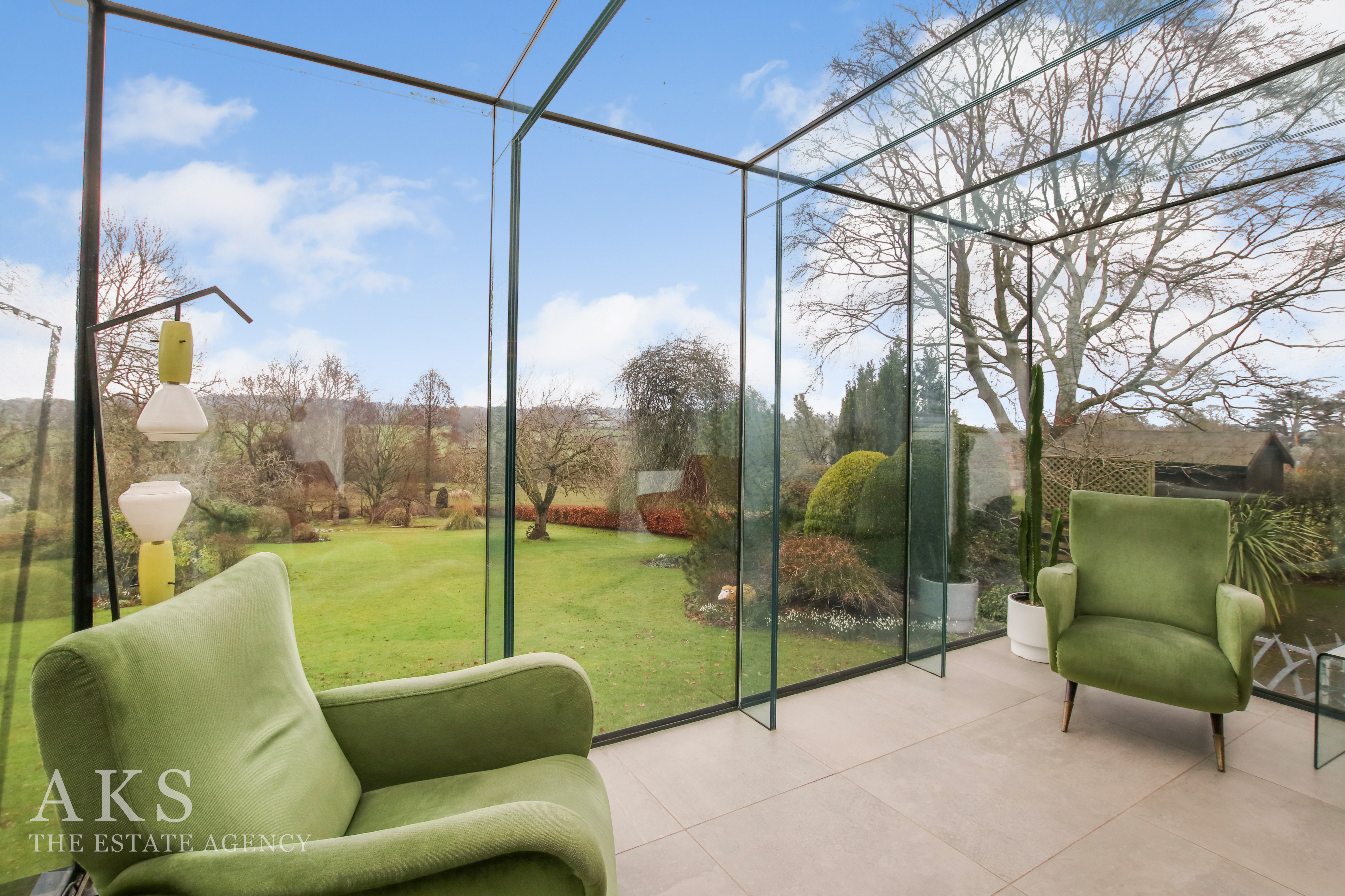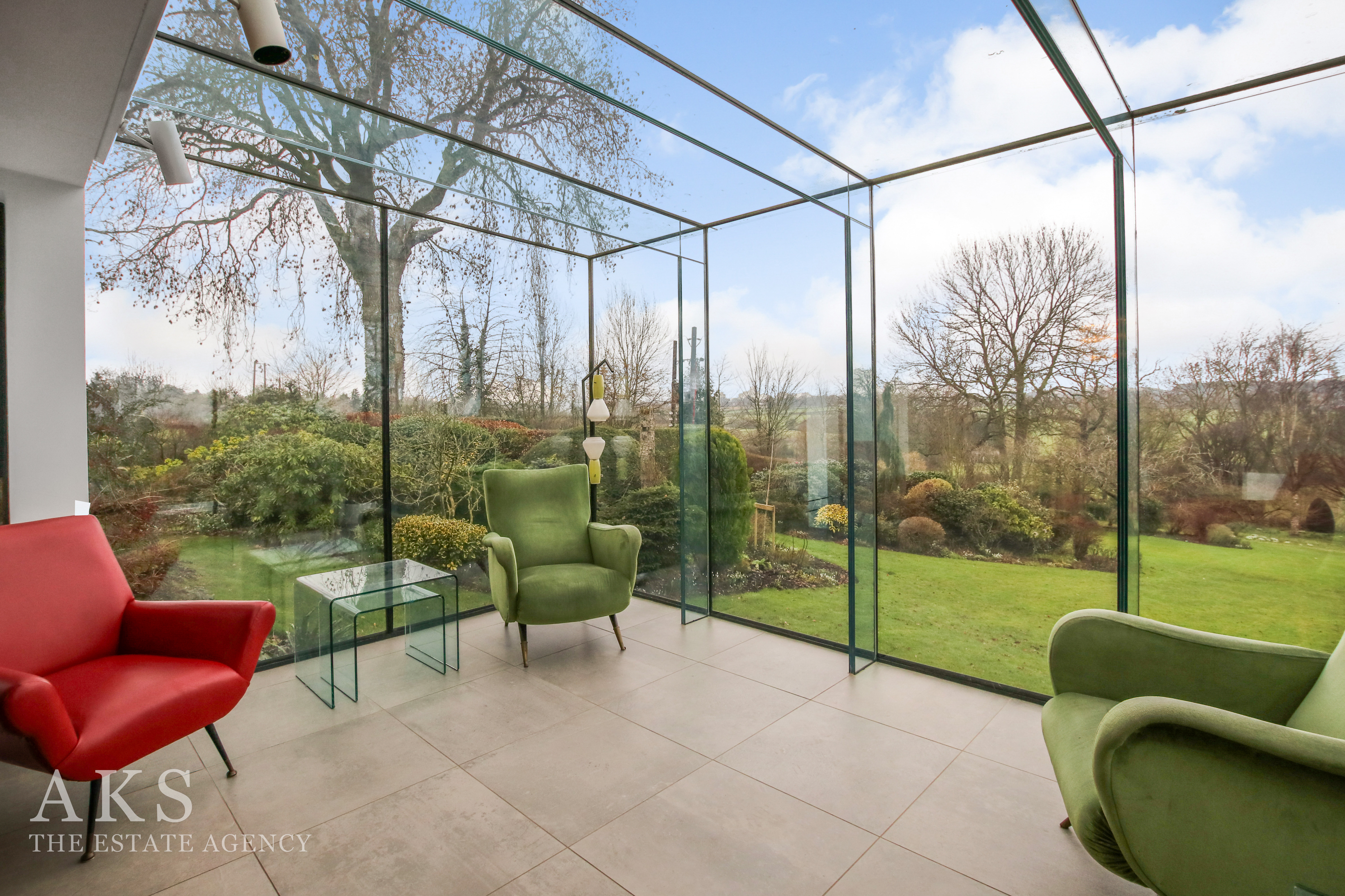 The dining room is where the home truly begins to reveal its magic. The views are breath taking, a generous open space perfect for a large dining table, flowing seamlessly into the full‑glass summer room, which shows the exceptional views over the garden. The open‑plan kitchen sits just beyond, partitioned by a breakfast bar and warmed by the Nobel oven. For such a large space, it feels remarkably cosy and homely. The summer room is one of the most beautiful spaces I’ve seen, with heated flooring and panoramic glazing, it’s a room to enjoy all year round, the perfect place to sit back and simply take it all in.