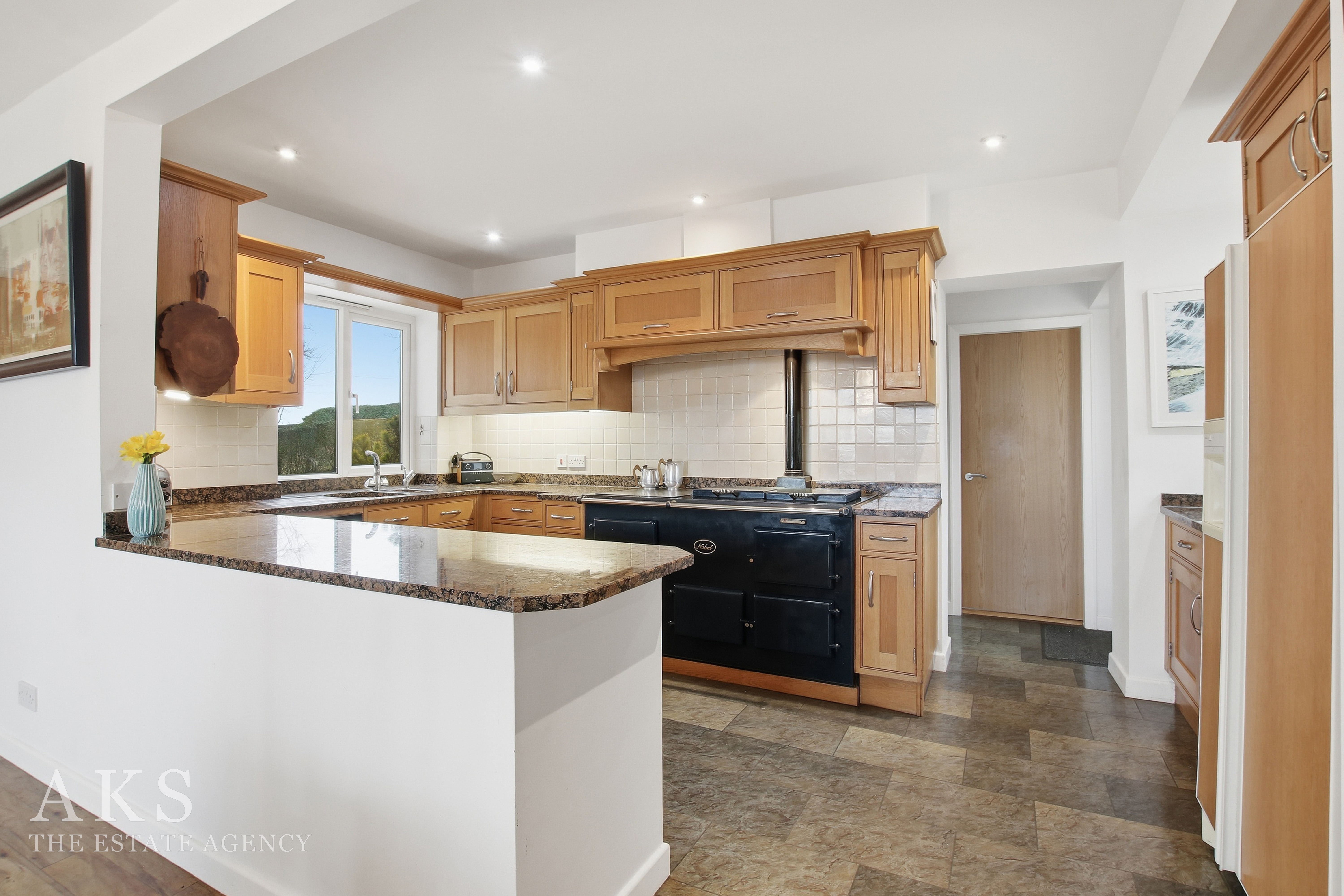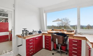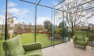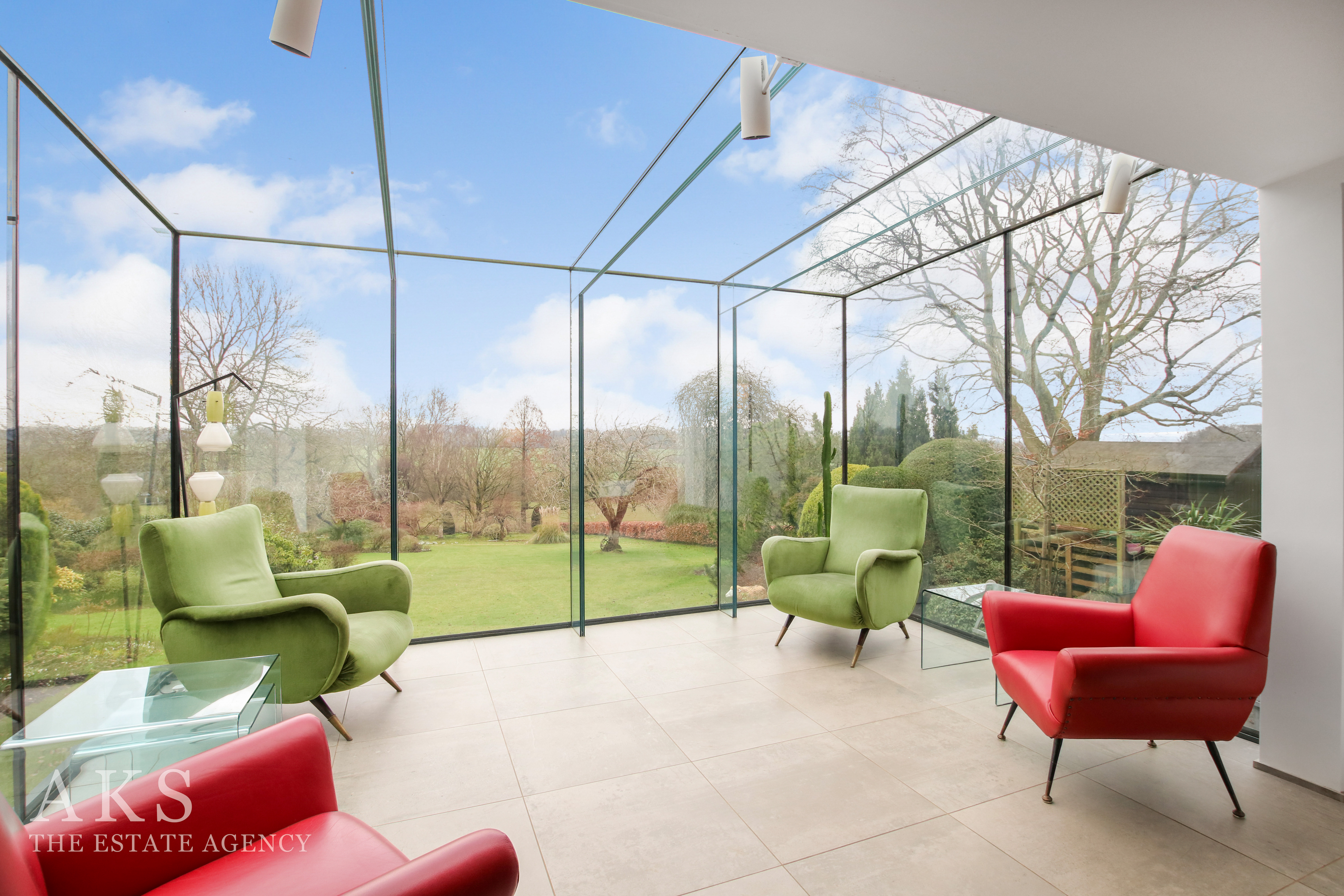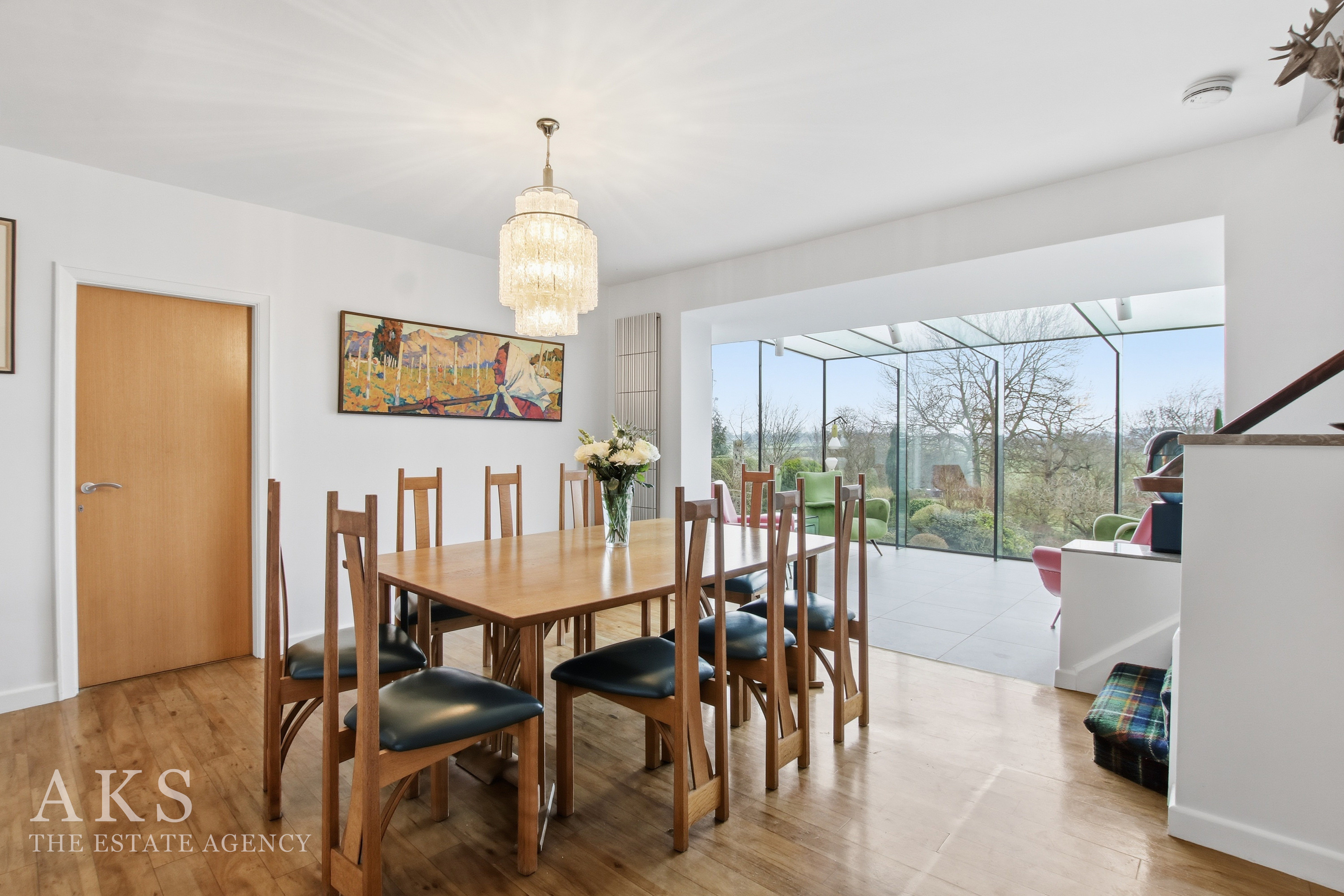 The dining room is where the home truly begins to reveal its magic. The views are breath taking, a generous open space perfect for a large dining table, flowing seamlessly into the full‑glass summer room, which shows the exceptional views over the garden. The open‑plan kitchen sits just beyond, partitioned by a breakfast bar and warmed by the Nobel oven. For such a large space, it feels remarkably cosy and homely. The summer room is one of the most beautiful spaces I’ve seen, with heated flooring and panoramic glazing, it’s a room to enjoy all year round, the perfect place to sit back and simply take it all in.