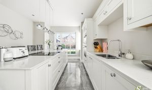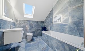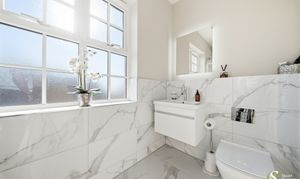 The ground floor is thoughtfully designed for modern family life and entertaining. At the heart of the home is a spectacular open-plan living kitchen and dining area, extending over 35ft and flooded with natural light. This impressive space features a stylish fitted kitchen with central island and ample room for dining and relaxed family living, with direct access to the garden. A separate spacious lounge provides a more formal living space, while a study offers the perfect environment for home working or a gym as it is currently. The ground floor is completed by a welcoming entrance hall, WC and a practical pantry/storage area.