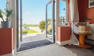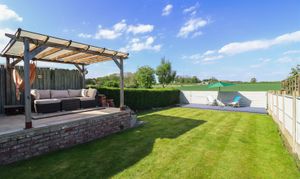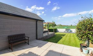 Outside, the plot works brilliantly for everyday living and entertaining: a broad driveway for multiple vehicles, side access to a detached garage, and a landscaped rear garden with two patios plus a raised deck behind the garage - perfect for evening sun and uninterrupted field views.