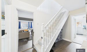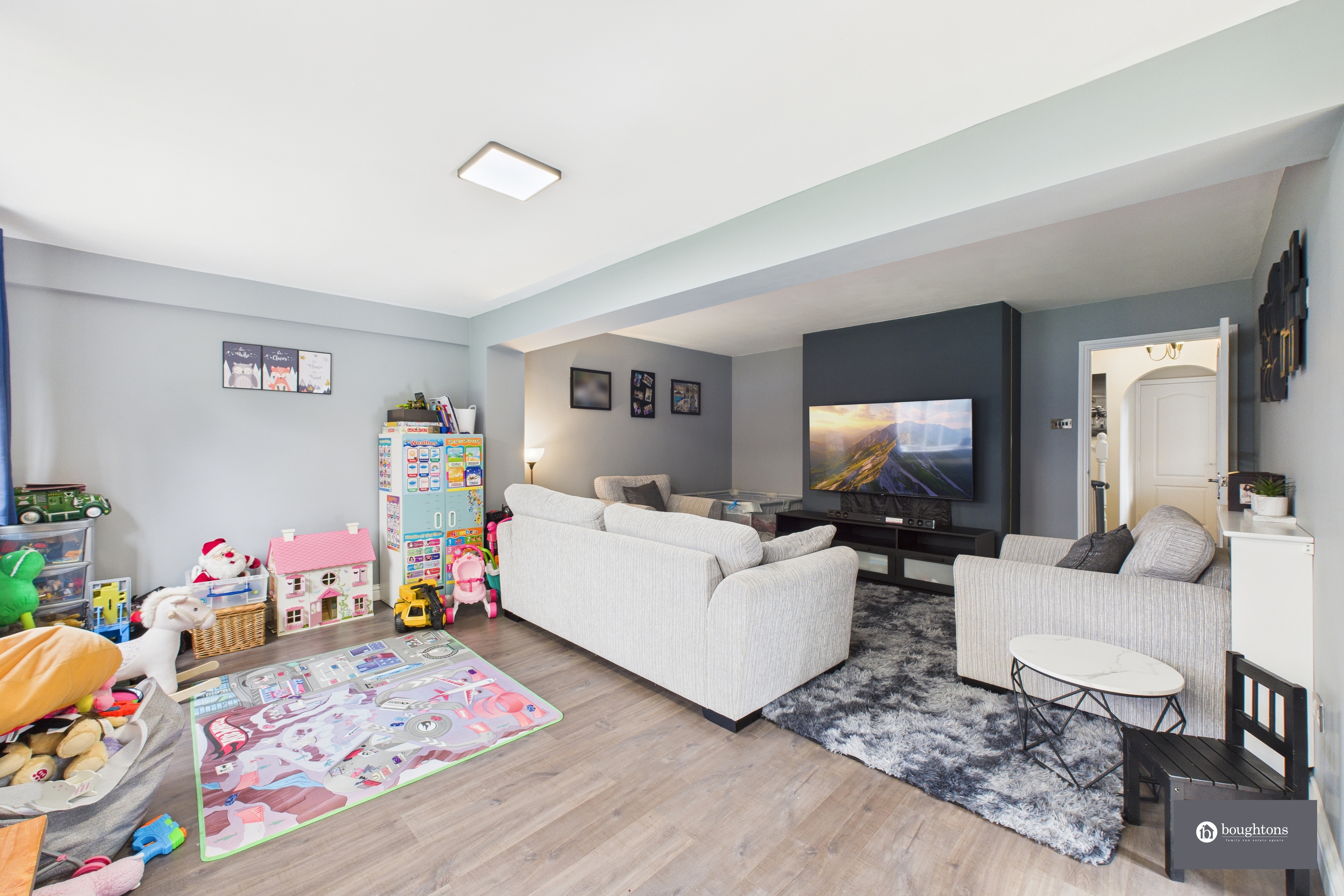 The property is approached via a generous driveway and neatly kept front lawn, creating an inviting first impression. Stepping inside, the entrance hall leads to three welcoming reception rooms — offering flexible spaces that can be adapted for family life, dining, or entertaining. The main living room enjoys a lovely outlook over the rear garden, filling the space with natural light and creating a warm, homely feel.