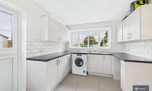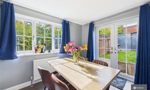 The kitchen is fitted with a range of contemporary wall and base units, complemented by tiled splashbacks, integrated appliances, and an extractor fan. The dining area is perfect for family meals, with French doors opening out to the private rear garden — seamlessly connecting indoor and outdoor living.