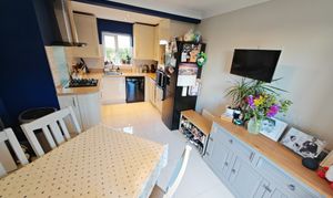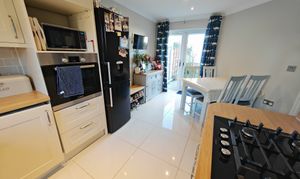 A double-glazed window faces the front. The kitchen, refitted in 2016, features sleek high-gloss Leekes matching base and wall units, oak-effect work surfaces with matching upstands, and an inset stainless steel sink with a chrome mixer tap. It includes a built-in Bosch gas hob with a Premier Range chimney extractor and light above, an integrated washing machine, space for a built-in high-level oven and microwave, plumbing for a dishwasher, and room for a fridge freezer. Additional touches include ceiling spotlights, ceramic tiled flooring, and a wall-mounted gas boiler, neatly concealed in a cupboard, providing domestic hot water and radiator heating.