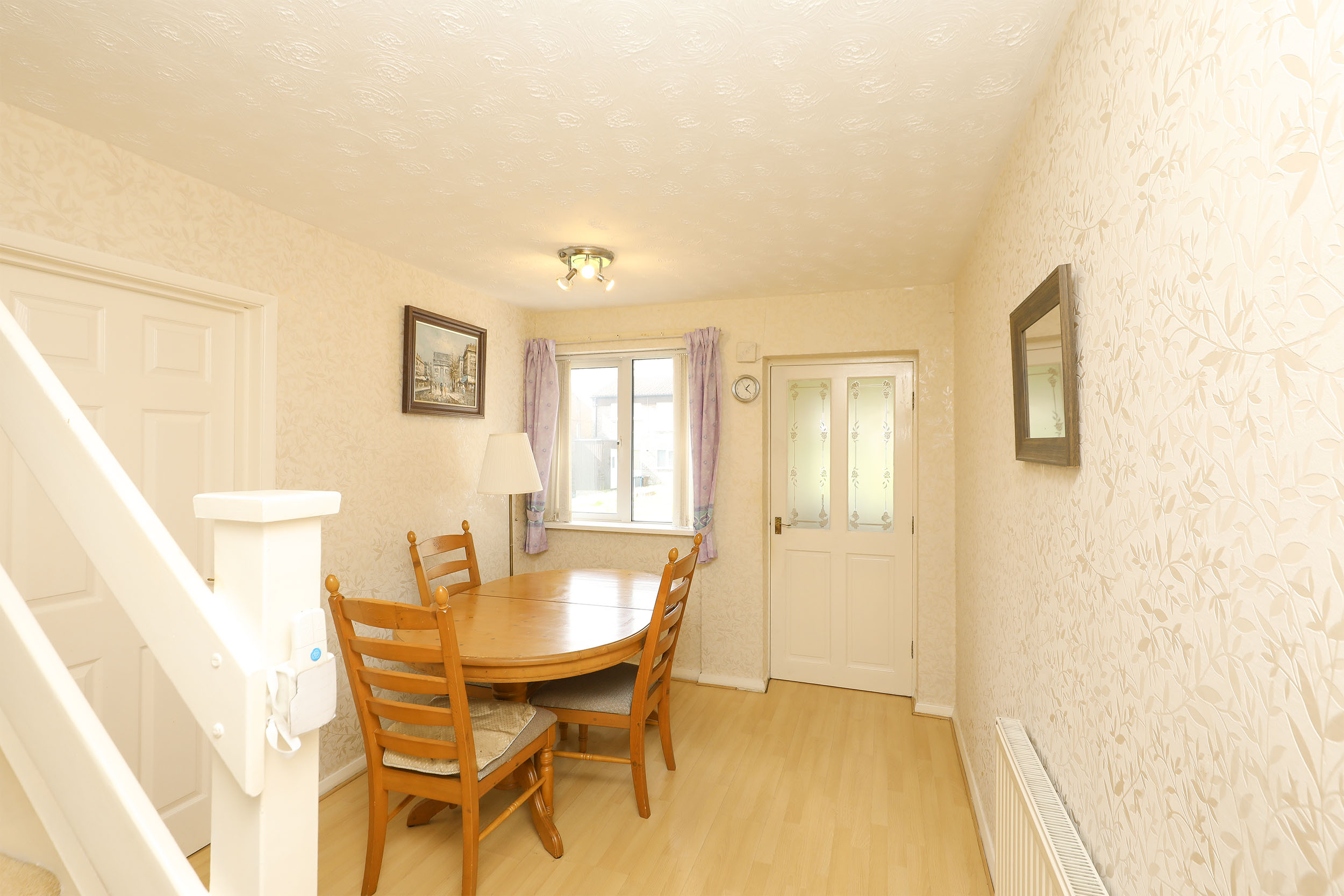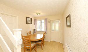 The ground-floor begins with an entrance porch, leading through to a light-filled and spacious dining room. An adjoining fitted kitchen provides a practical layout for everyday use, while a generously sized living room sits to the rear of the property, with doors opening into a conservatory overlooking the garden, creating an additional space to relax.
