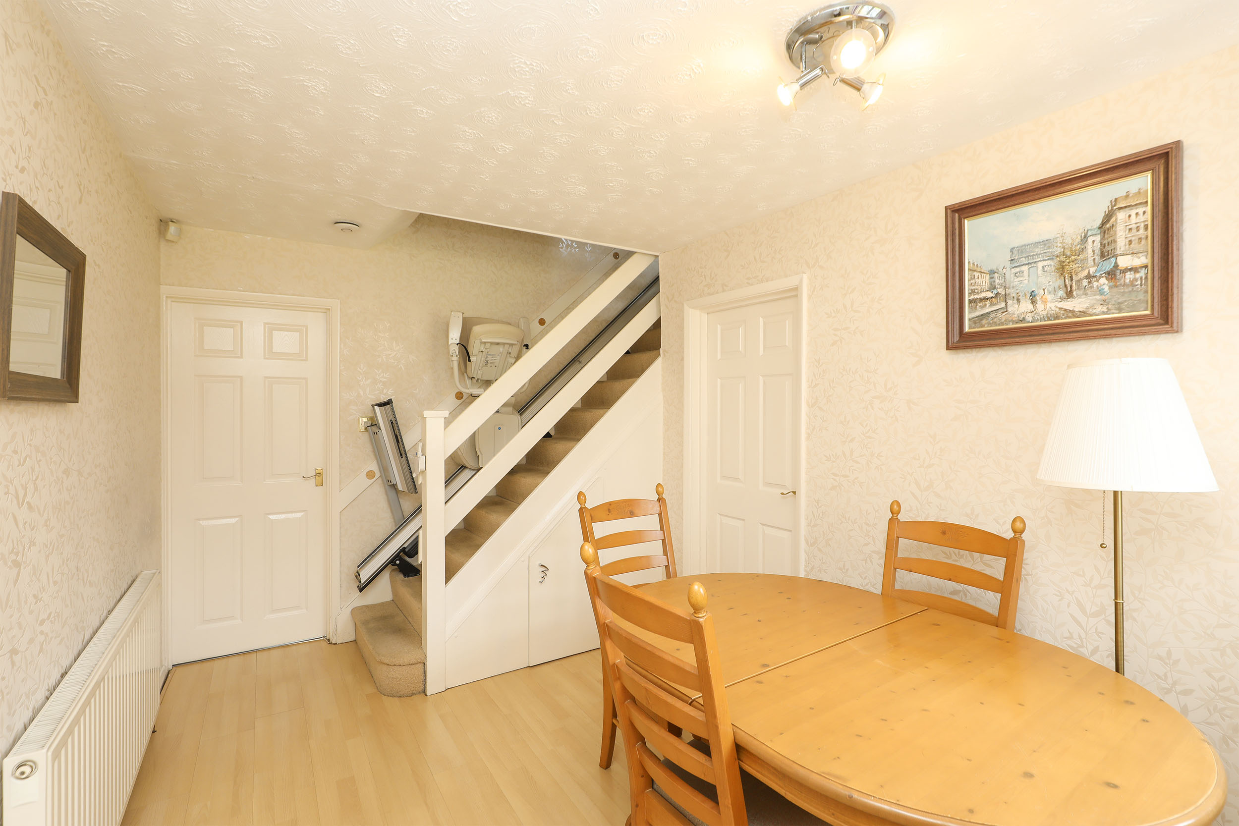 To the first floor are three well-proportioned bedrooms, comprising two doubles and a single, offering flexibility for a variety of needs. A modern fitted shower room with a three-piece suite accompanies the bedrooms, while the landing benefits from an excellent storage cupboard.