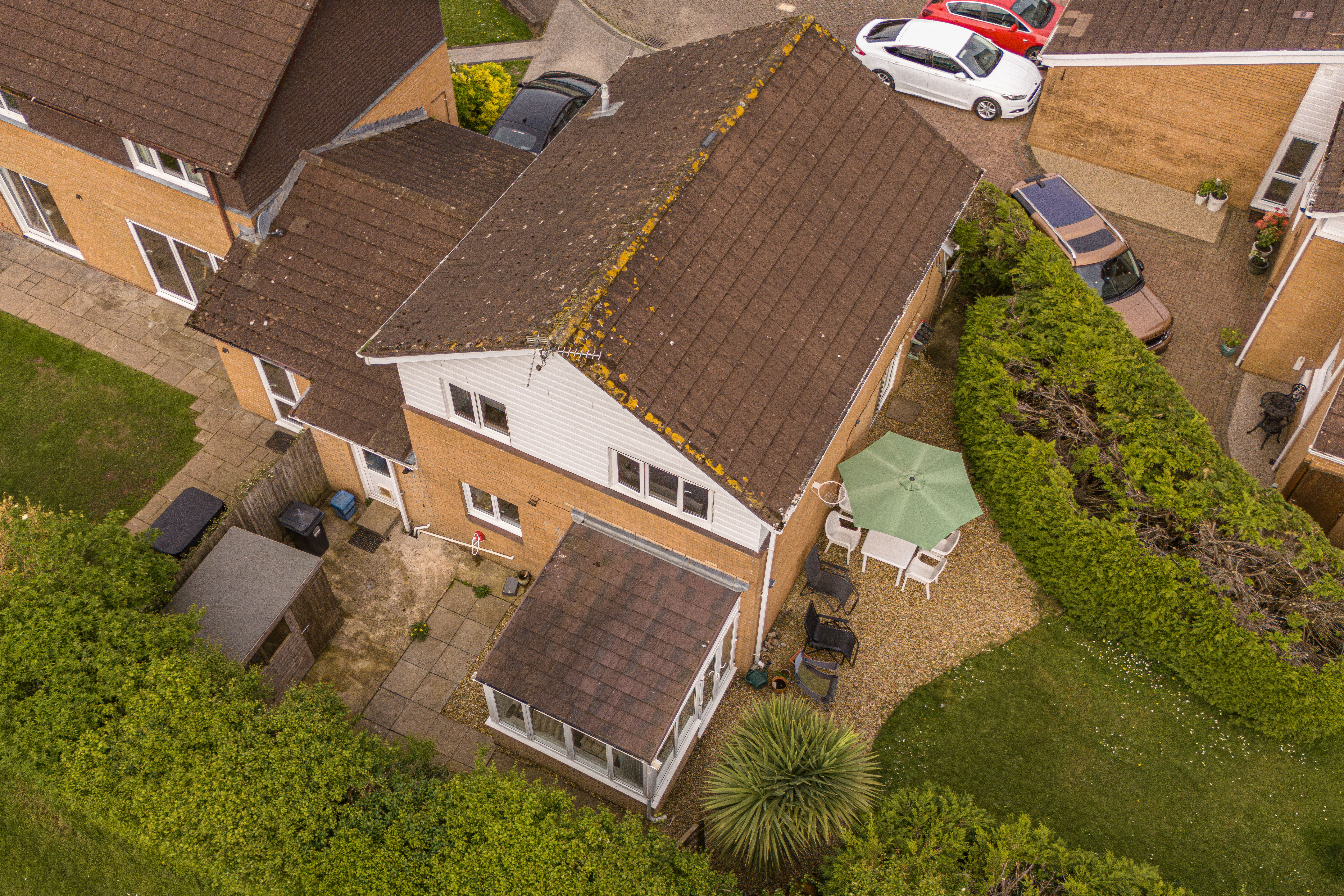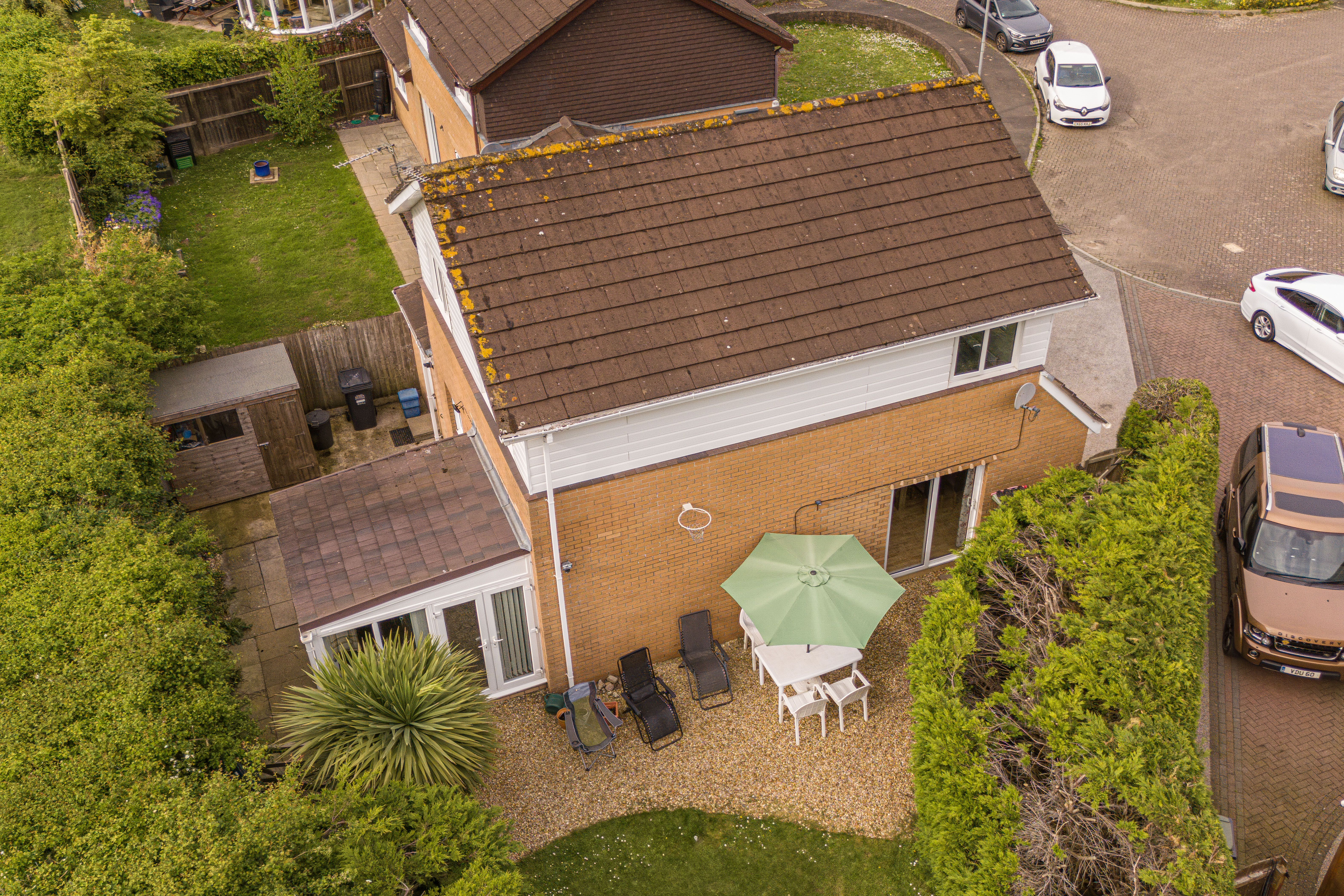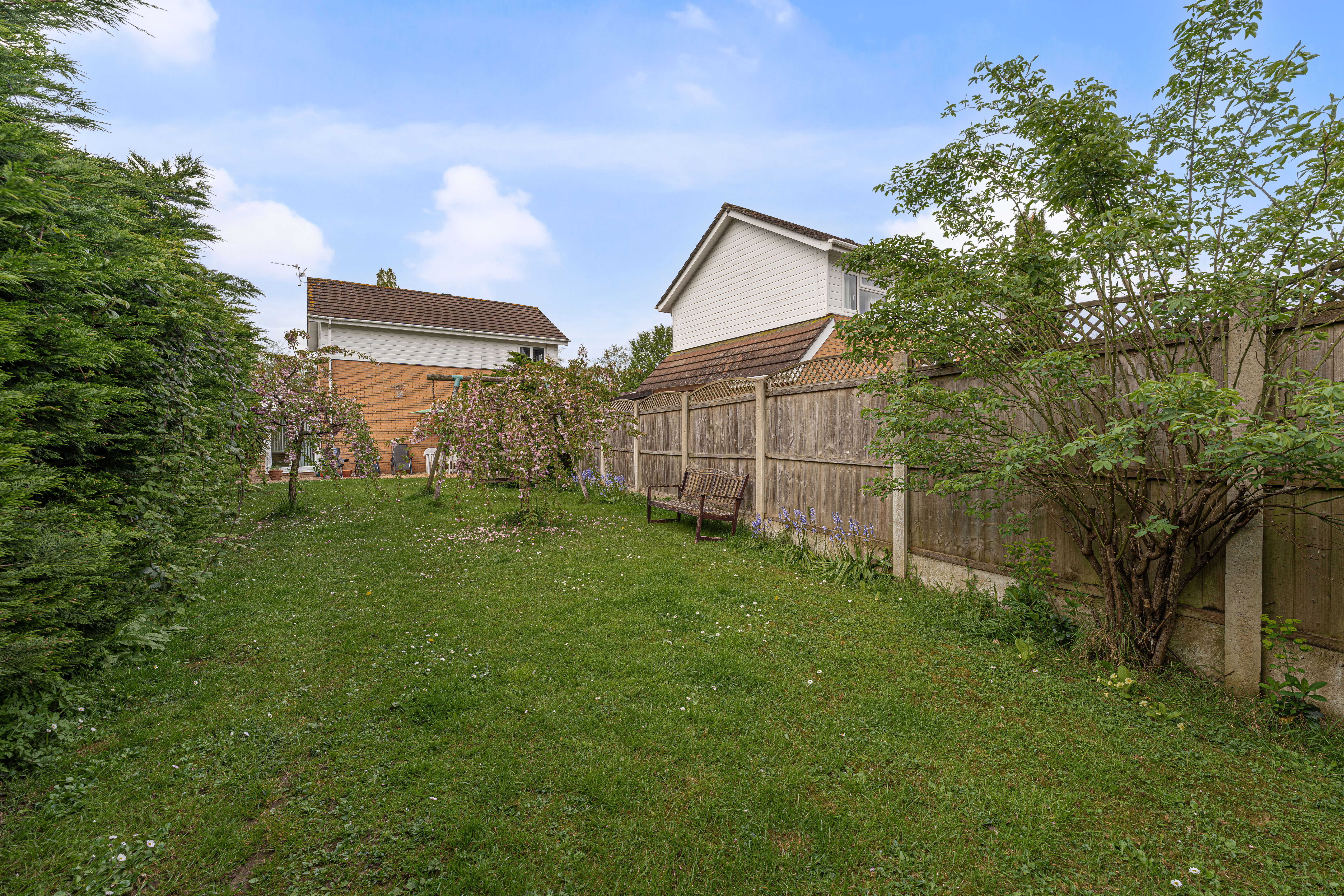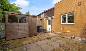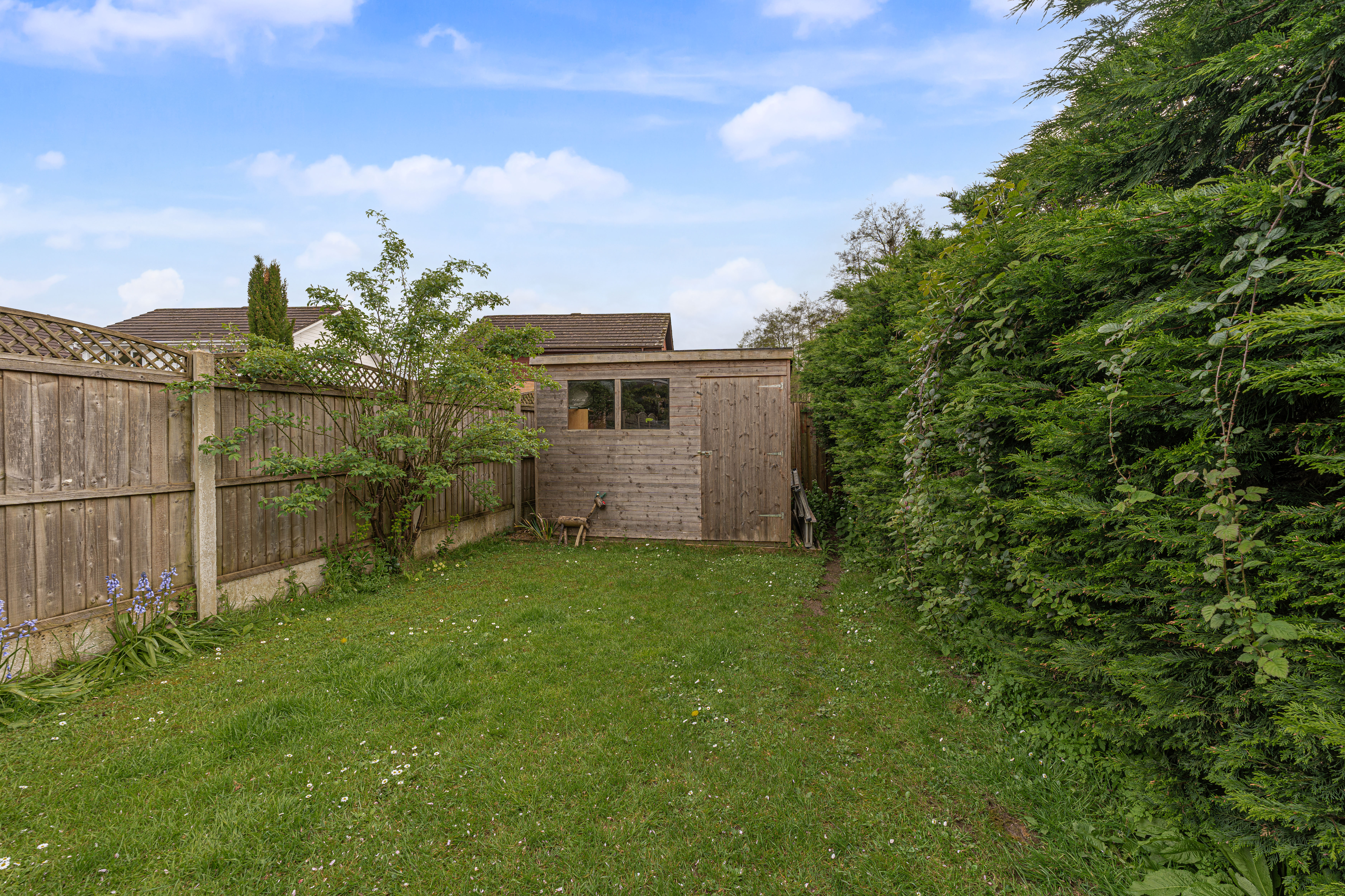 Externally, the property benefits from a private enclosed rear garden with lawn, patio areas, and mature planting, along with multiple storage sheds. To the front, there is a driveway providing off-road parking for 2–3 vehicles and access to the garage.