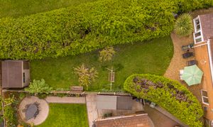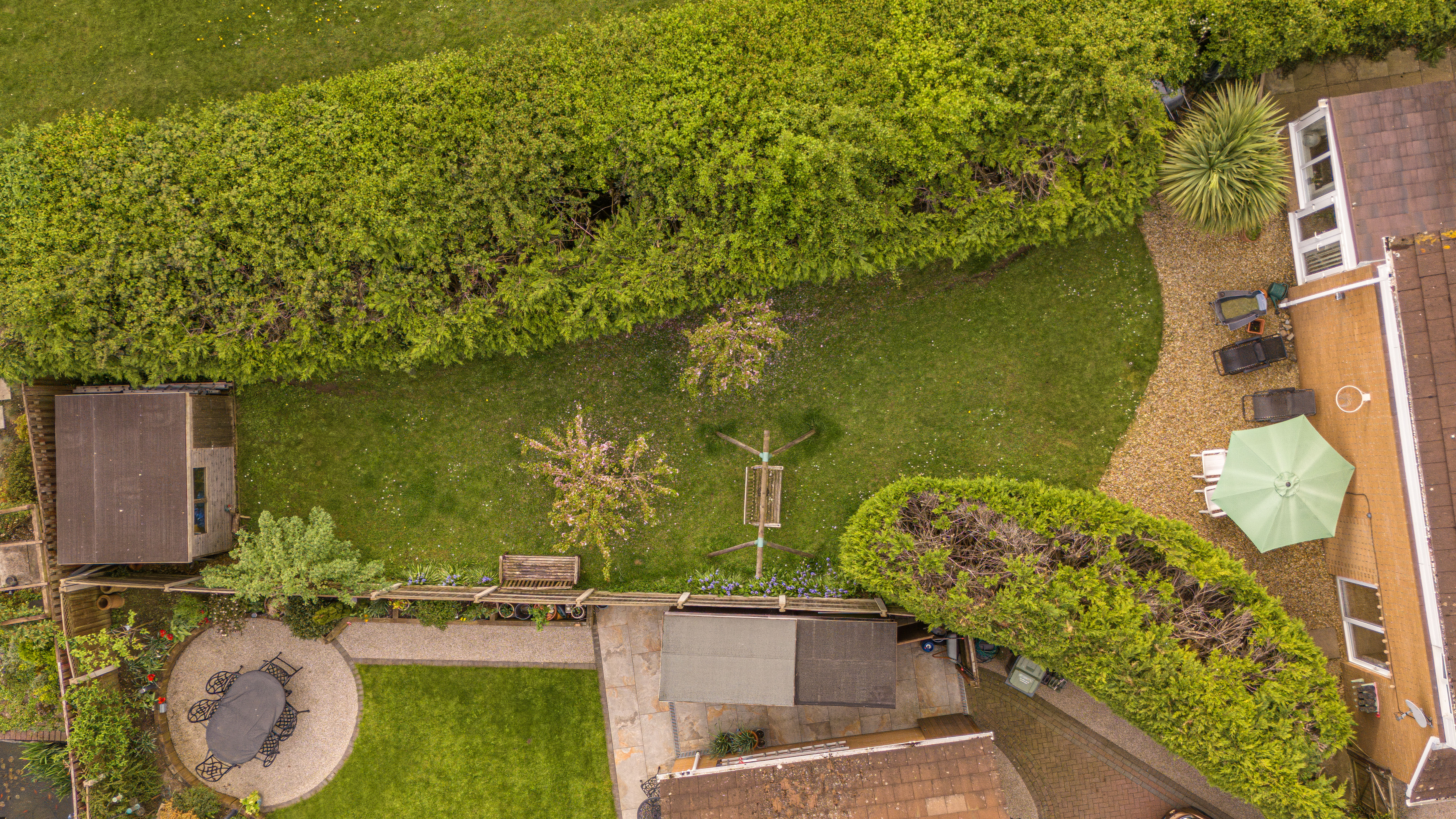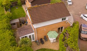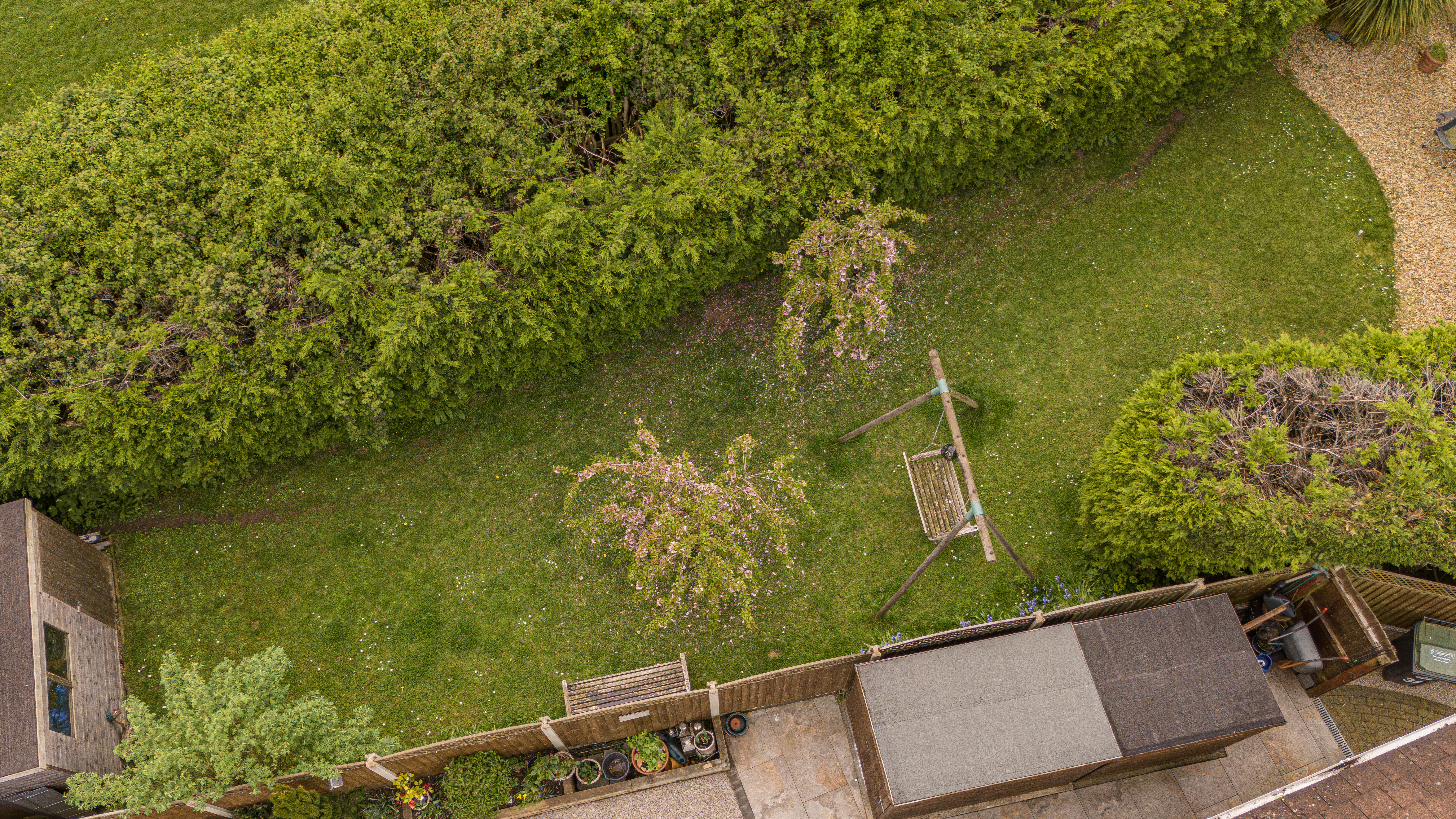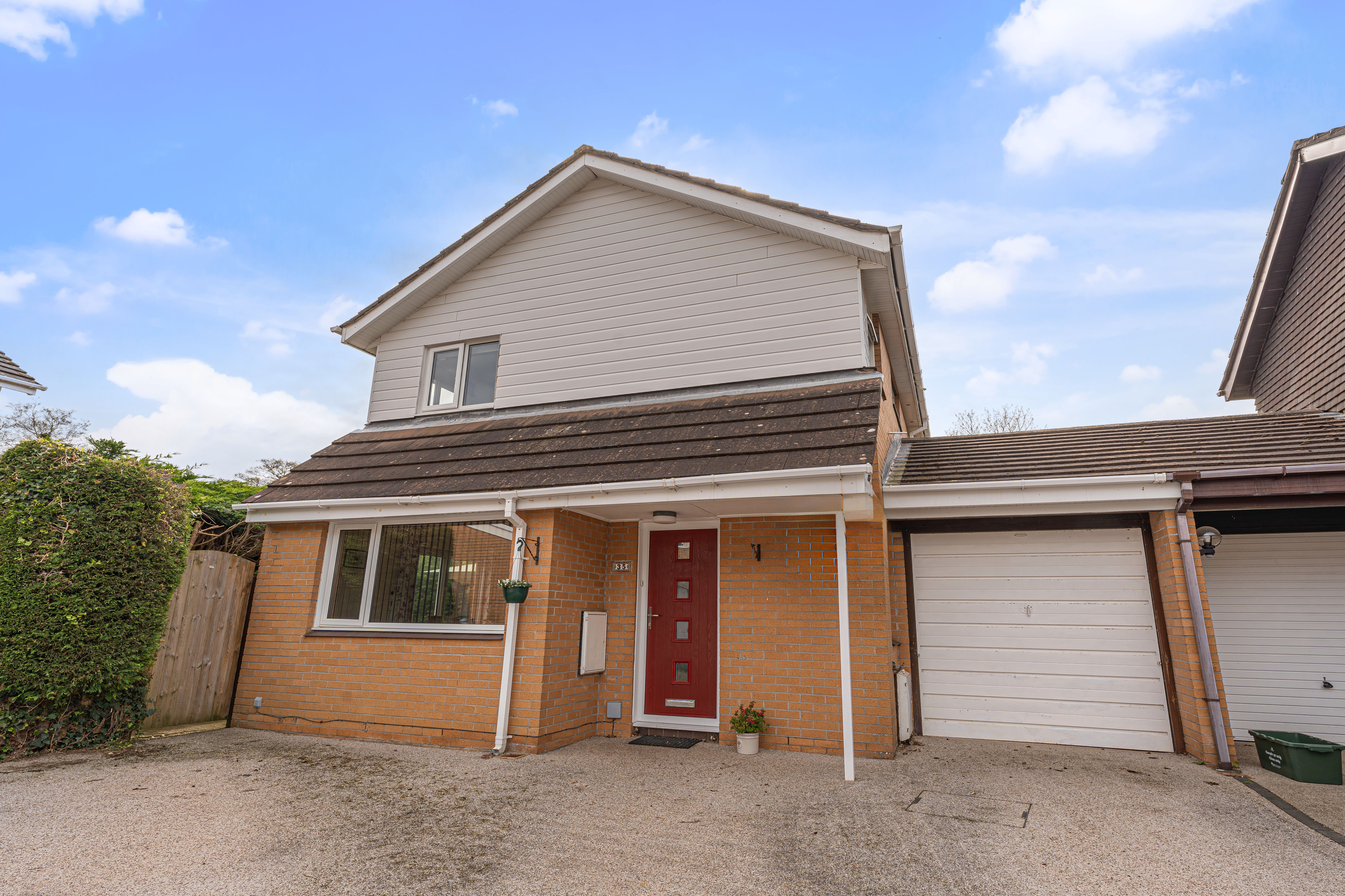 Externally, the property benefits from a private enclosed rear garden with lawn, patio areas, and mature planting, along with multiple storage sheds. To the front, there is a driveway providing off-road parking for 2–3 vehicles and access to the garage.