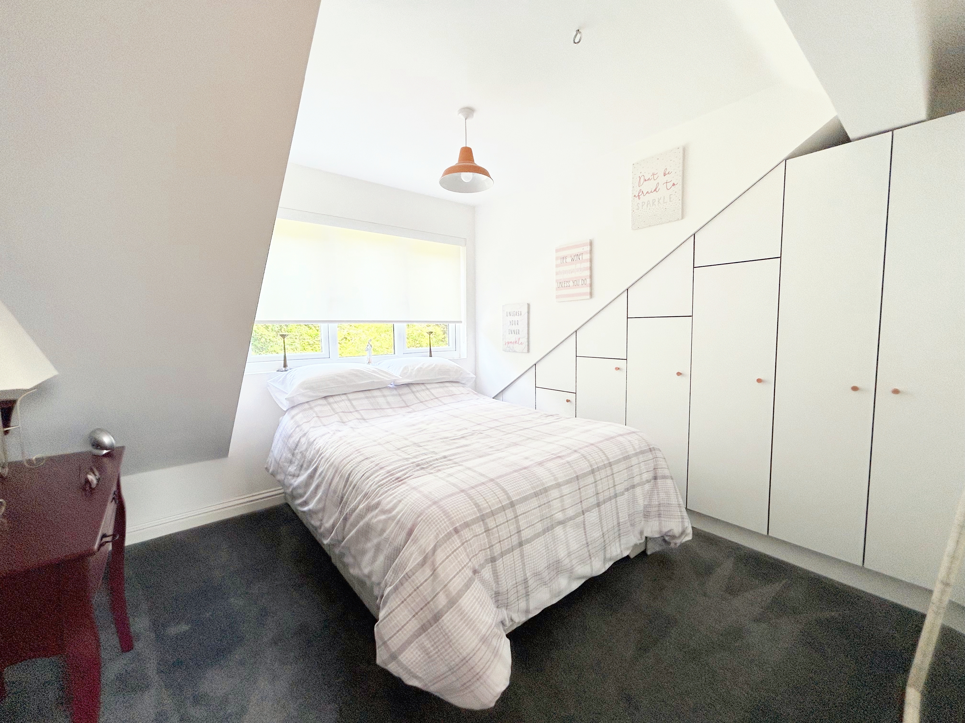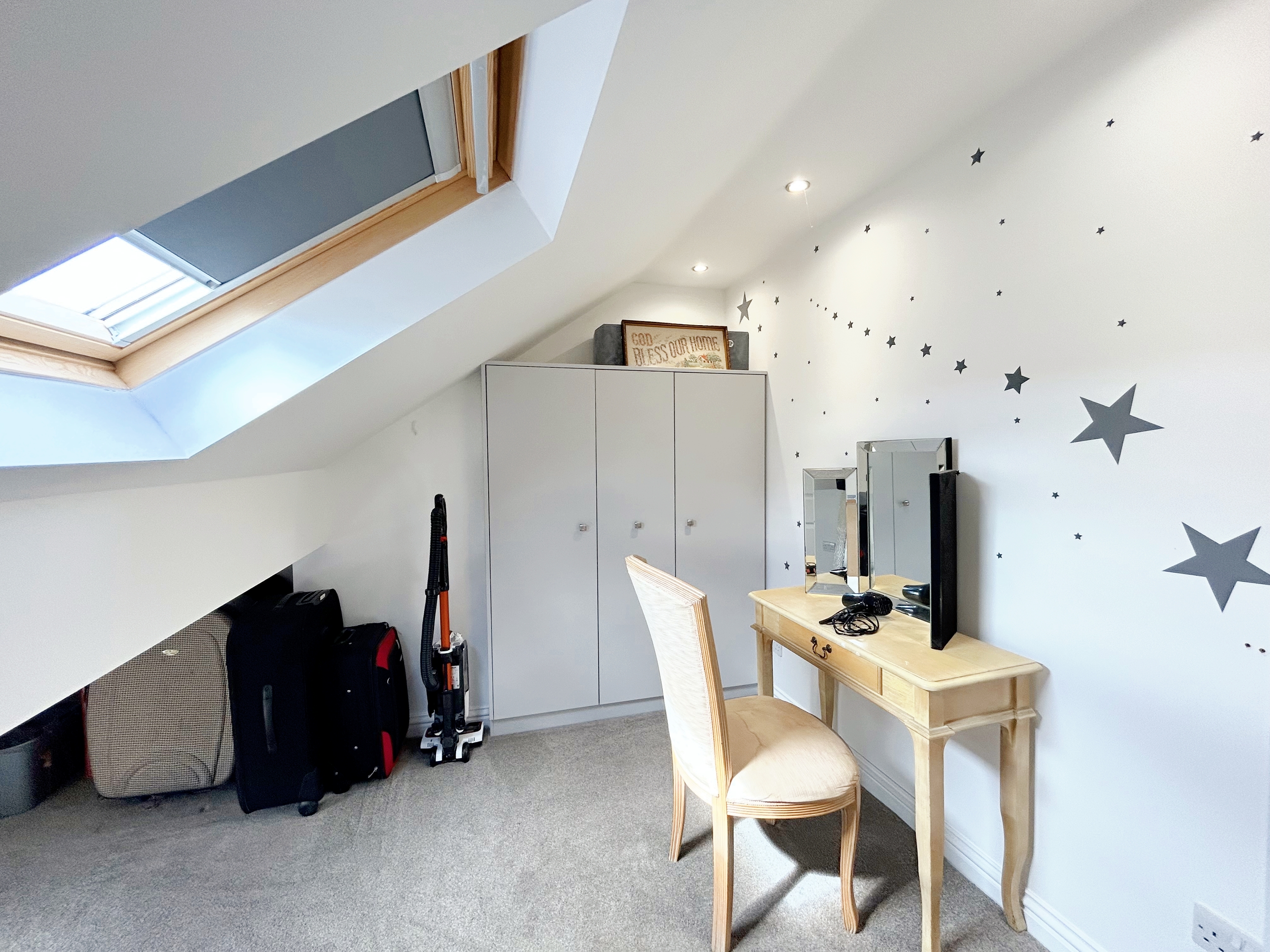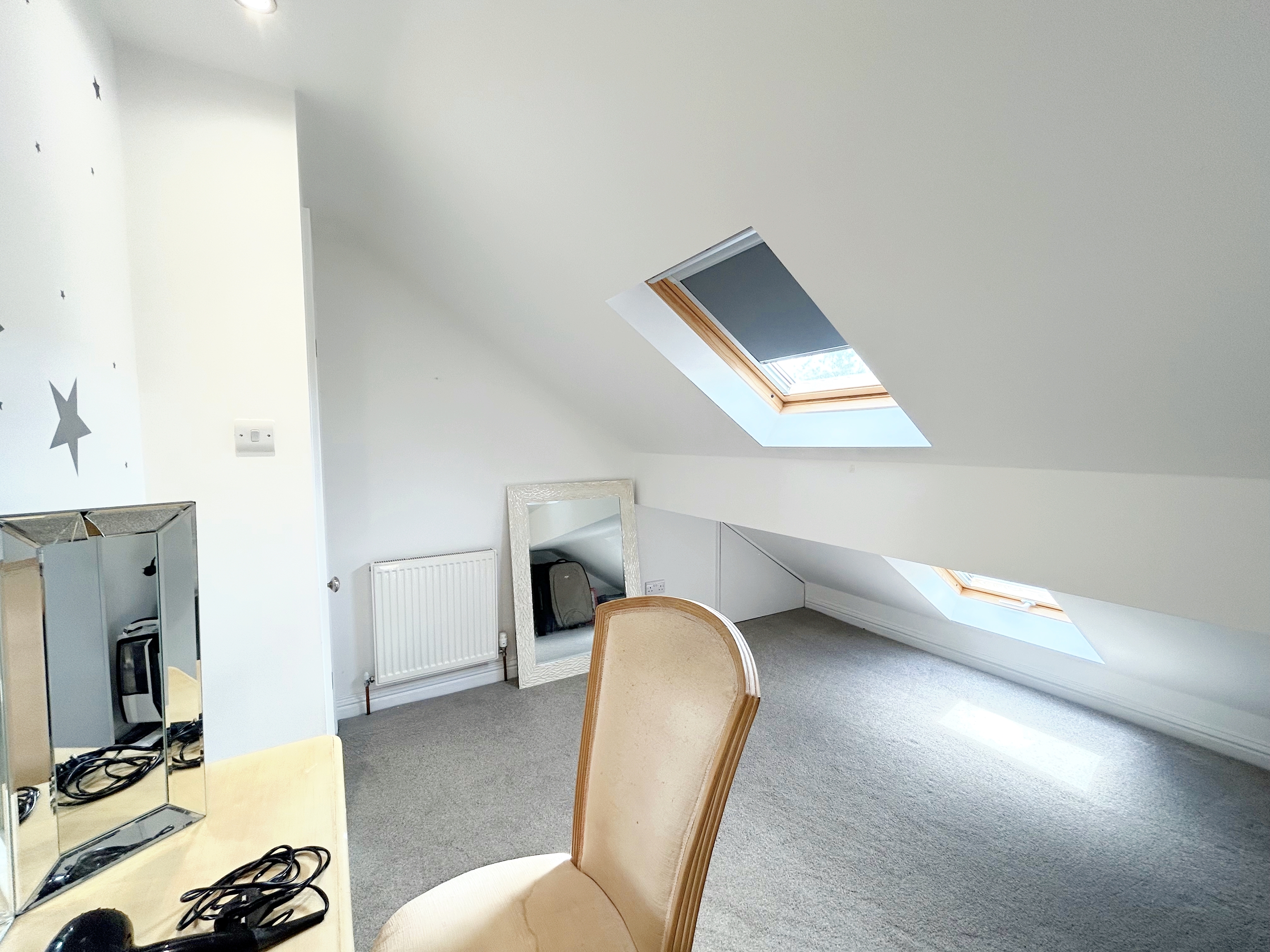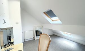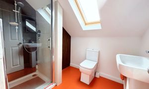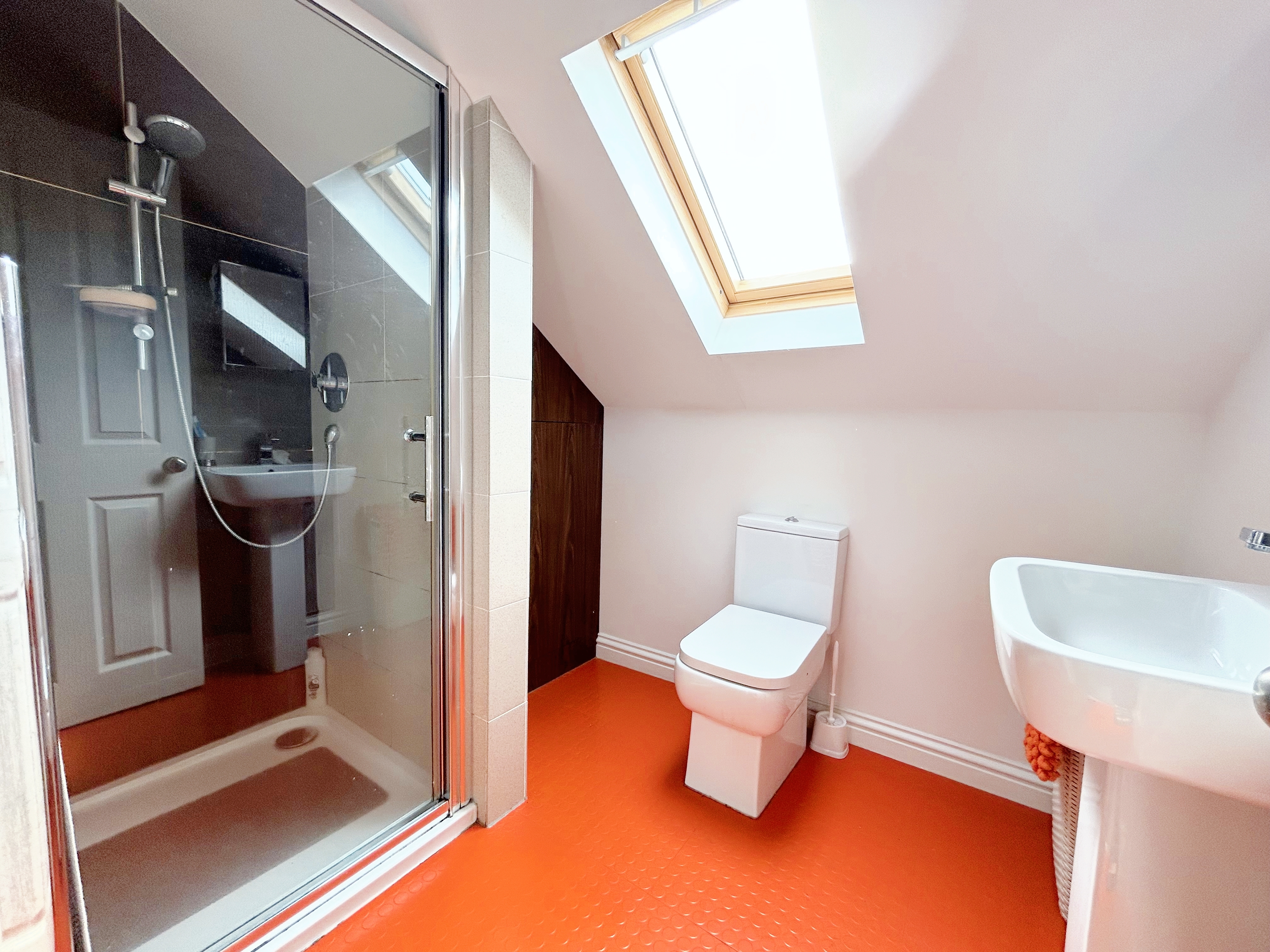 Fitted with a low level W.C, pedestal hand wash basin and shower cubicle. Velux window