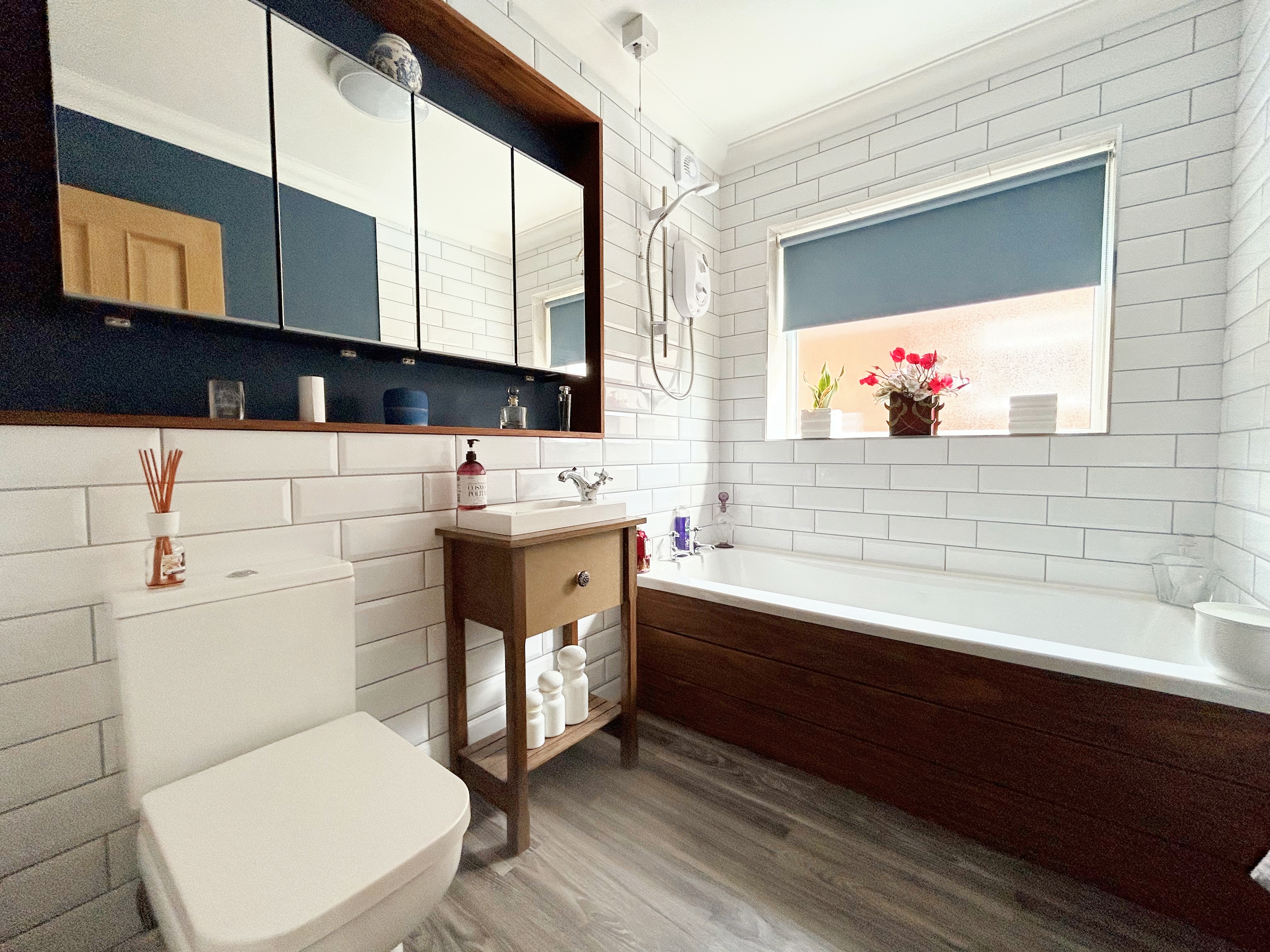 Window to the side elevation. Fitted with a low level W.C, pedestal hand wash basin and bath with shower over. Part tiled walls.
