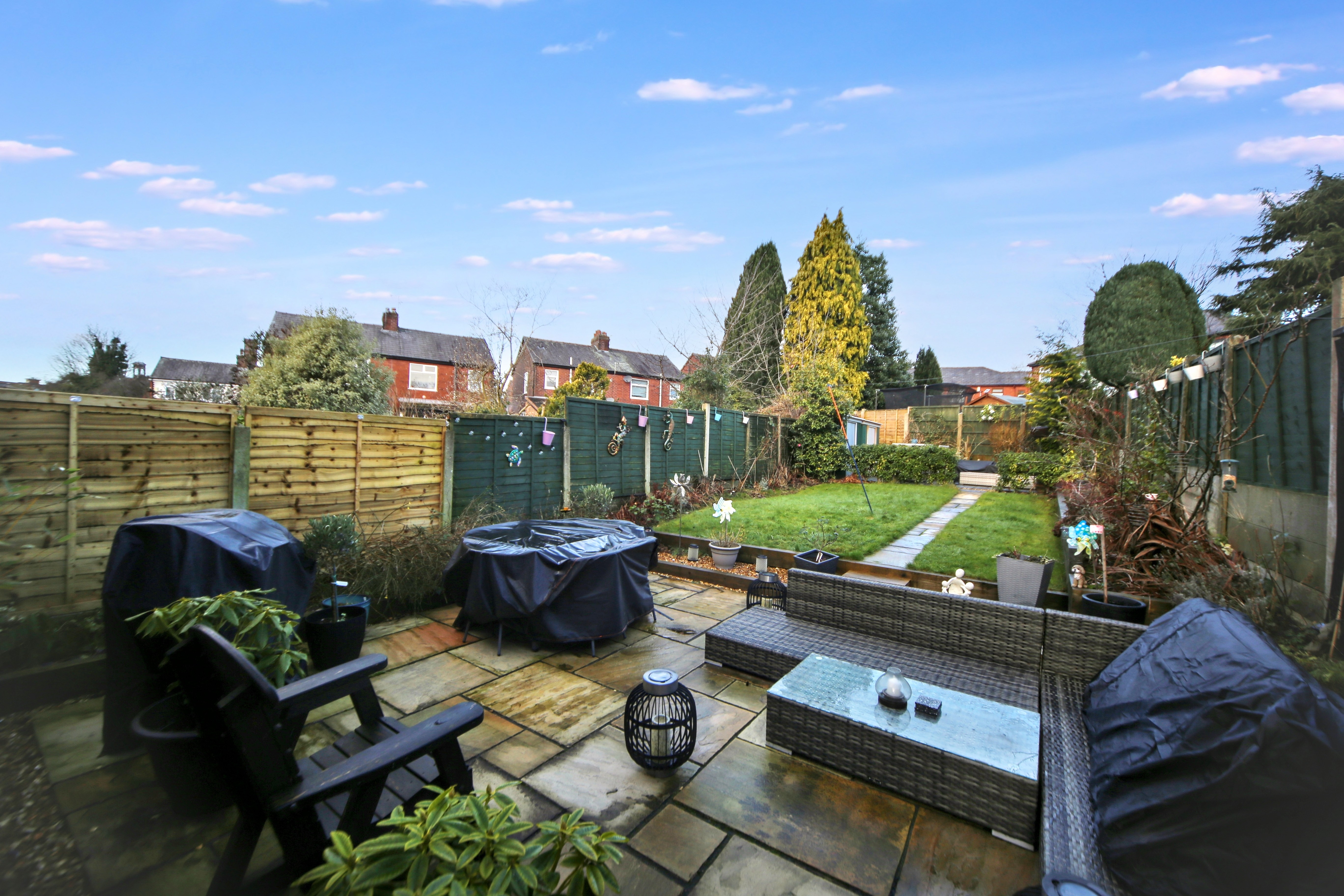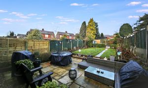 - Large rear garden with Indian stone patio lawn and further patio area