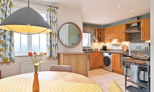 A bright, contemporary kitchen seamlessly connected to the open-plan dining and family space — perfect for modern living. This well-appointed kitchen features sleek, grey gloss cabinets paired with contrasting granite-effect worktops and stylish chrome handles. Two seperate ovens for large family gatherings and electric hob, integrated appliances, and a modern extractor hood complete the functional yet stylish setup. A large interior window opens the space to the adjoining reception room, allowing light to flow through and enhancing the sense of connectivity. The adjacent dining area comfortably accommodates a full-size dining table, ideal for entertaining or relaxed family meals. Warm-toned flooring runs throughout, complementing the neutral decor and tying the spaces together beautifully.