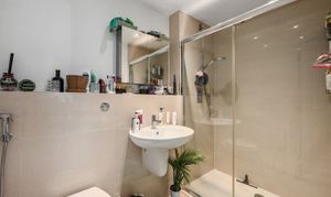 Low level wc, wash hand basin with mixer tap, walk in shower cubicle, partially tiled walls, towel radiator.