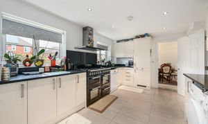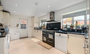 Range of white gloss fronted cupboards and drawers beneath worksurfaces and additional wall mounted units. 2 windows to rear with personal door leading to garden. Space for freestanding range cooker with extractor over, space and plumbing for dishwasher and washing machine, built in eye level oven, cupboard housing wall mounted boiler, sink with mixer tap, integrated fridge/freezer, inset spotlights.