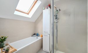 White suite comprising low level wc, wash hand basin, panelled bath with mixer tap, tiled shower cubicle, Velux window to rear, heated towel radiator, locally tiled walls.