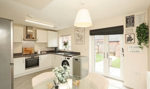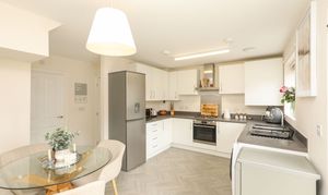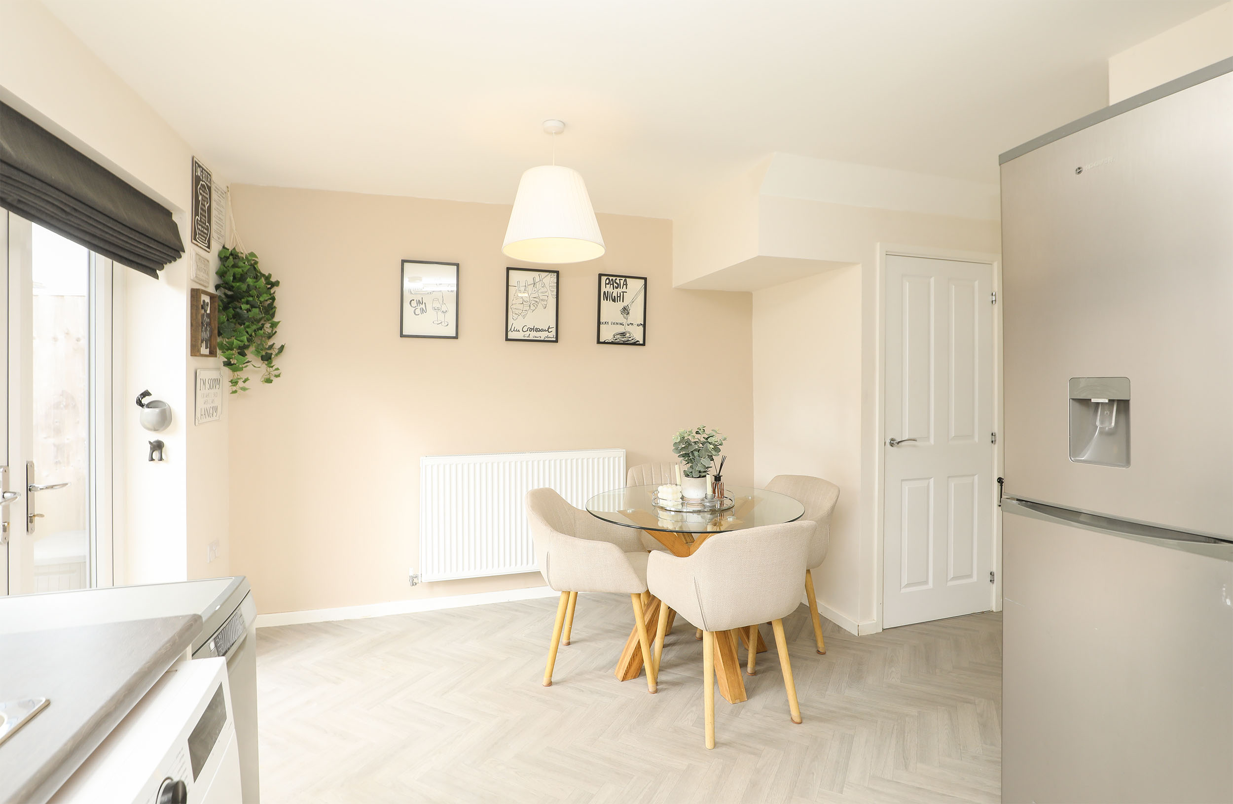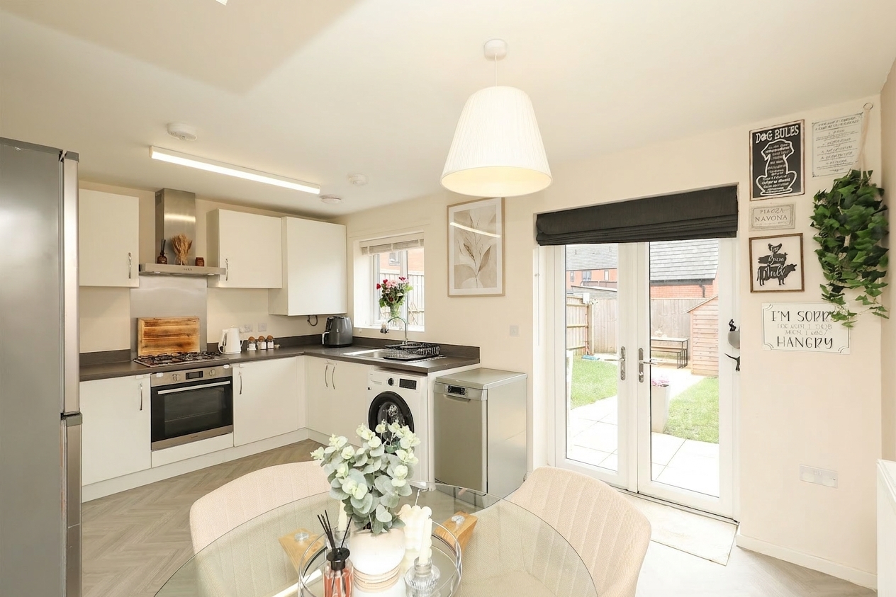 The ground floor includes a spacious open-plan kitchen and dining area, providing a practical layout for everyday living and entertaining. The kitchen is fitted with contemporary units and offers ample worktop space, while the dining area benefits from doors opening directly onto the rear garden.