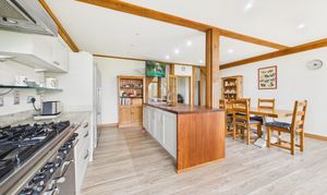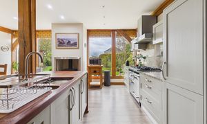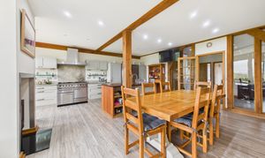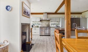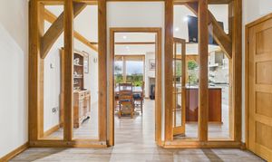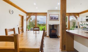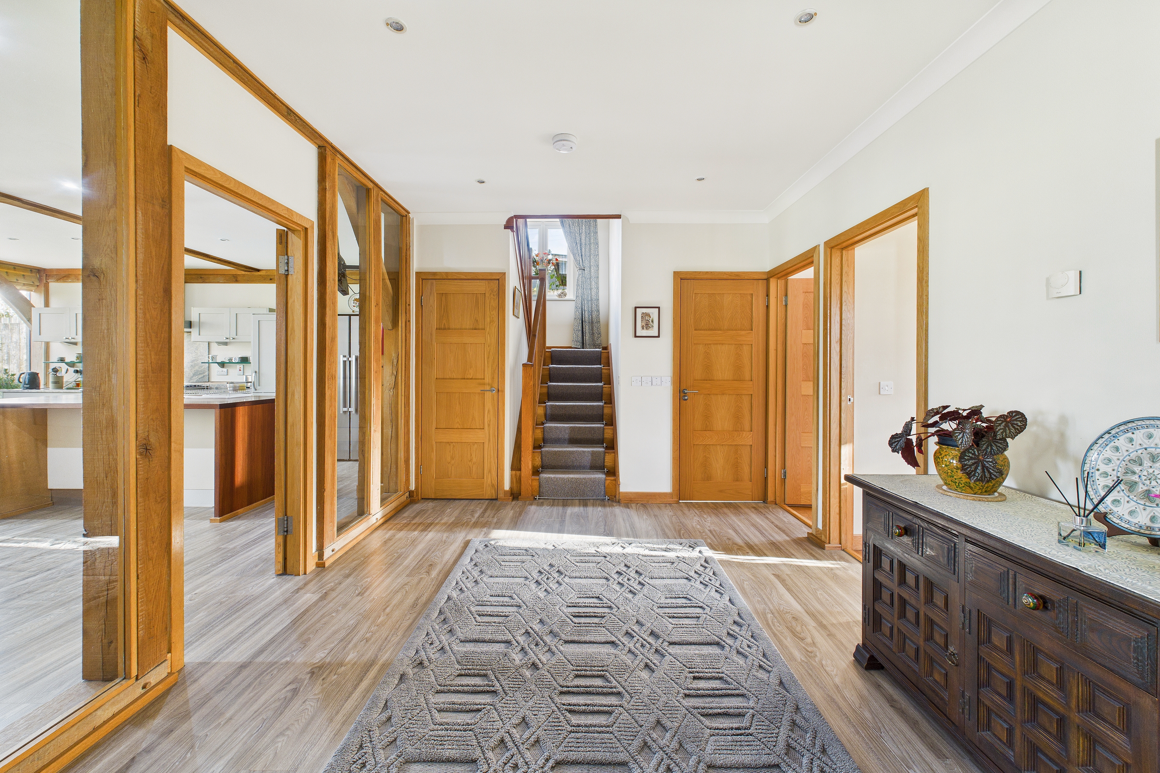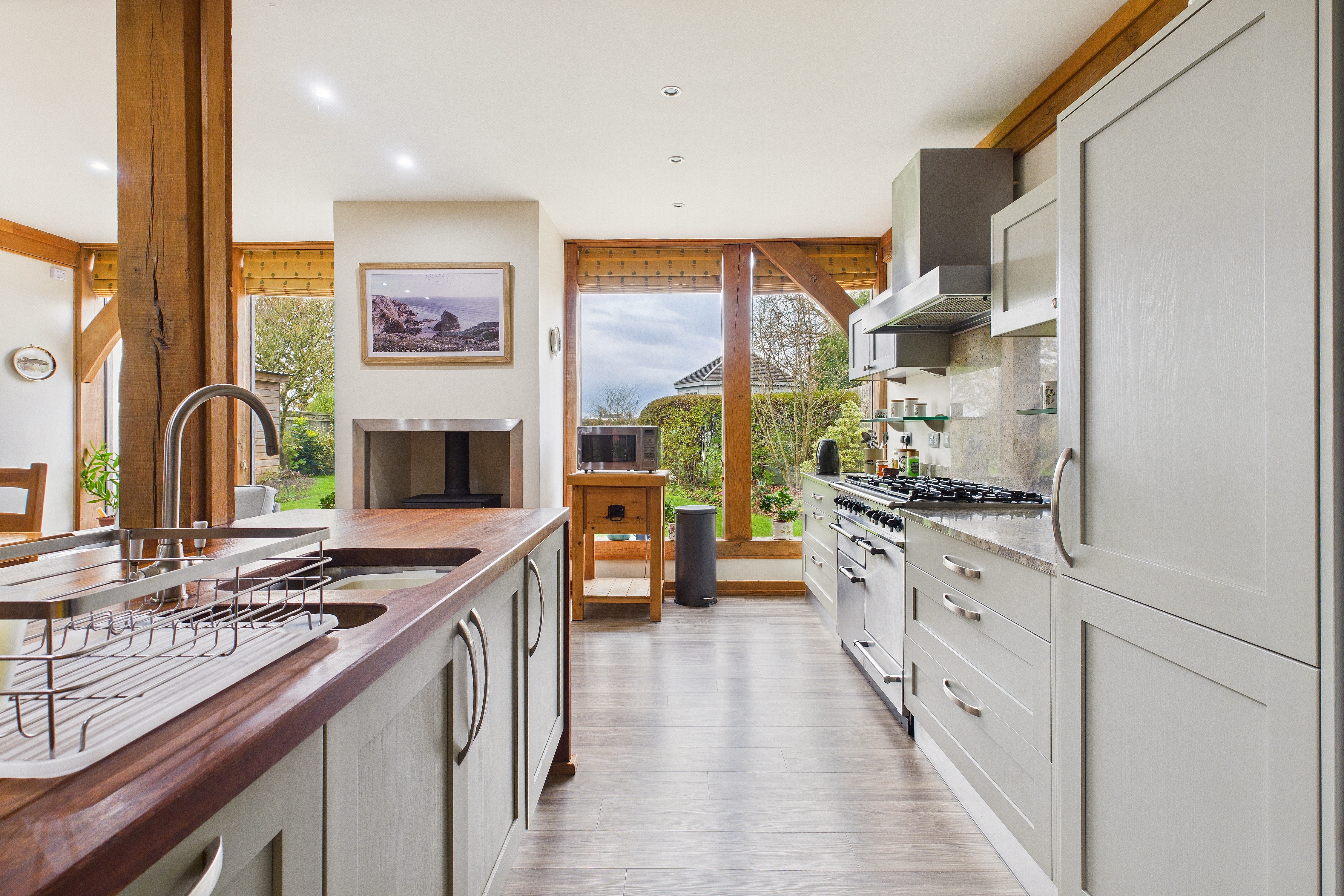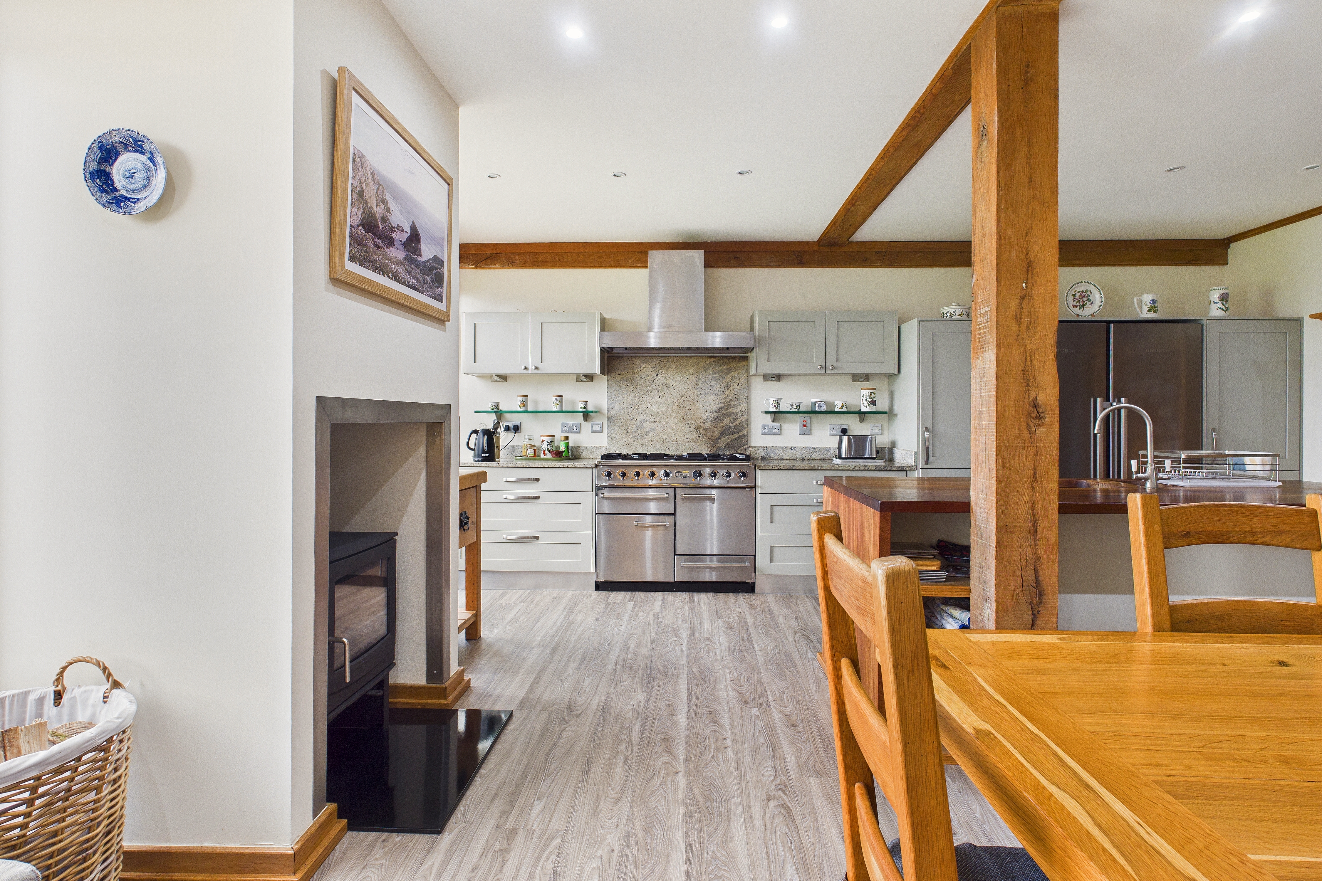 The house has a welcoming entrance hall with exposed oak framing giving it a unique appeal, there’s full height glass panels and a turning oak staircase too. The kitchen and dining room stretch across the back of the property, looking out over the garden and the countryside beyond. It is a great family space with a bespoke fitted kitchen, granite worktops, a Falcon range cooker, an island with hardwood surface and a wood-burner. Two ground floor double bedrooms and a bathroom sit off the hallway, making this level versatile for guests or family living.