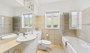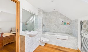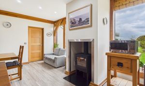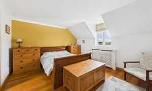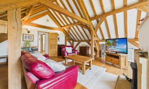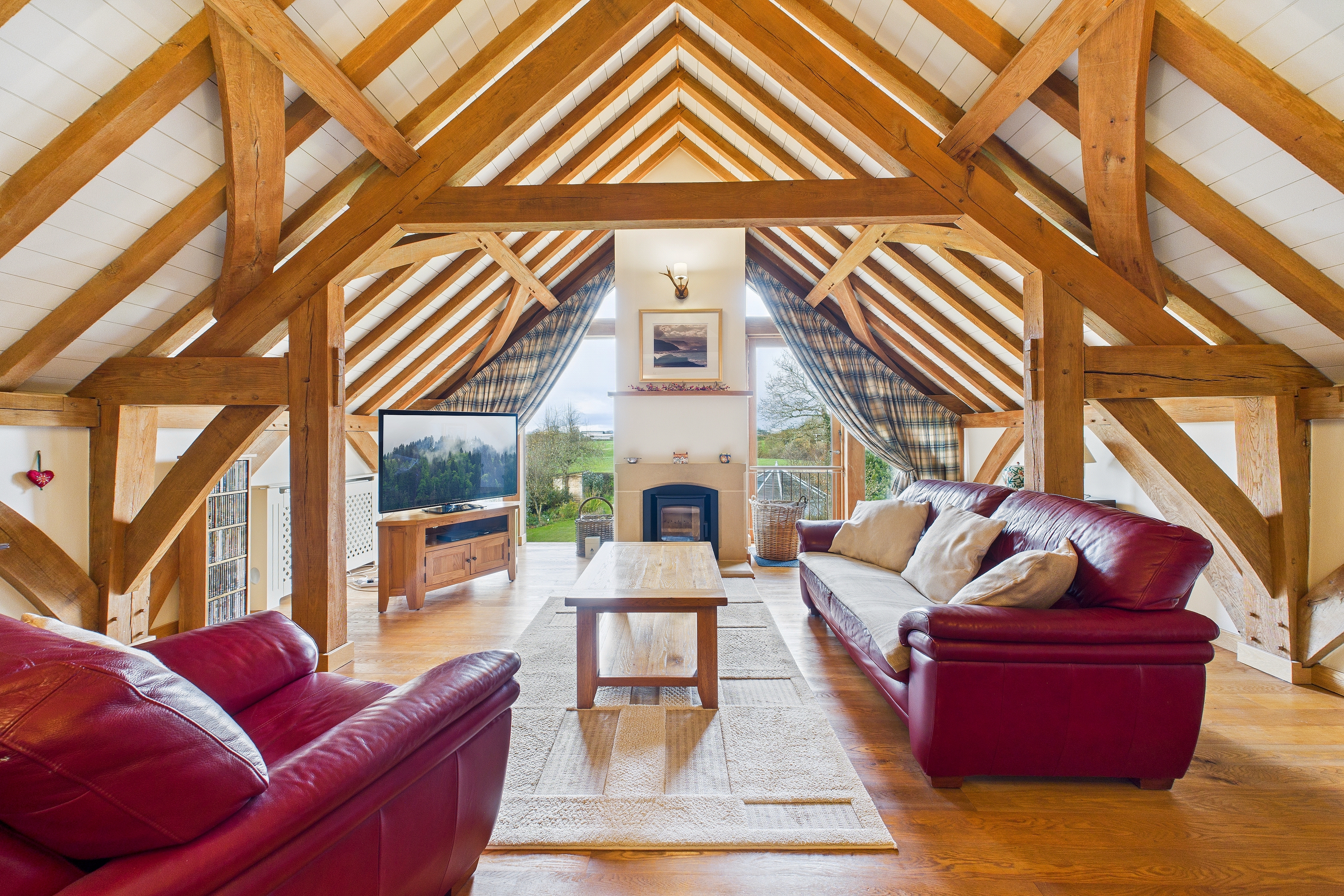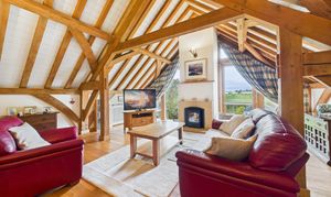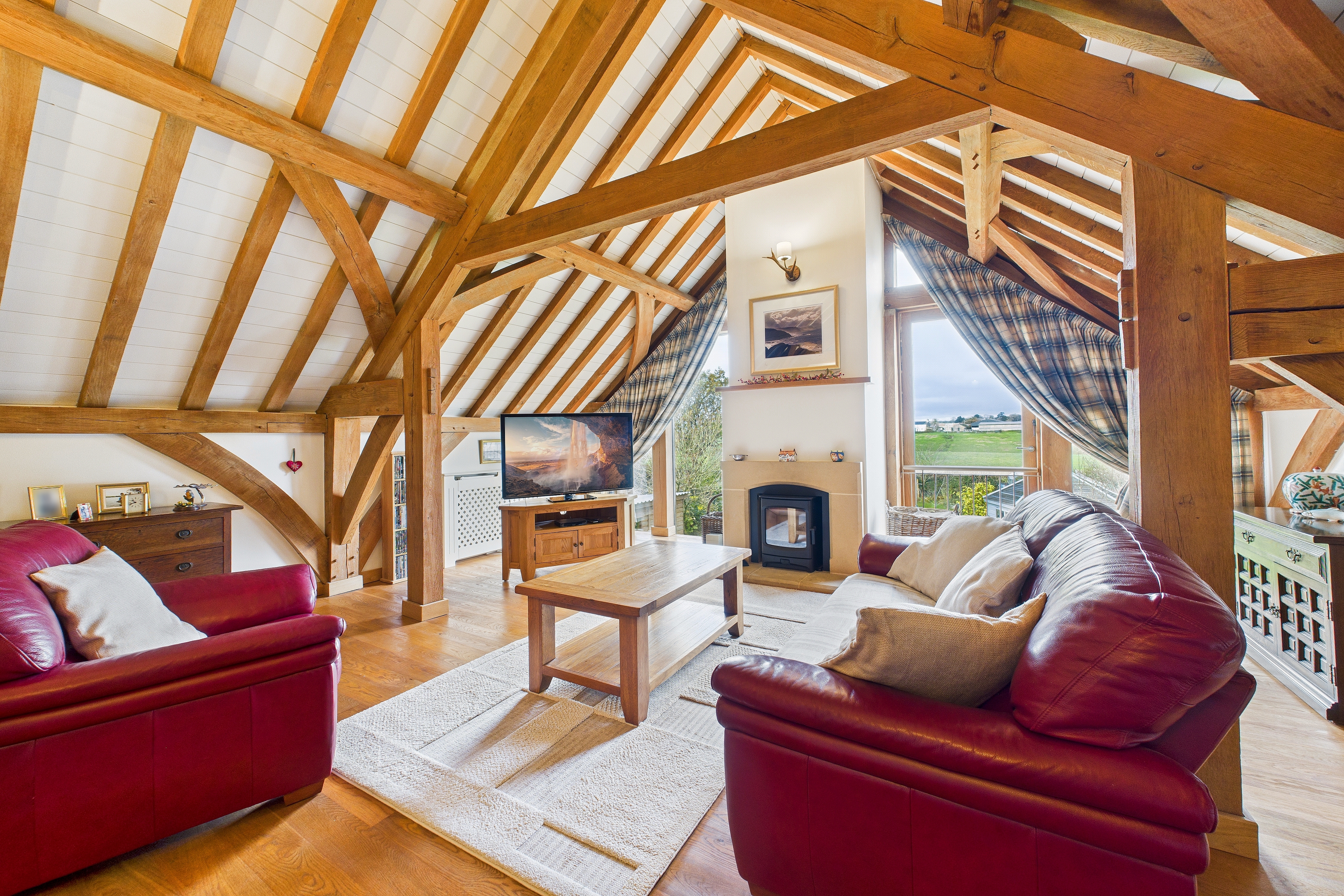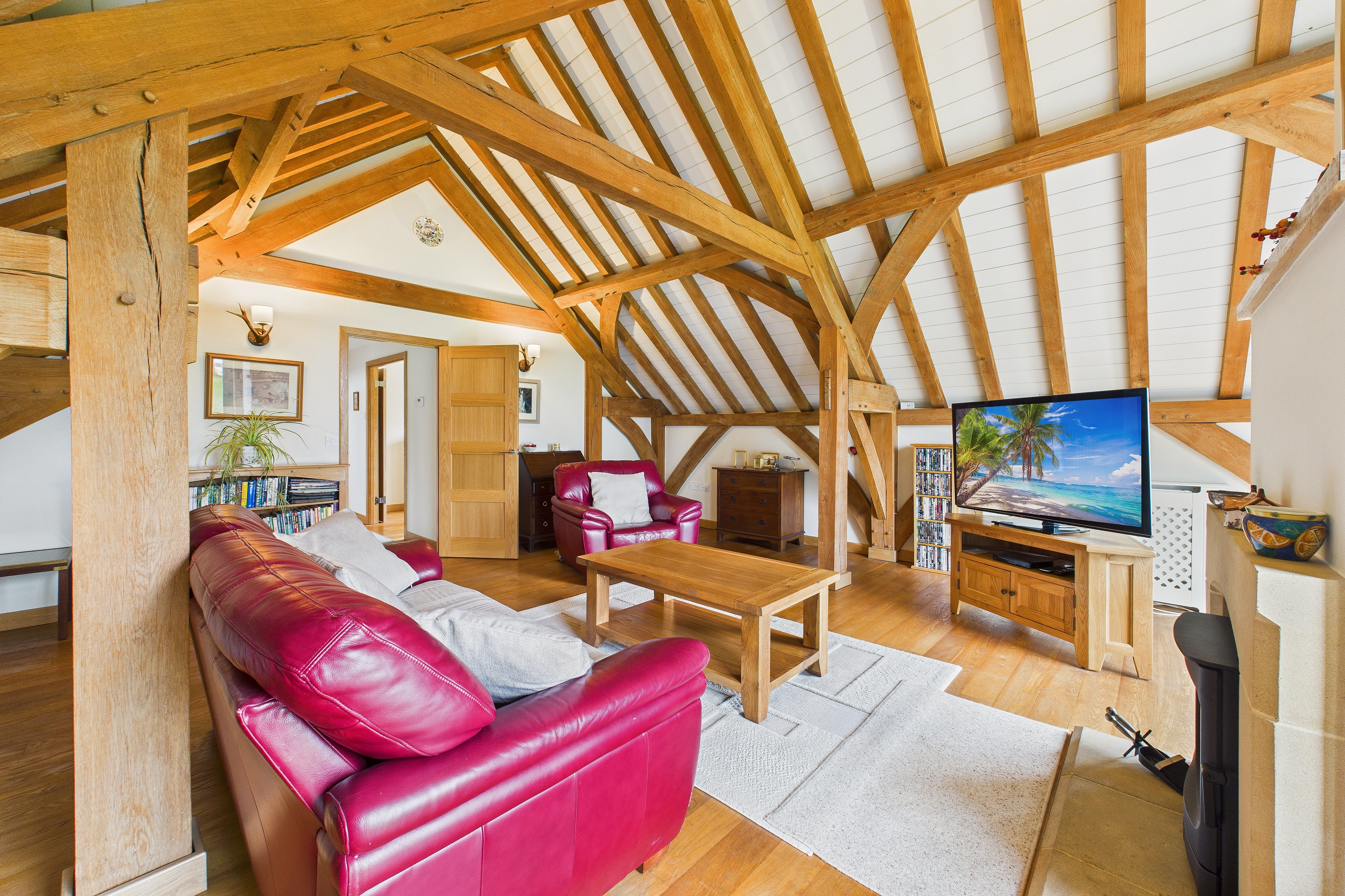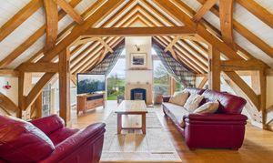 Upstairs, the sitting room is a superb feature, with exposed oak framing and full height windows that make the most of the countryside views plus another wood-burner to add to the character and warmth. There is a study or fourth bedroom, a guest WC and a generous main bedroom suite with ensuite bathroom and walk-in wardrobe.
