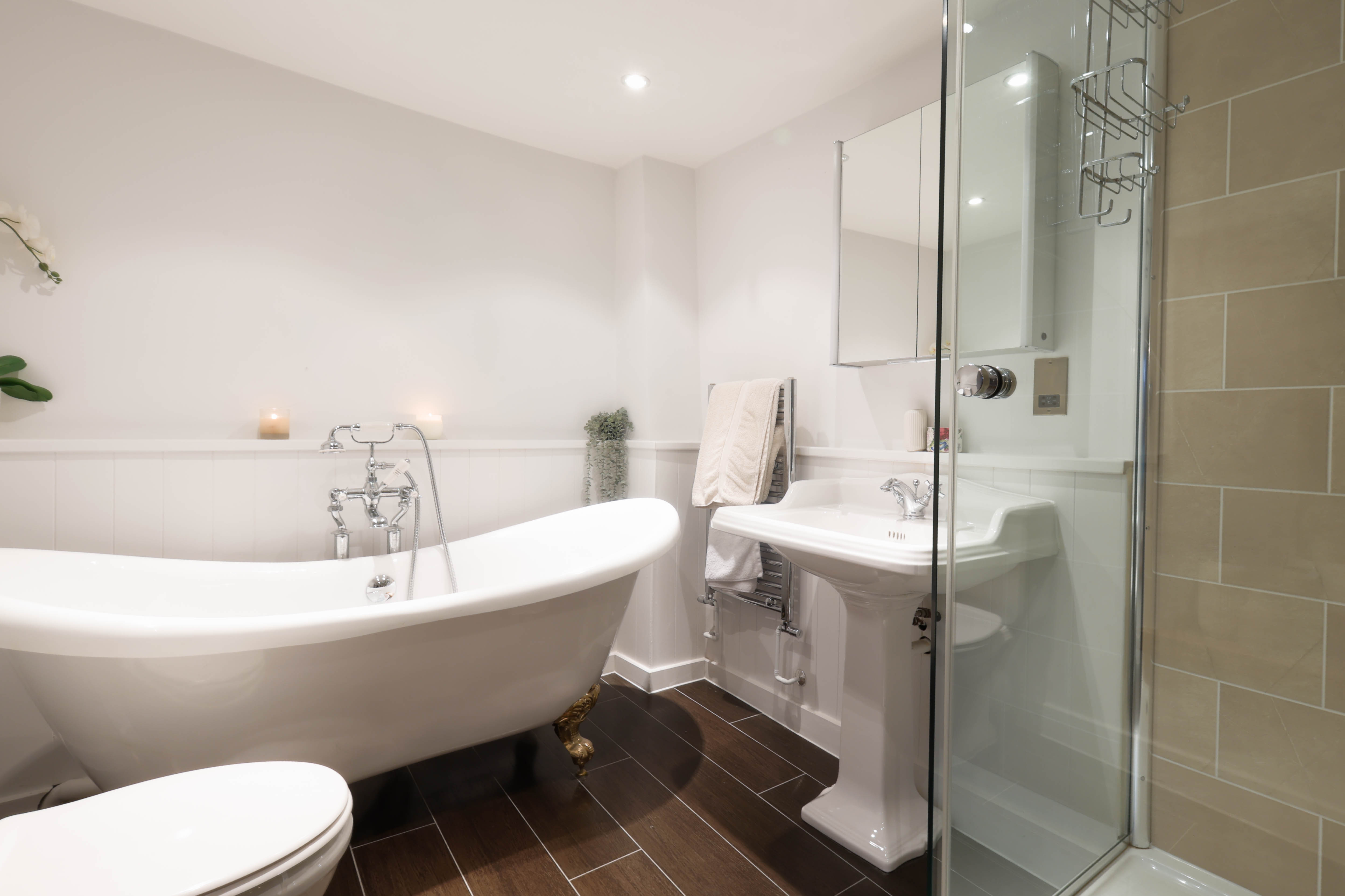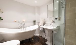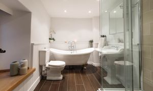 - Luxurious four-piece family bathroom featuring a stunning freestanding bath