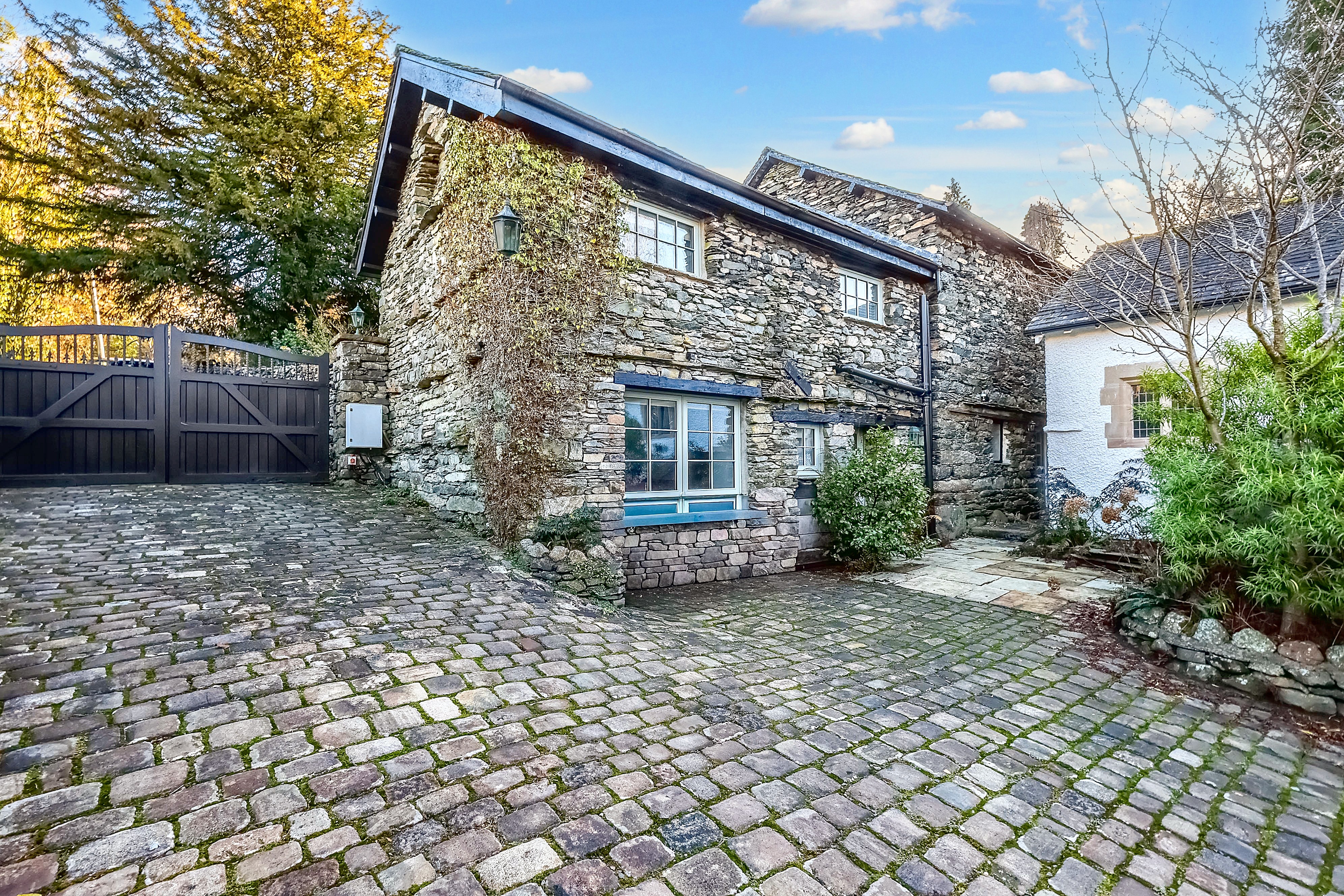 Externally, the cottage sits within beautiful private wraparound gardens, featuring lawns, patio areas and mature shrubs, creating multiple places to relax and enjoy the peaceful surroundings with the added bonus of a gate at the bottom of the garden leading direct to the marina. The property is approached through an electric, password protected gated entrance and offers extensive driveway parking for several vehicles. This exceptional home combines character, quality and incredible location in the very heart of the Lake District.